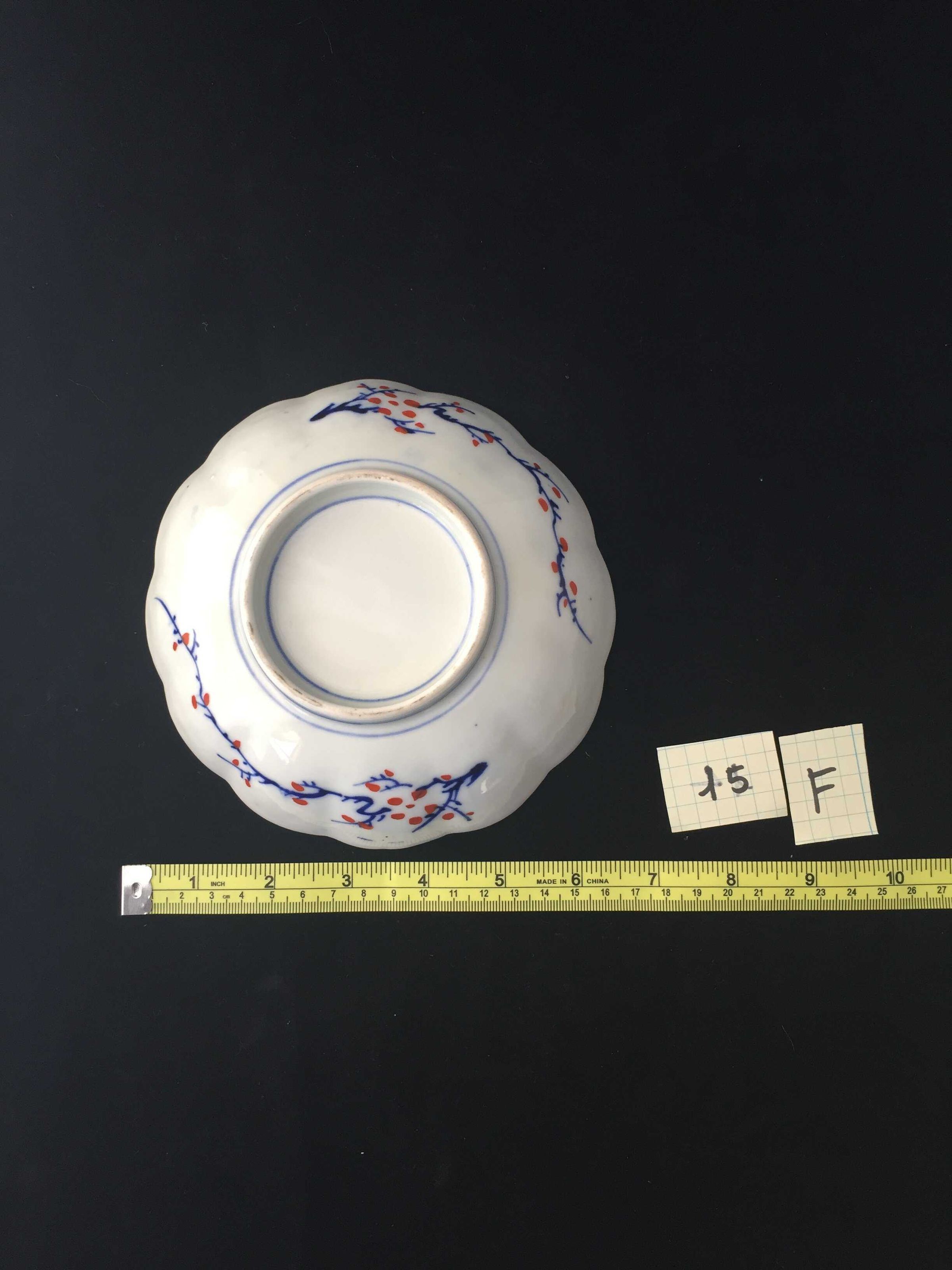 Blue, green and red floral design on face, blue and red floral design on base, scalloped rim, stoneware