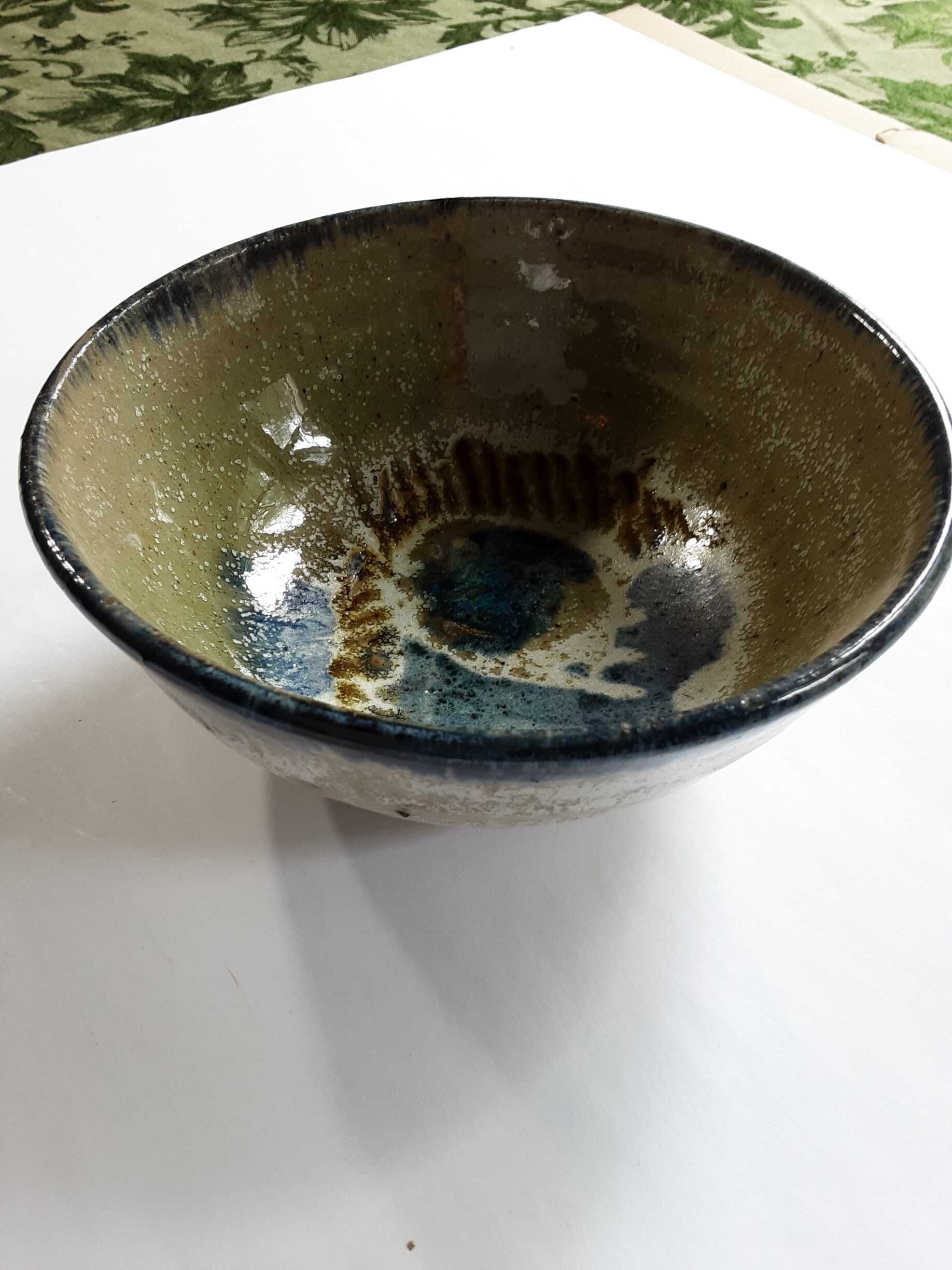 Glazed ceramic bowl in light olive with abstract blue, brown and cream in the center. Two blue concentric bands on the outside. Bottom is a cream background with more olive green and one more blue circle in the bottom center.Create Date