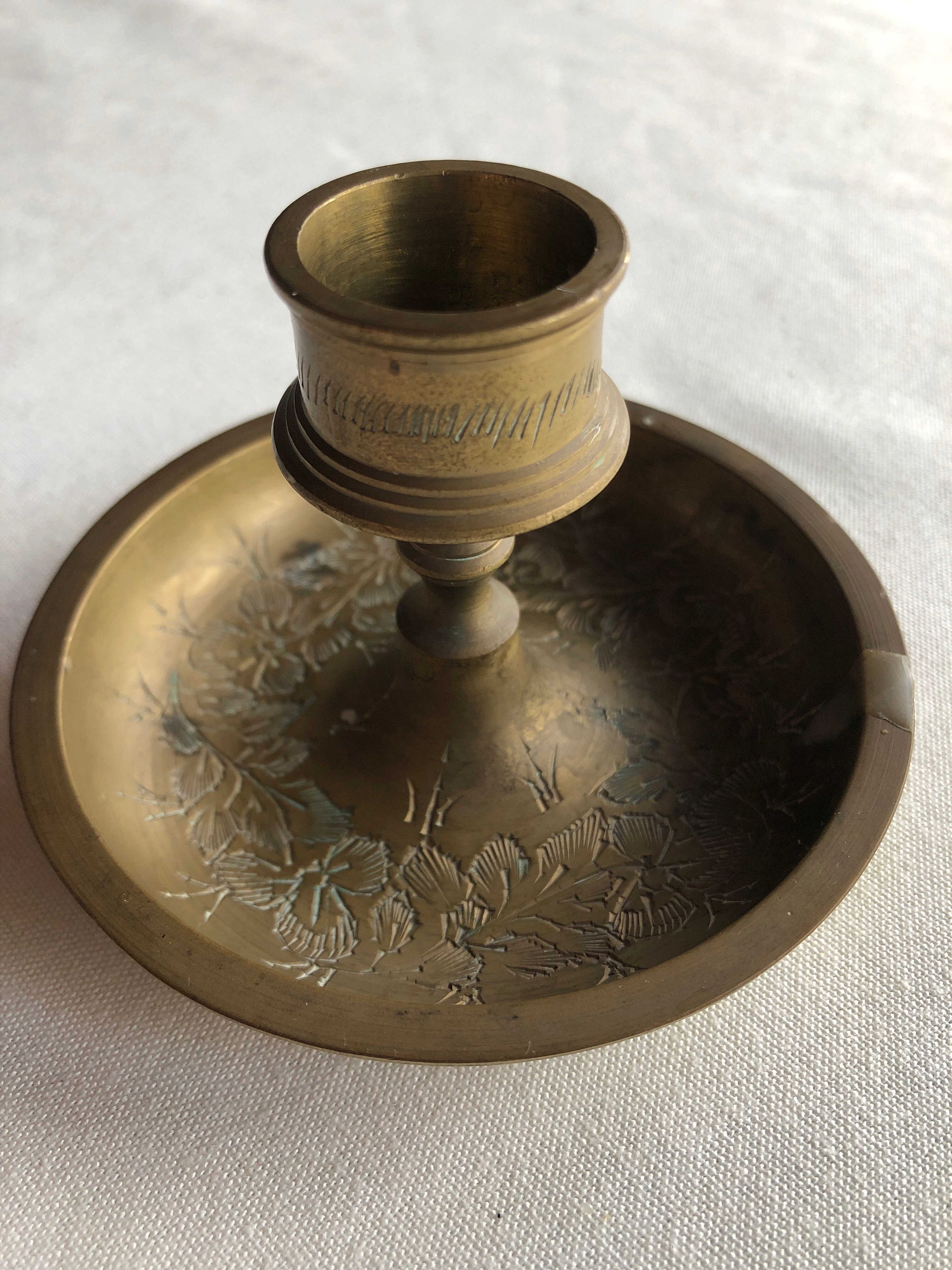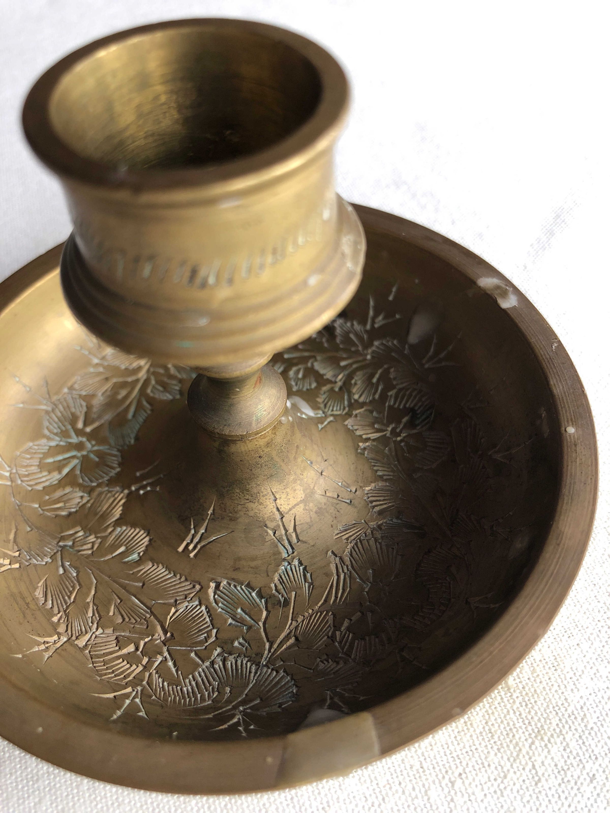 Brass candle holder, one of two, has circle of small lines on candle mounting, as well as etched leaves on the top part of the base