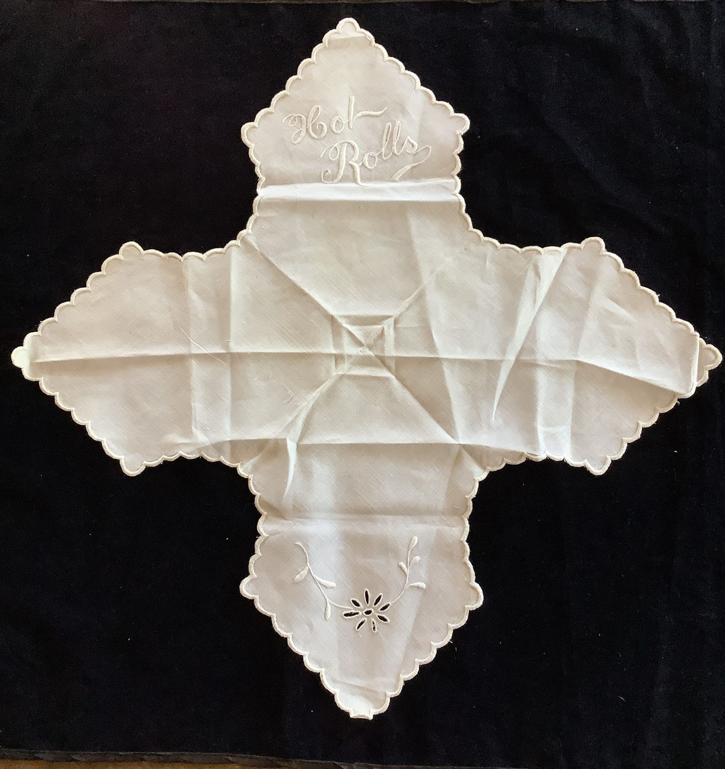 This was used in a basket to hold “hot rolls” as embroidered on one flap.