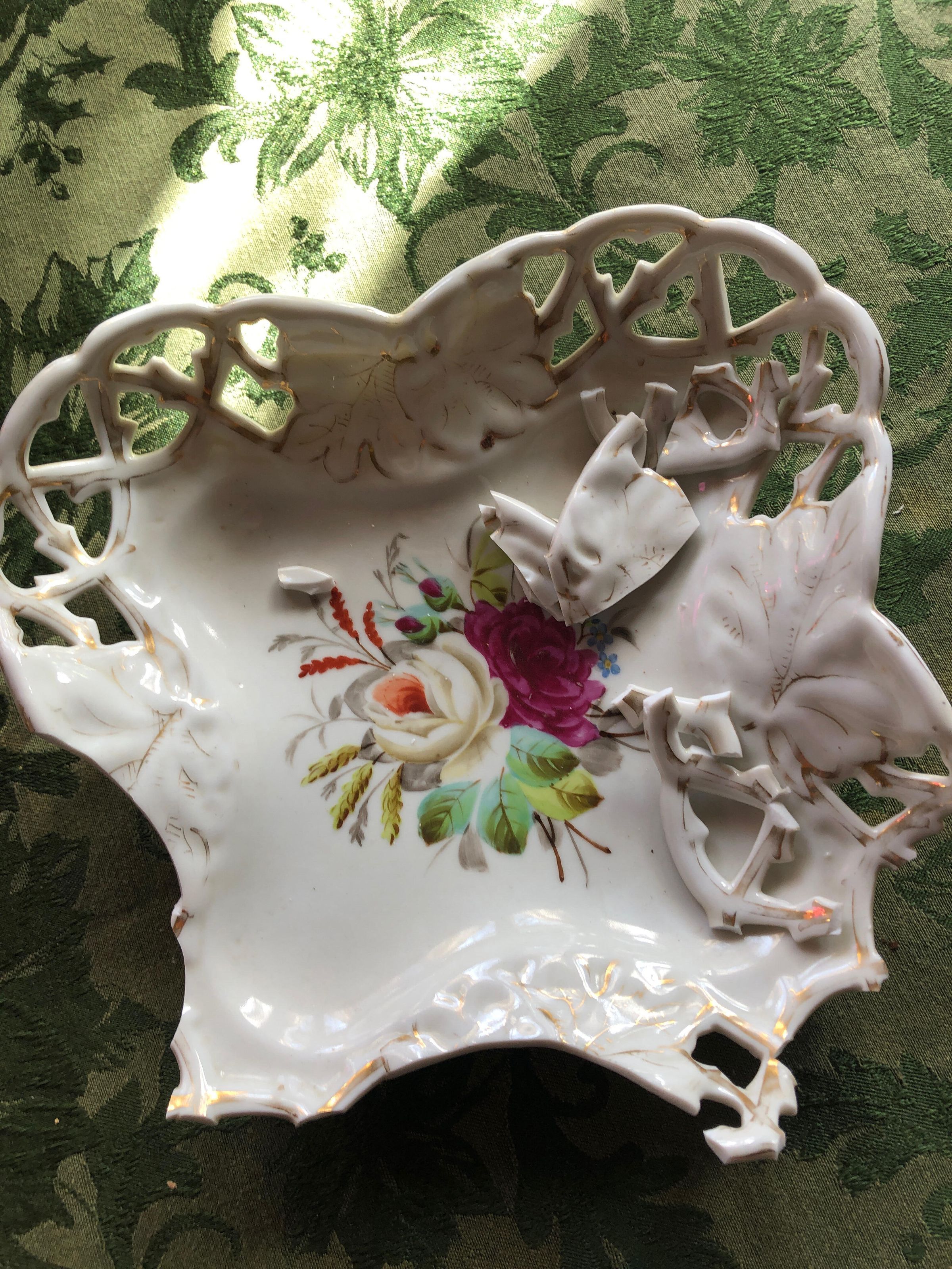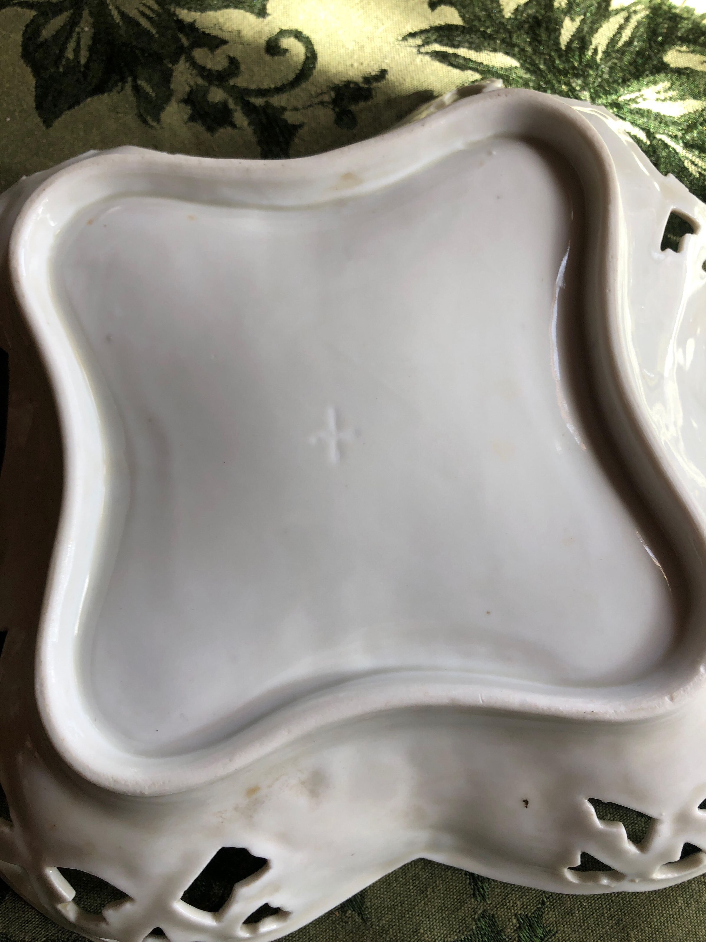 Four clover shaped white dish with open lattice pattern on each lobe edged with gold, hand painted roses and leaves in the centerInscription/Signature/Marks