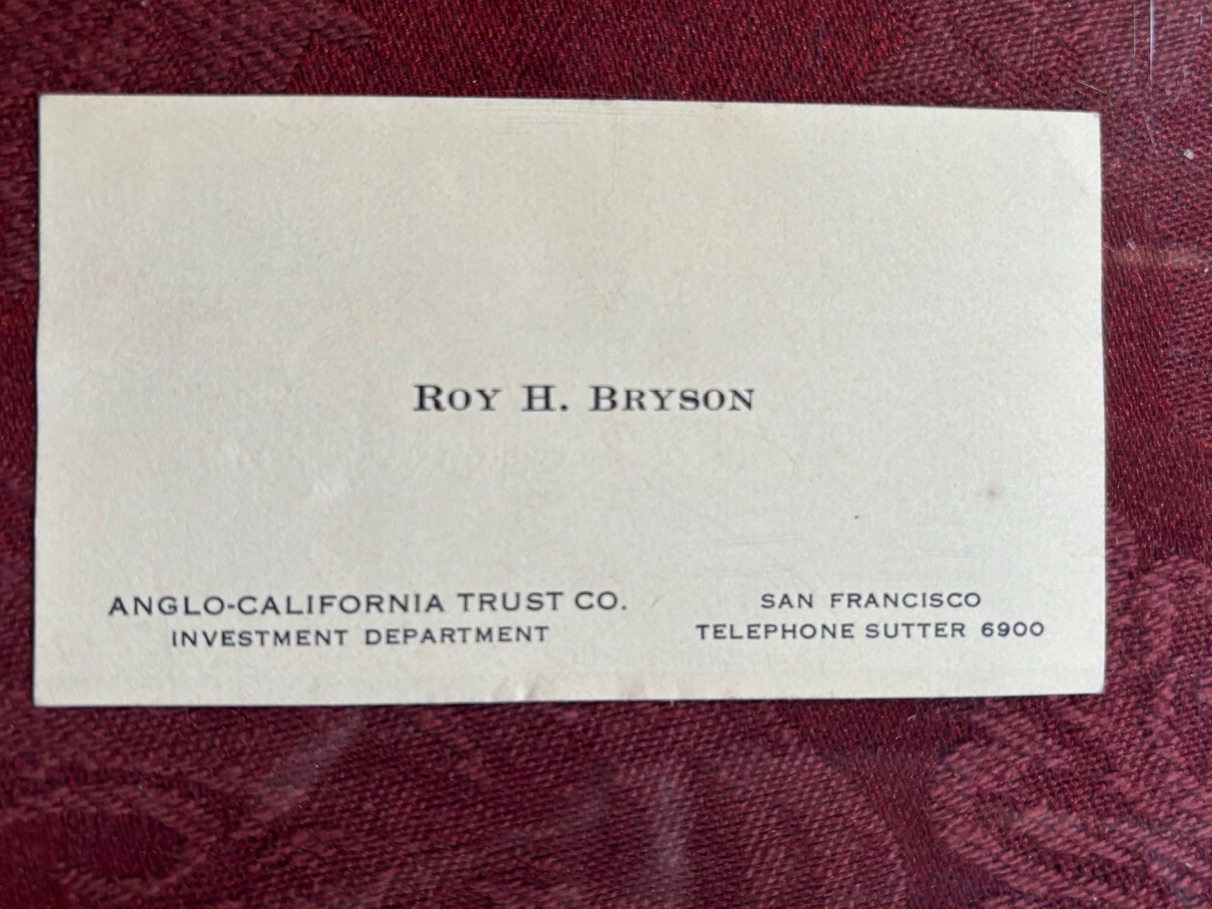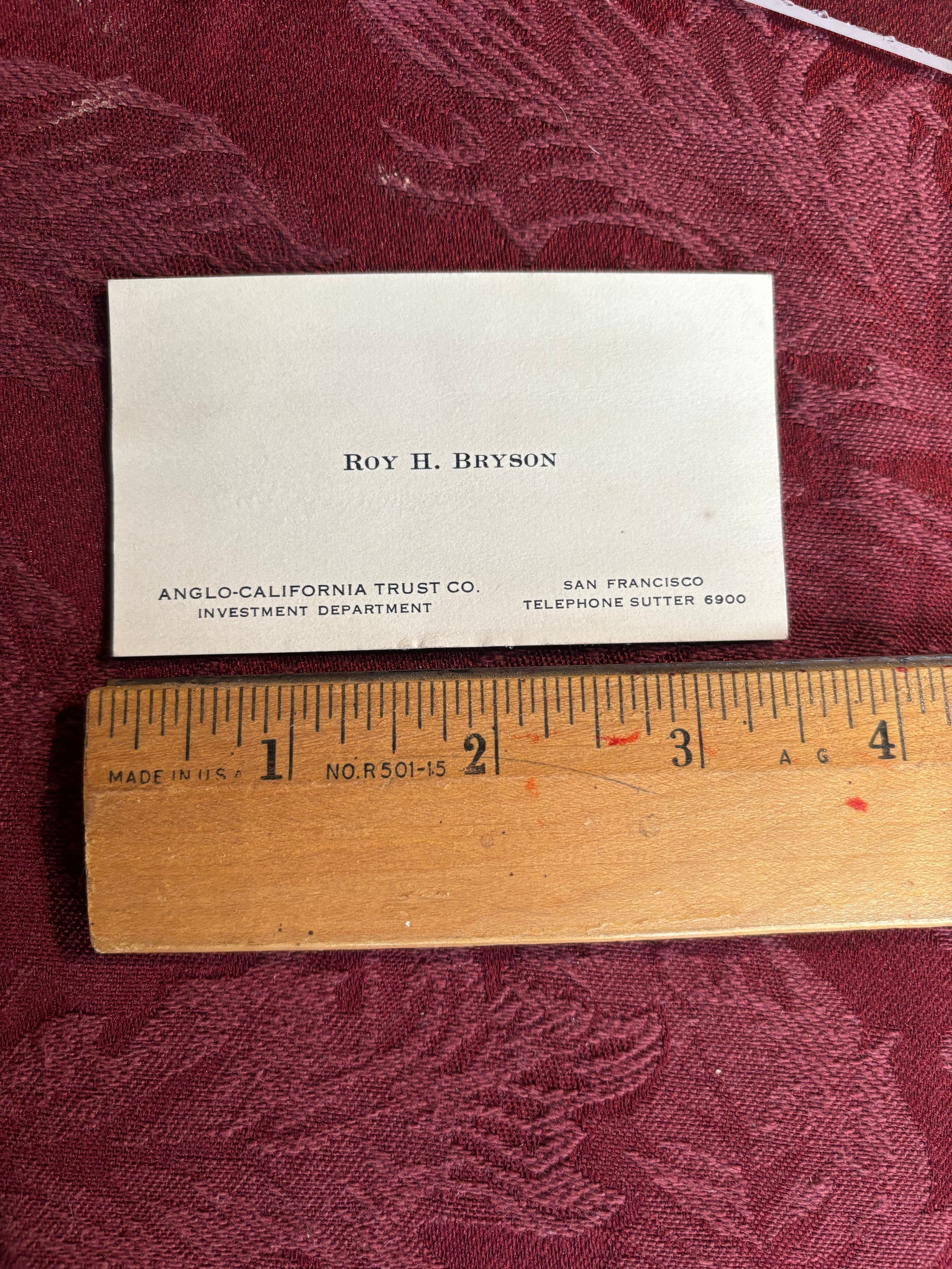 A business card, "Roy H. Bryson," resides with the Anglo-California Trust Co. letters and envelope