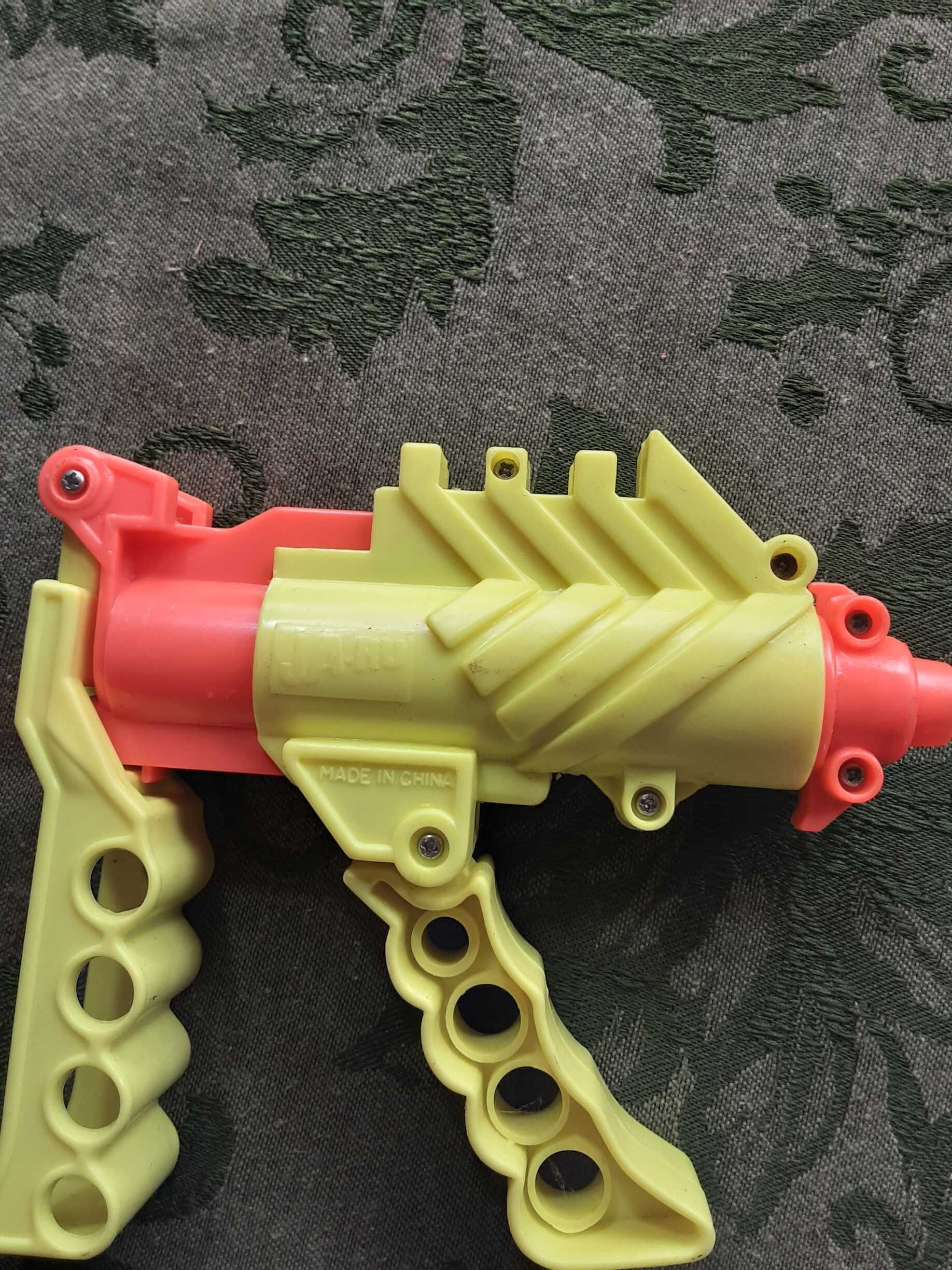 Pump action plastic squirt gun with yellow barrel and red accents, stamped maker's logo reads "Jaru."
