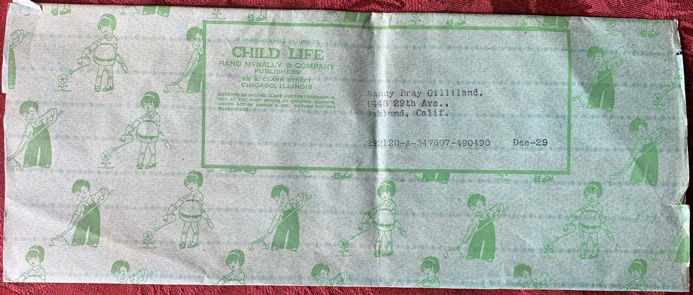 Child Life Magazine Envelope 16 with green children gardening design, "Dec-29."Inscription/Signature/Marks