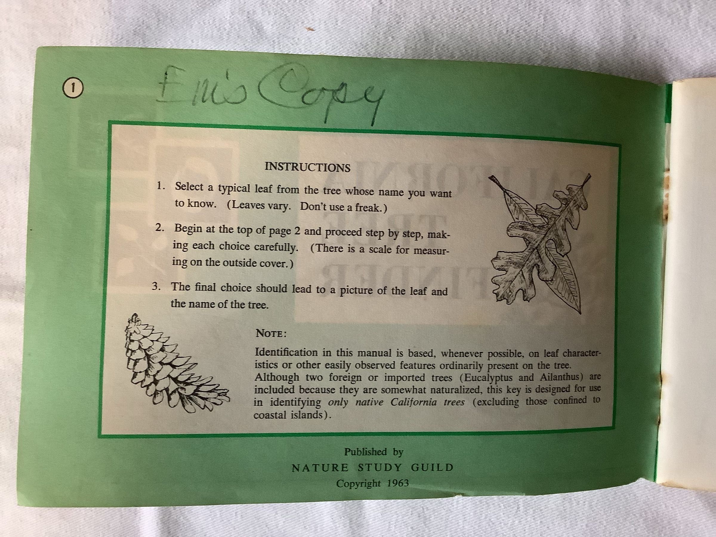 Pocket manual for identifying native California trees by their leaves. Illustrated, shows form and distribution.Inscription/Signature/Marks