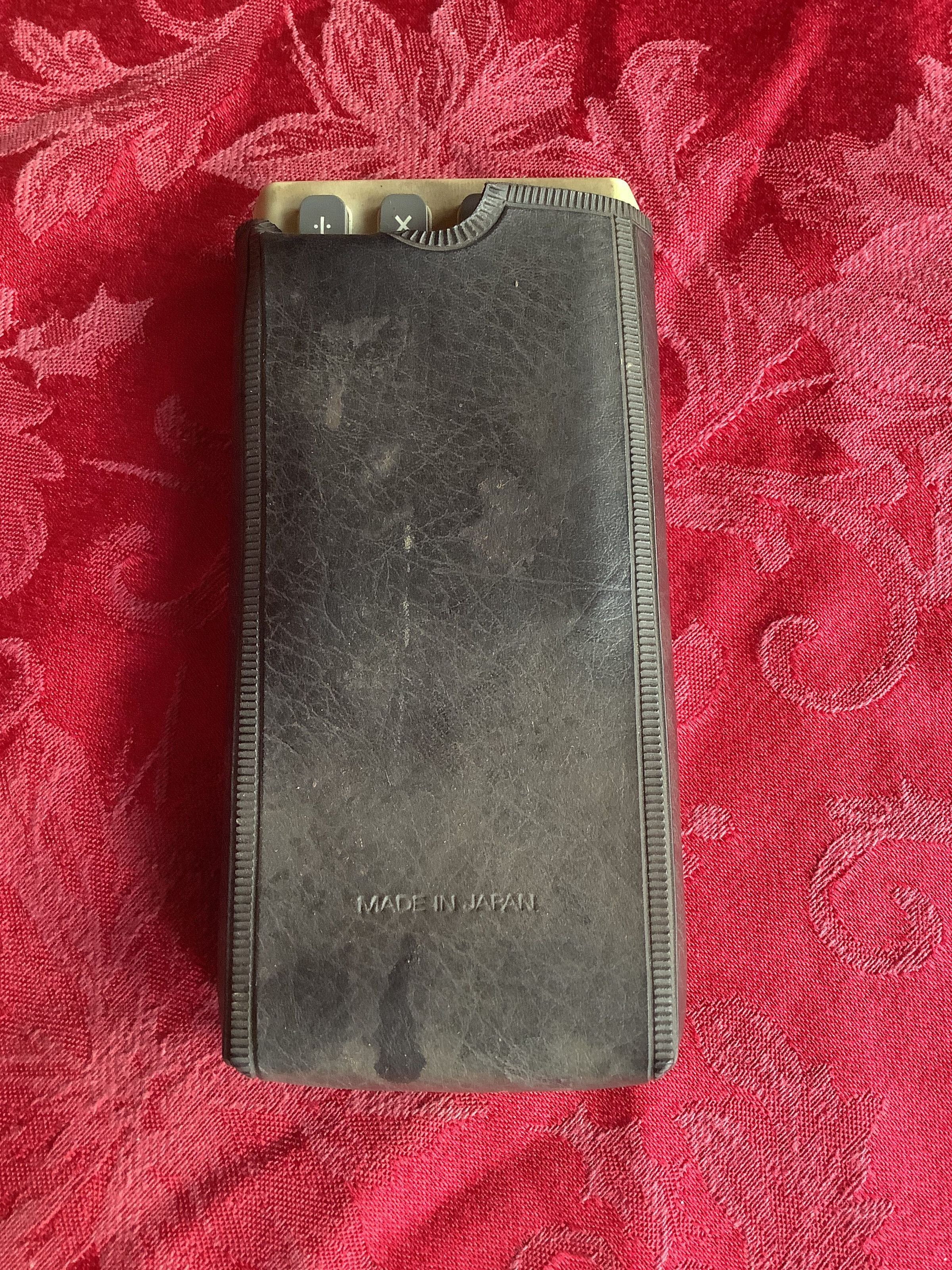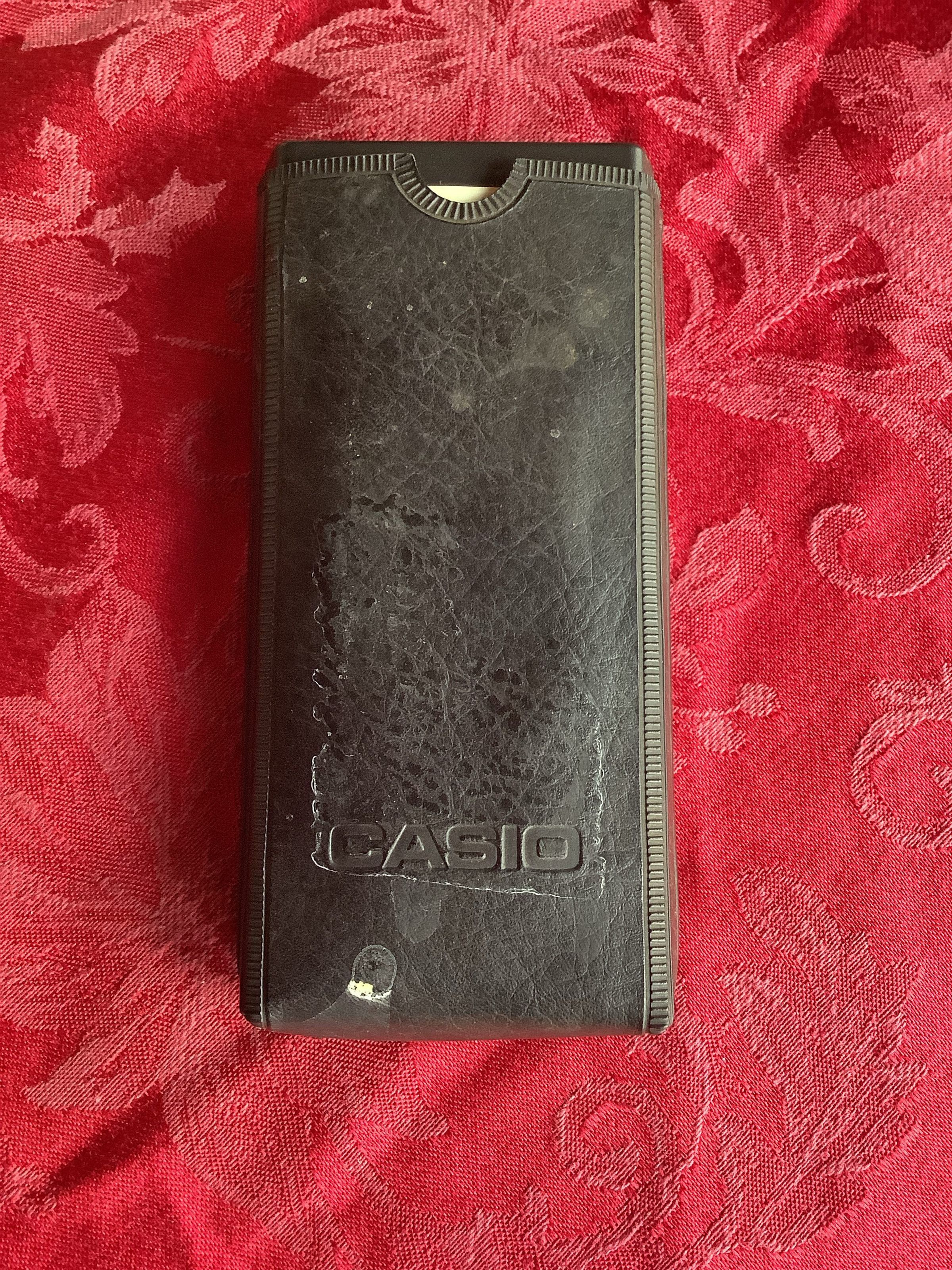 A compact Casio calculator with a black leather cover.