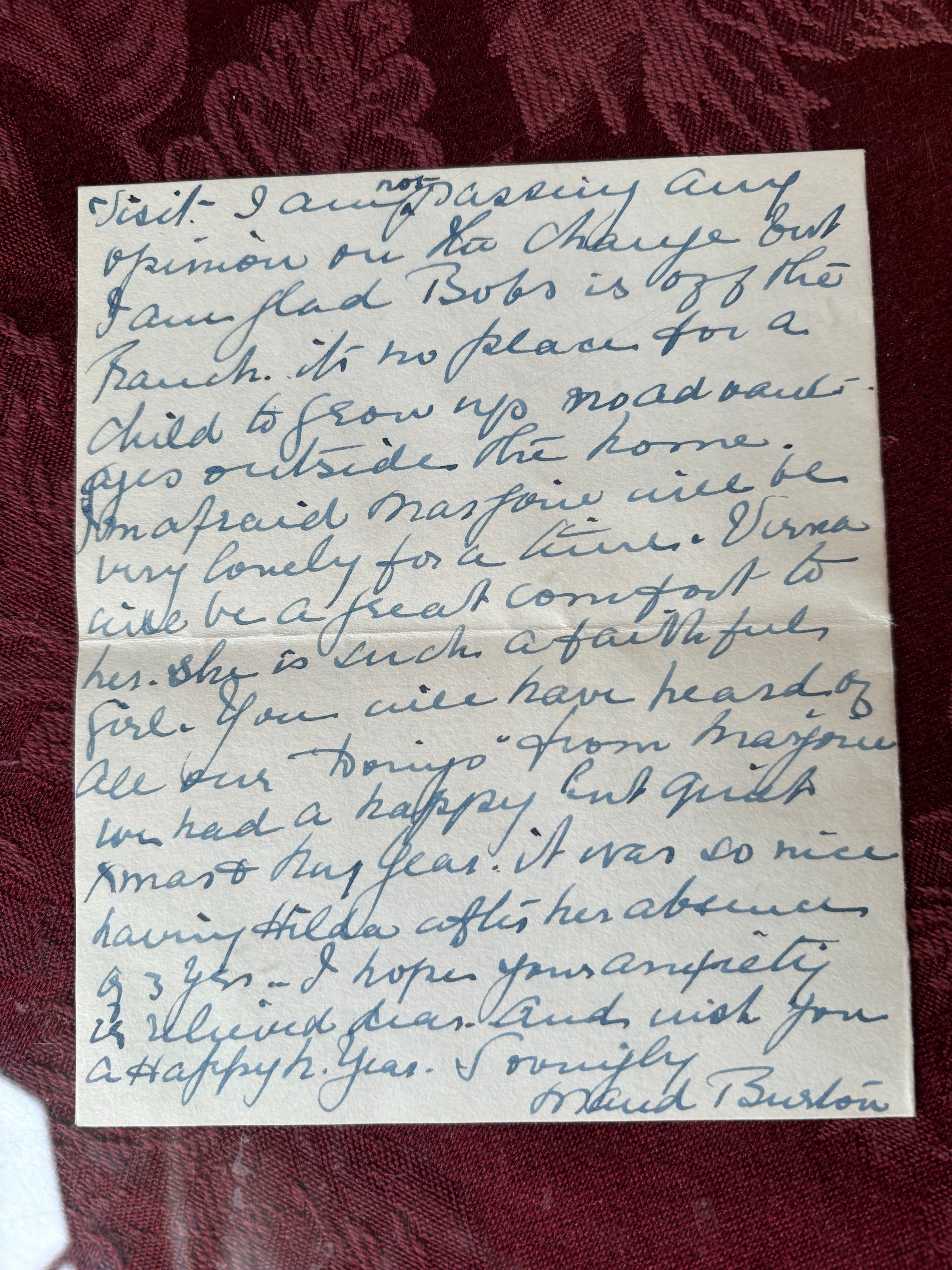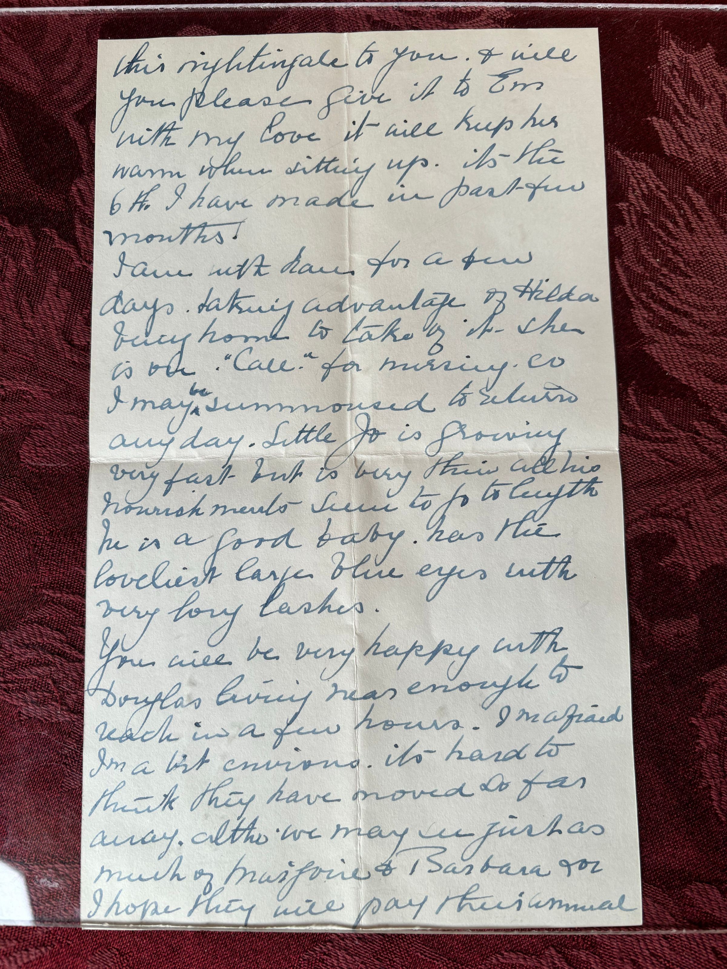 This is a letter to Emma from Maud Burton, she writes to Emma giving her regards because of Emelita's sickness. She sent a present for Emelita along with this letter, something to keep her warm, and updates Emma on her everyday life. ( Maud is Marjory Burton Cohen's Douglas's mother-in-law)Create Date