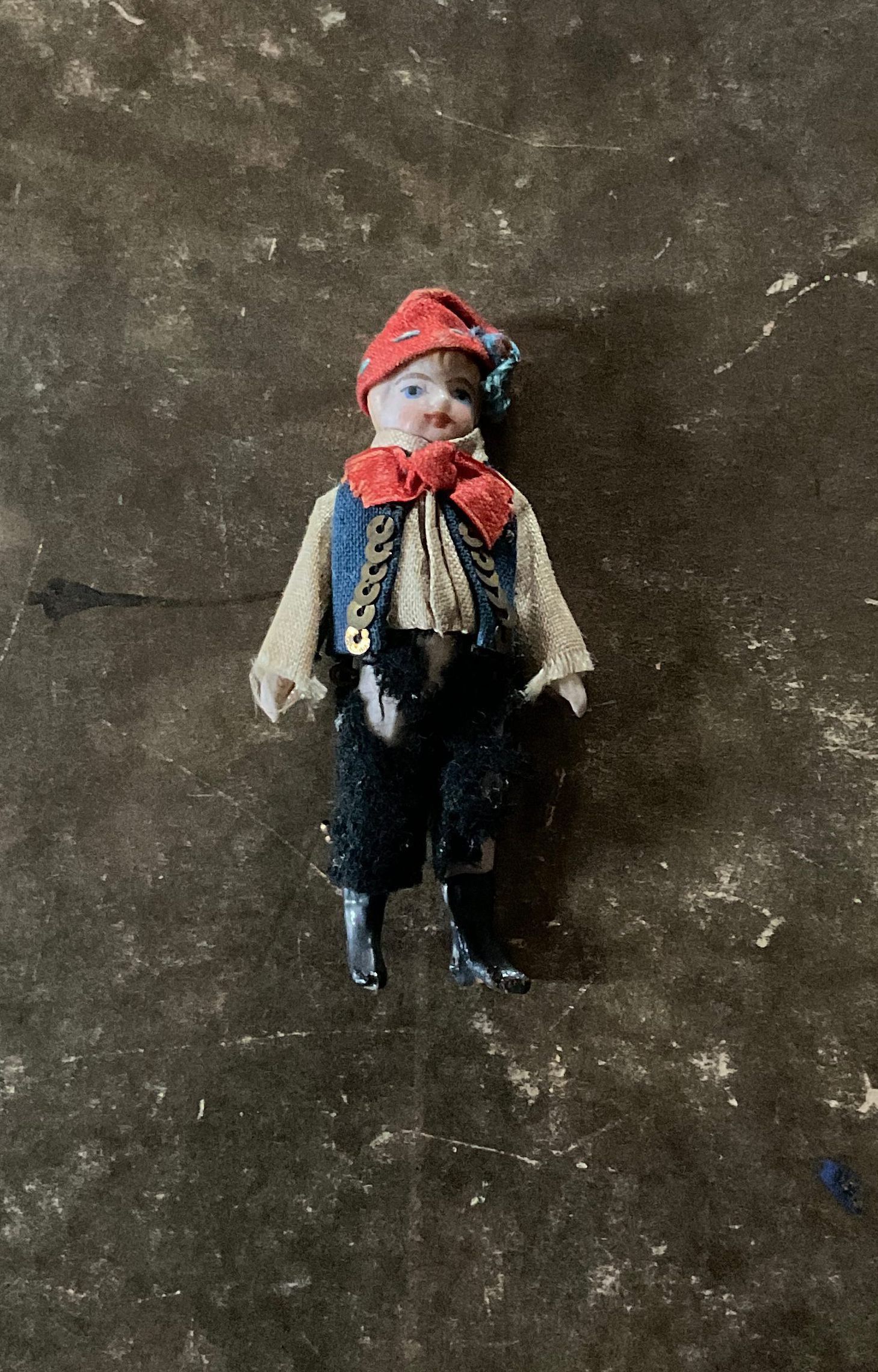 A ceramic doll of a a small boy. The boy is wearing a red hat, black, pants, brown shirt, blue vest, red bow, and black boots. The little boy has blond hairCollection