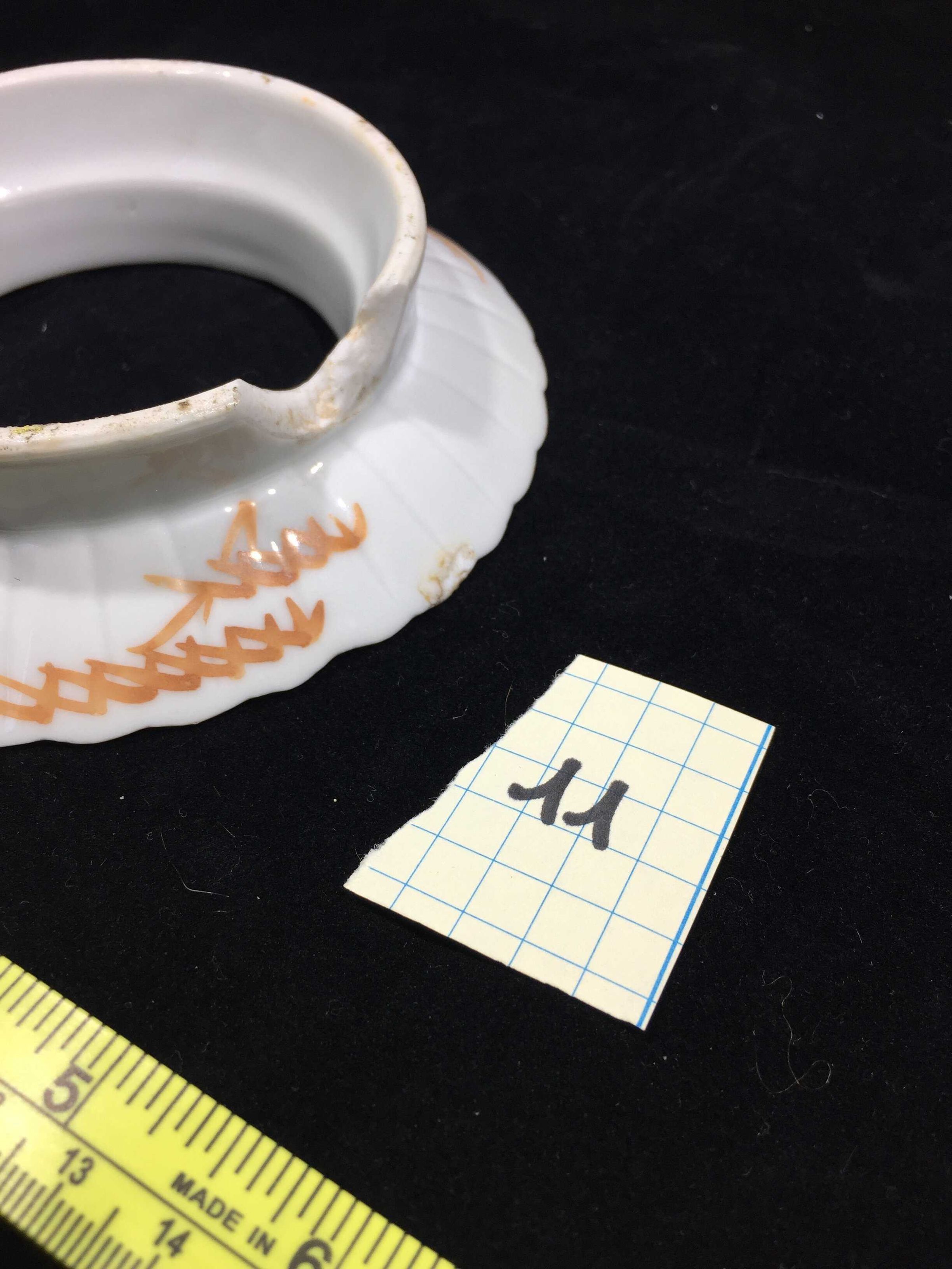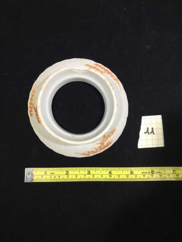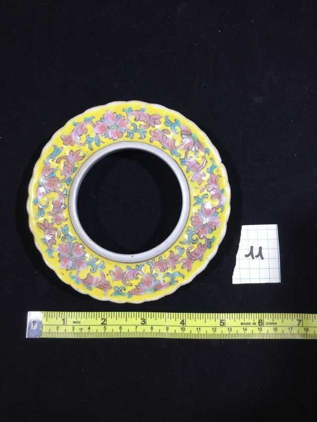 White base, pink and blue flowers on a yellow background, 3 copper crosshatching designs on base (unknown use- soup bowl fits on top )