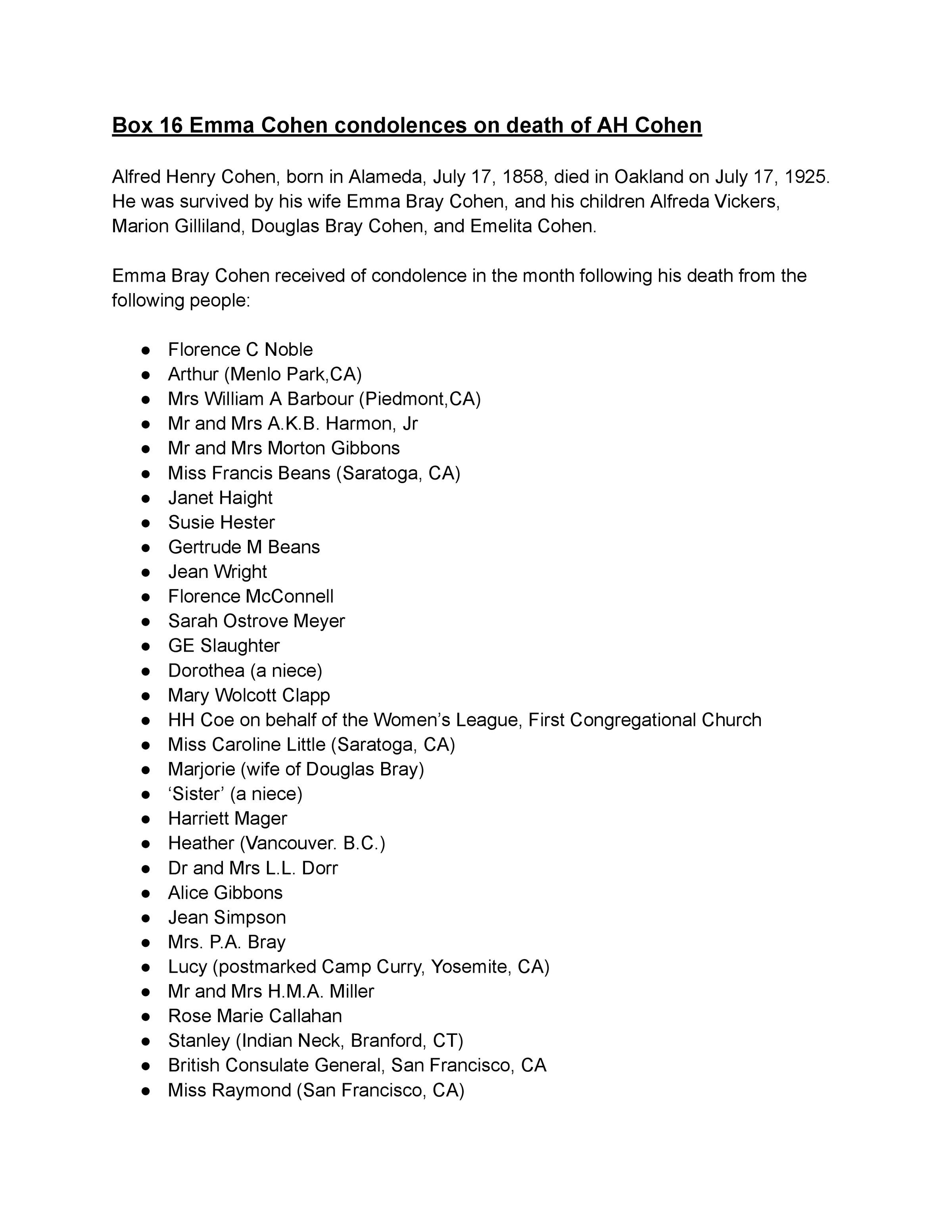Box 16: Letters, notes, and cards of condolence addressed to Emma Bray Cohen regarding the death of her husband Alfred Henry Cohen on July 17, 1925Create Date