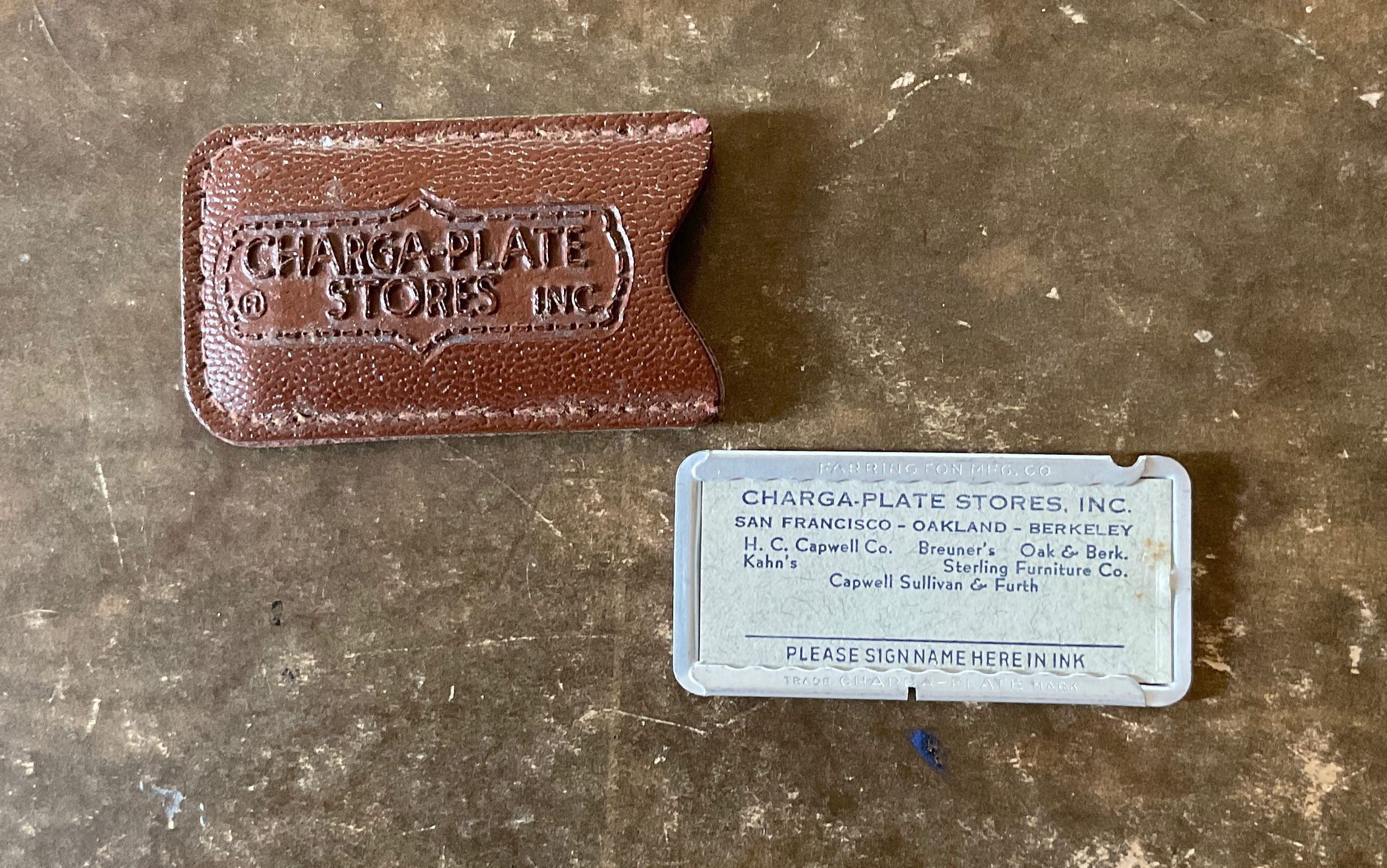 The Charga-Plate was trademarked by the Farrington Manufacturing Company. It was a metal, dog-tag style plate with a customer’s name and city of residence imprinted on it, with a paper backing that the customer could sign. They were typically issued by large scale merchants for customers to use as store credit for that retailer. They were developed as early as 1928 and issued primarily during the 1930s-1950s.