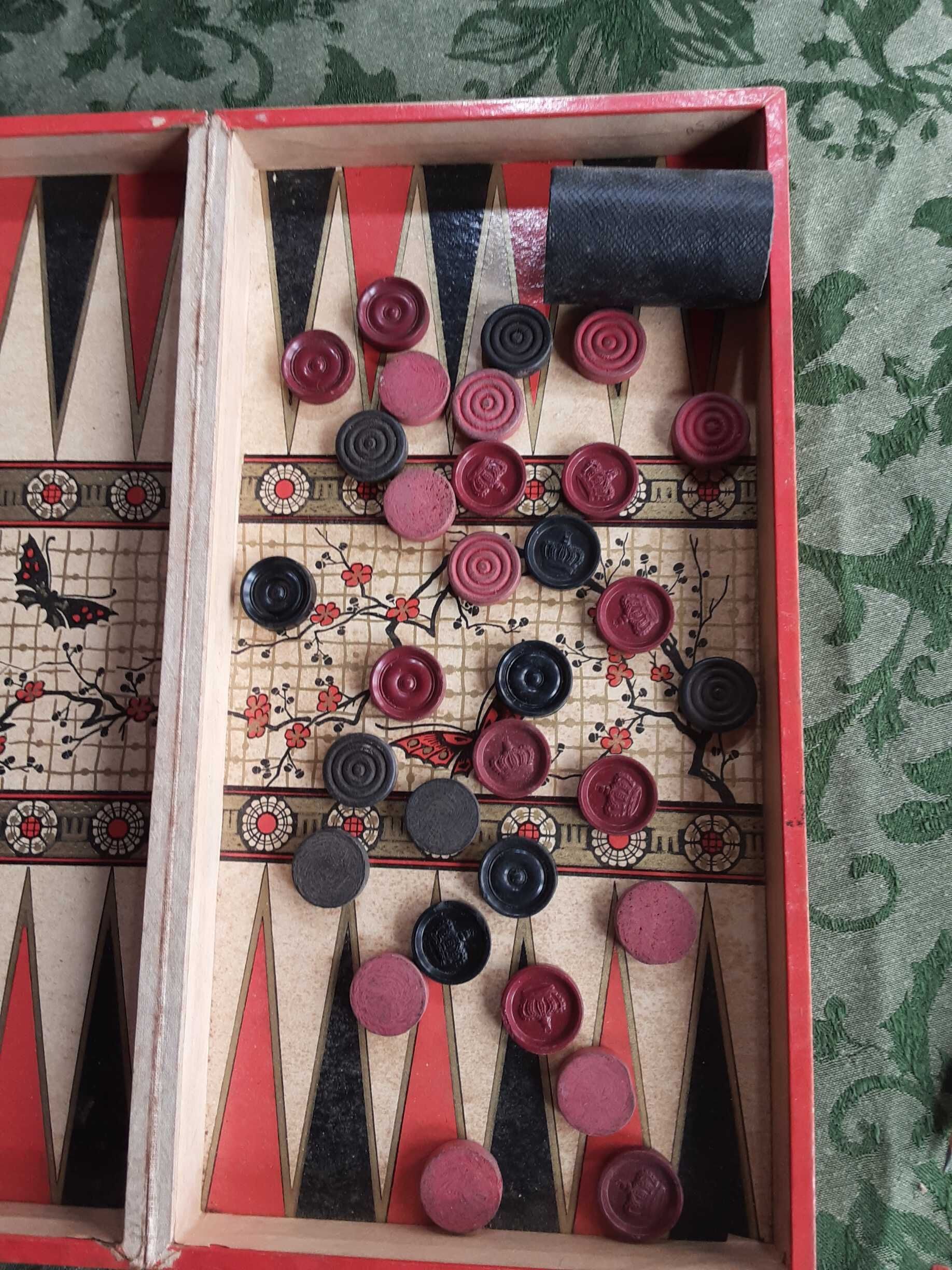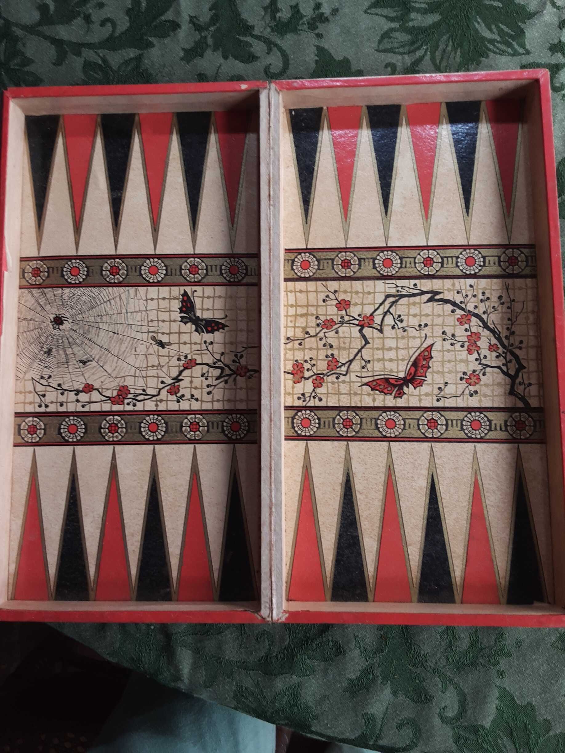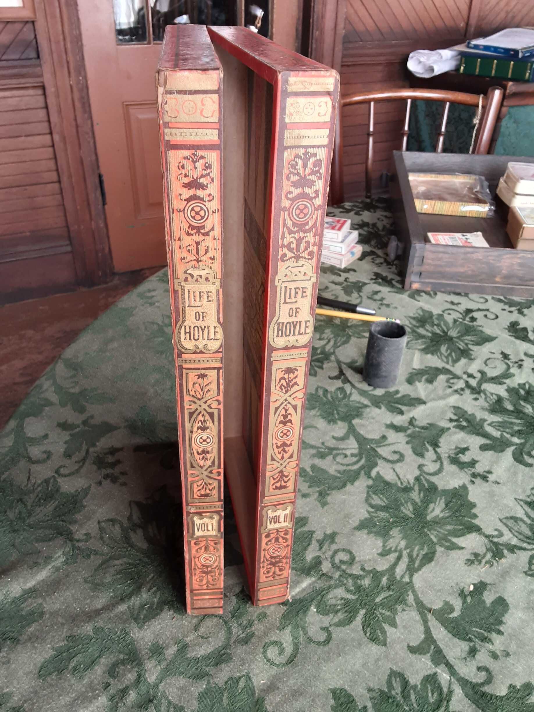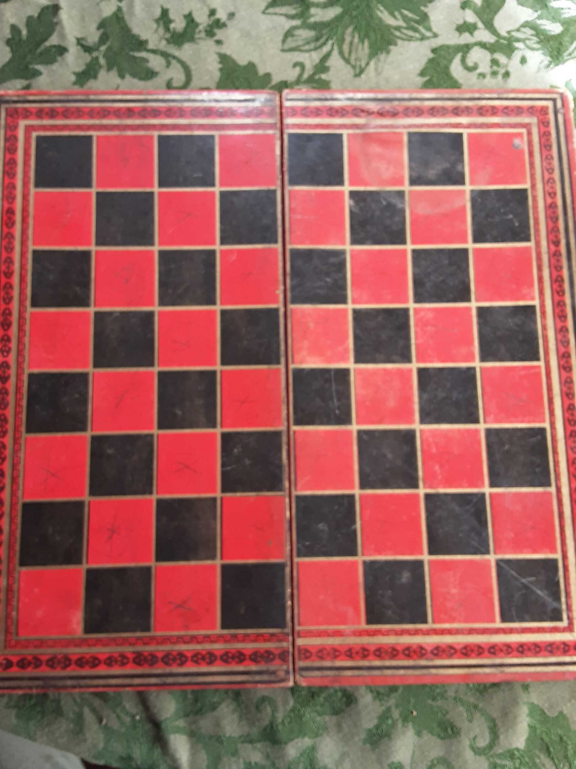 Reversible board for two games, checkers and backgammon, outer edge painted to resemble books, "The Life of Hoyle, Vol. I and Vol. II" Backgammon side has inside decorations of black branches and red flowers, as well as red and black butterflies and a spider web.Create Date