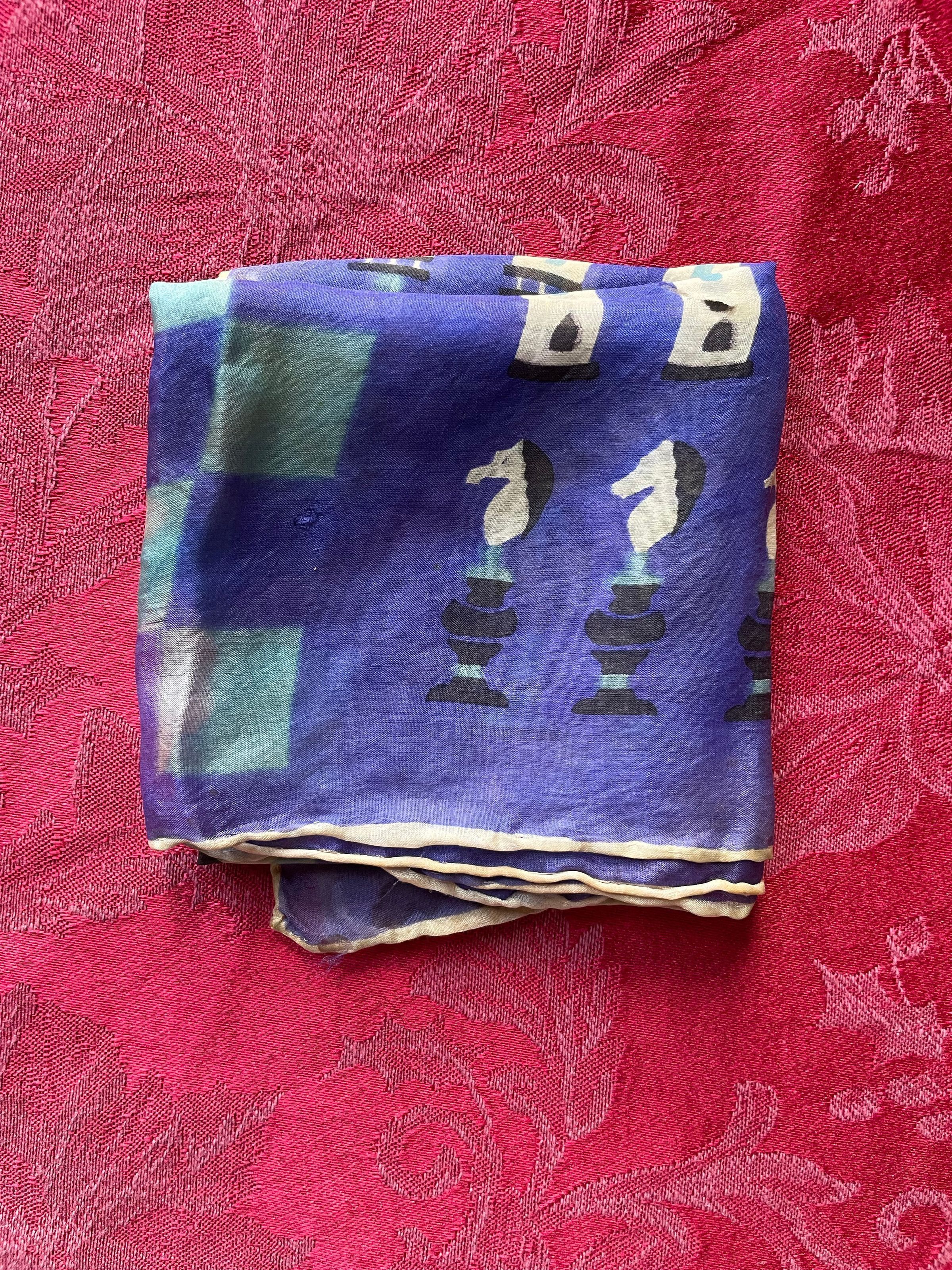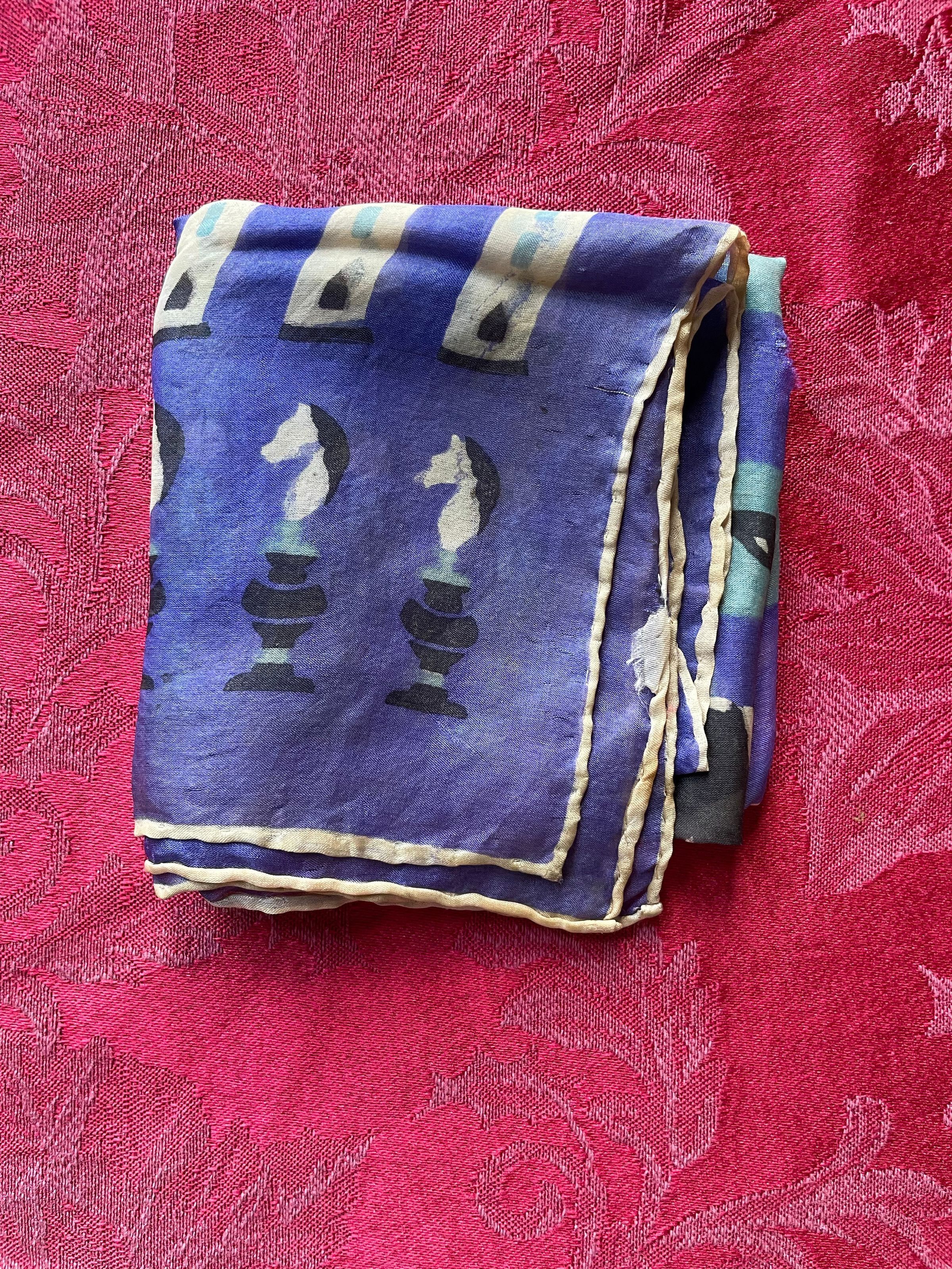 A blue patterned scarf with a chessboard and pieces pattern. There are a few holes.