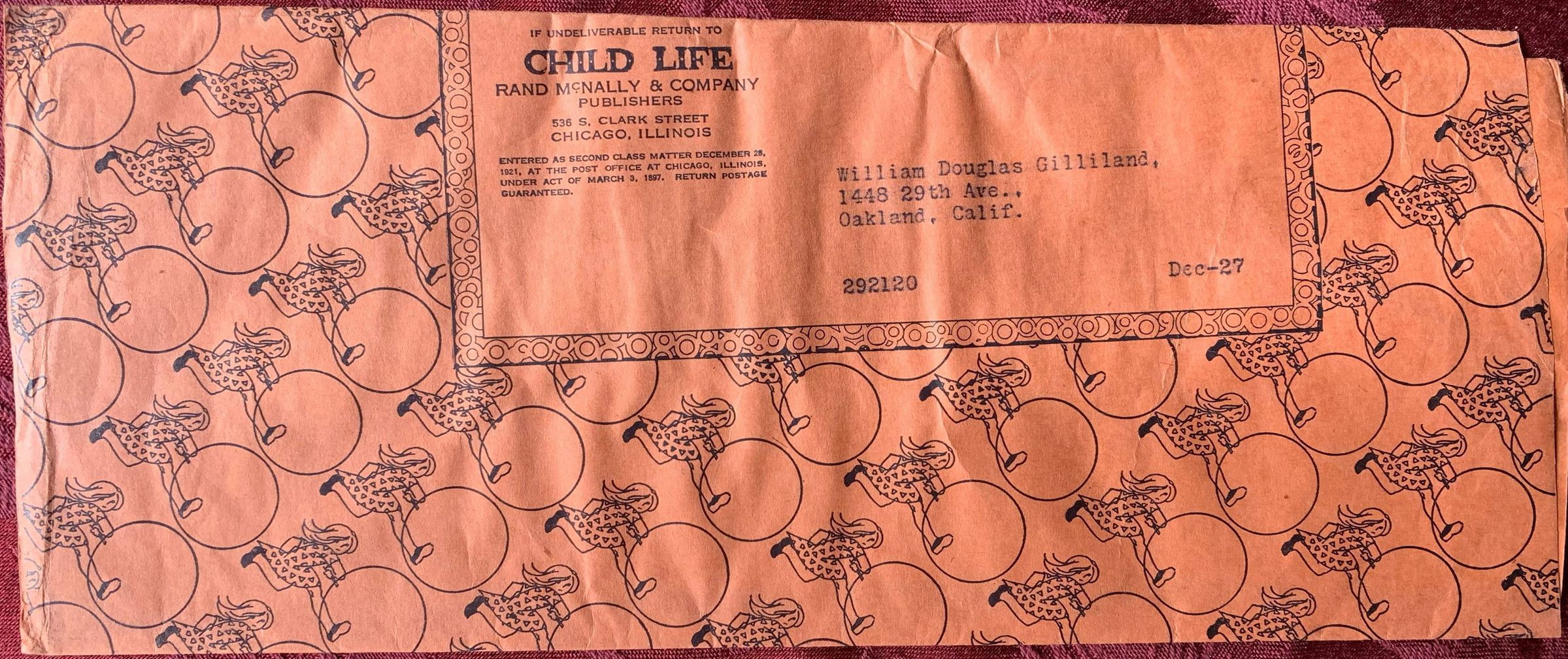 Child Life magazine Envelope 18 with child playing hoop rolling design, "Dec-27."Inscription/Signature/Marks