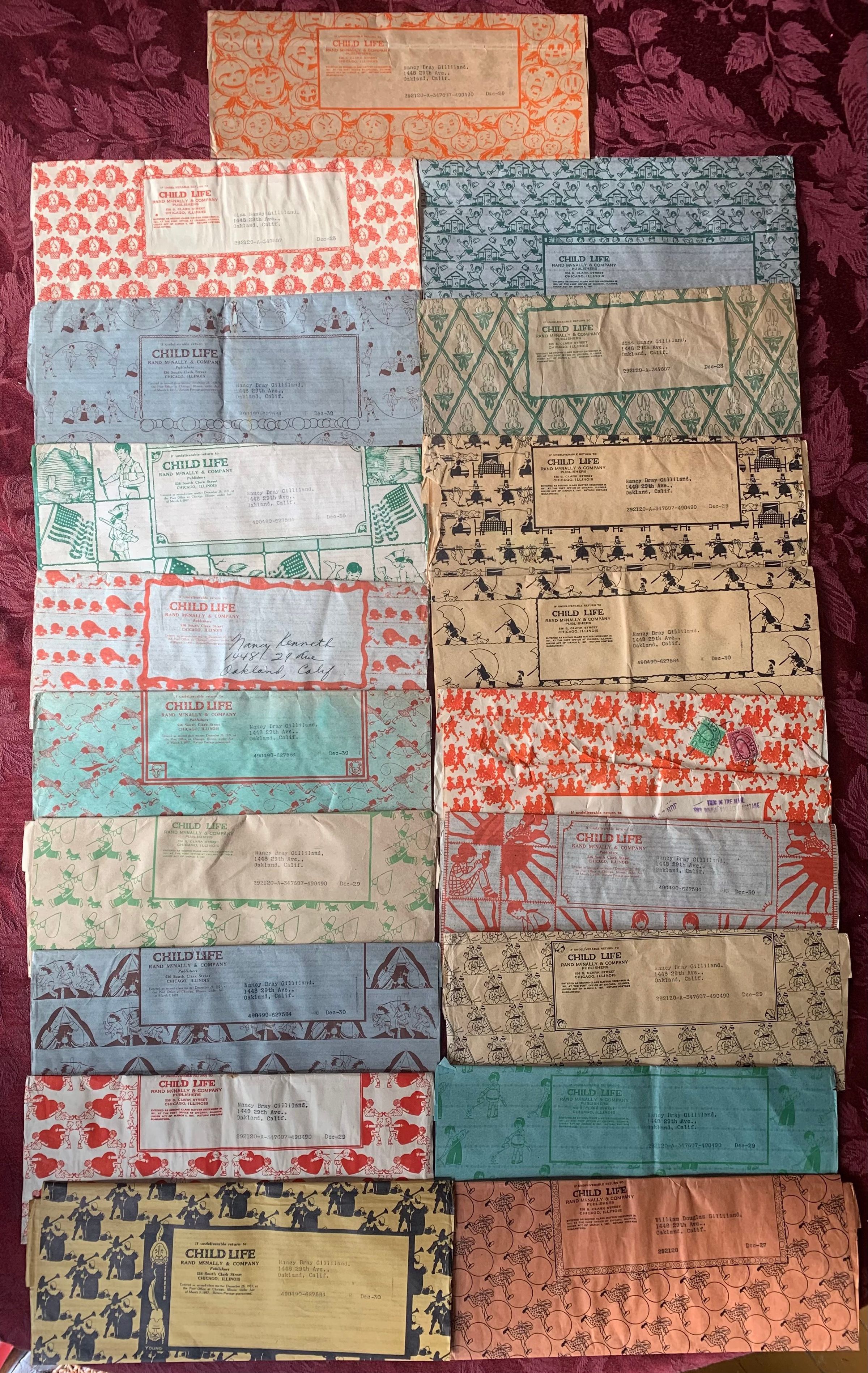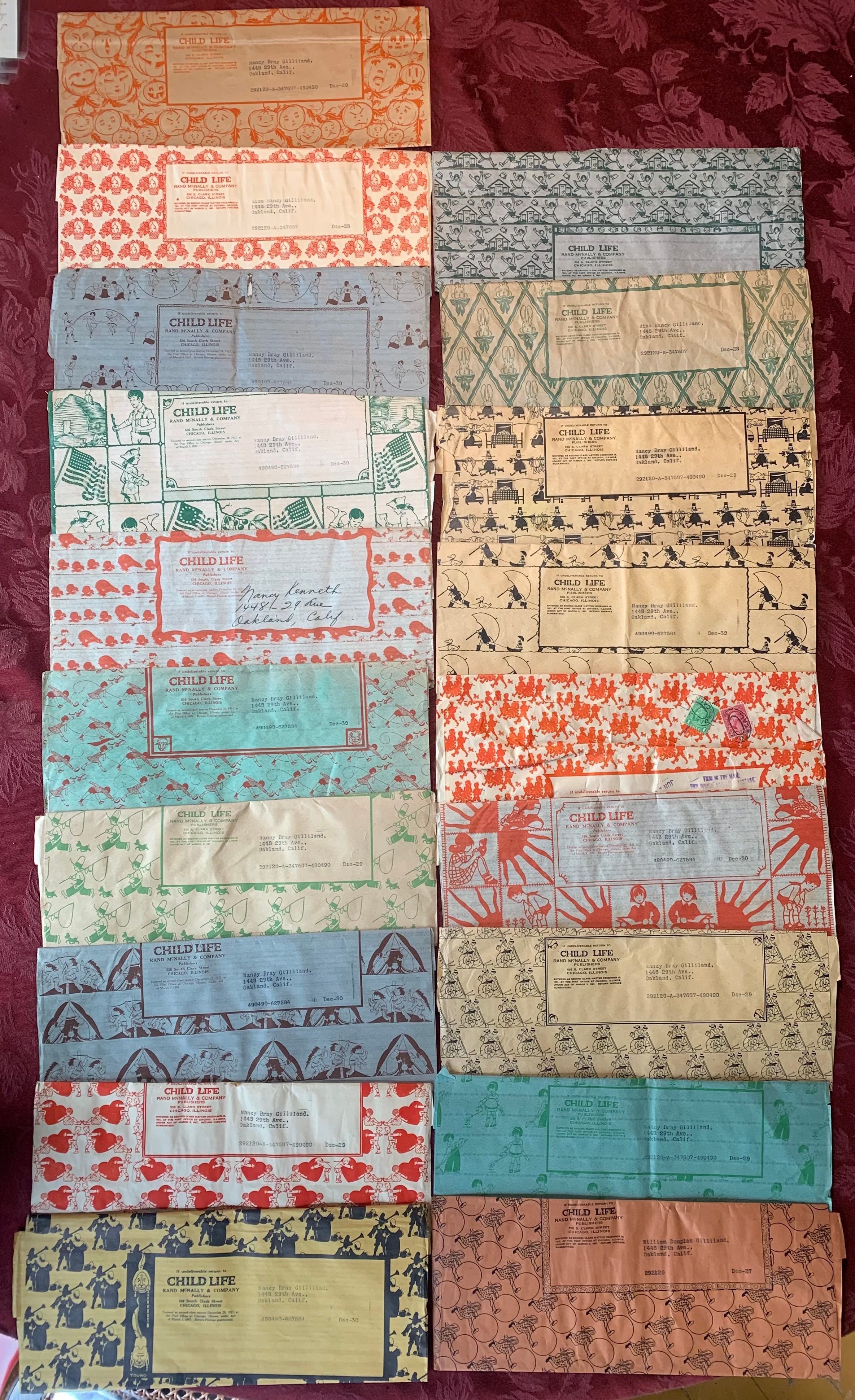 Collection of envelopes found in the hidden drawer. Child Life: Rand McNally and Company Publishers. Each has their own unique design and color. Most are addressed to Nancy Bray Gilliland.Create Date