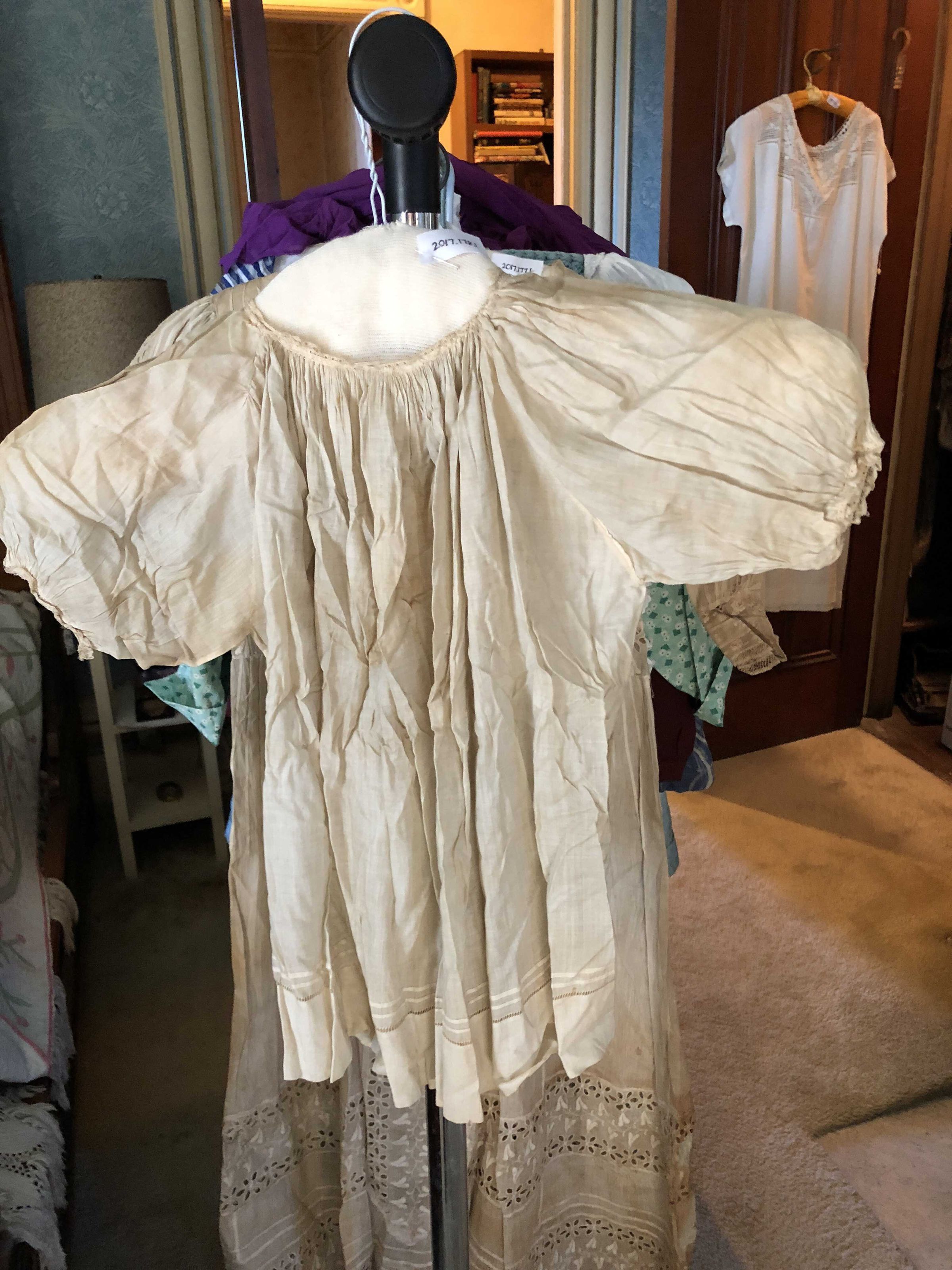 Child’s tunic, White gathered lace trim on neck, sleeves, and hem