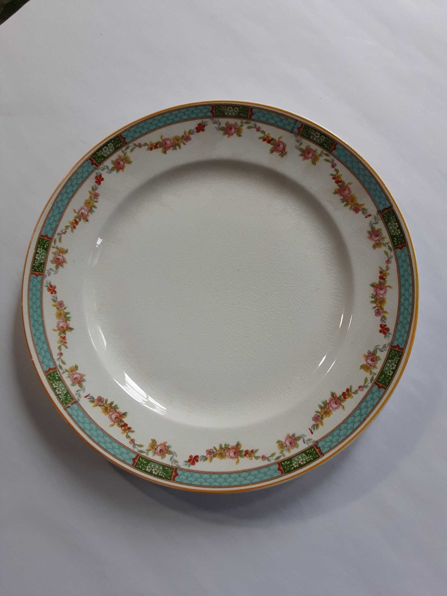 China plate in white done with an intricate border, the concentric circles have alternating sections of emerald green with white flowers, and larger light blue sections with a fish scale pattern painted within. There are then roses and golden and red flowers painted as "bunting."Create Date