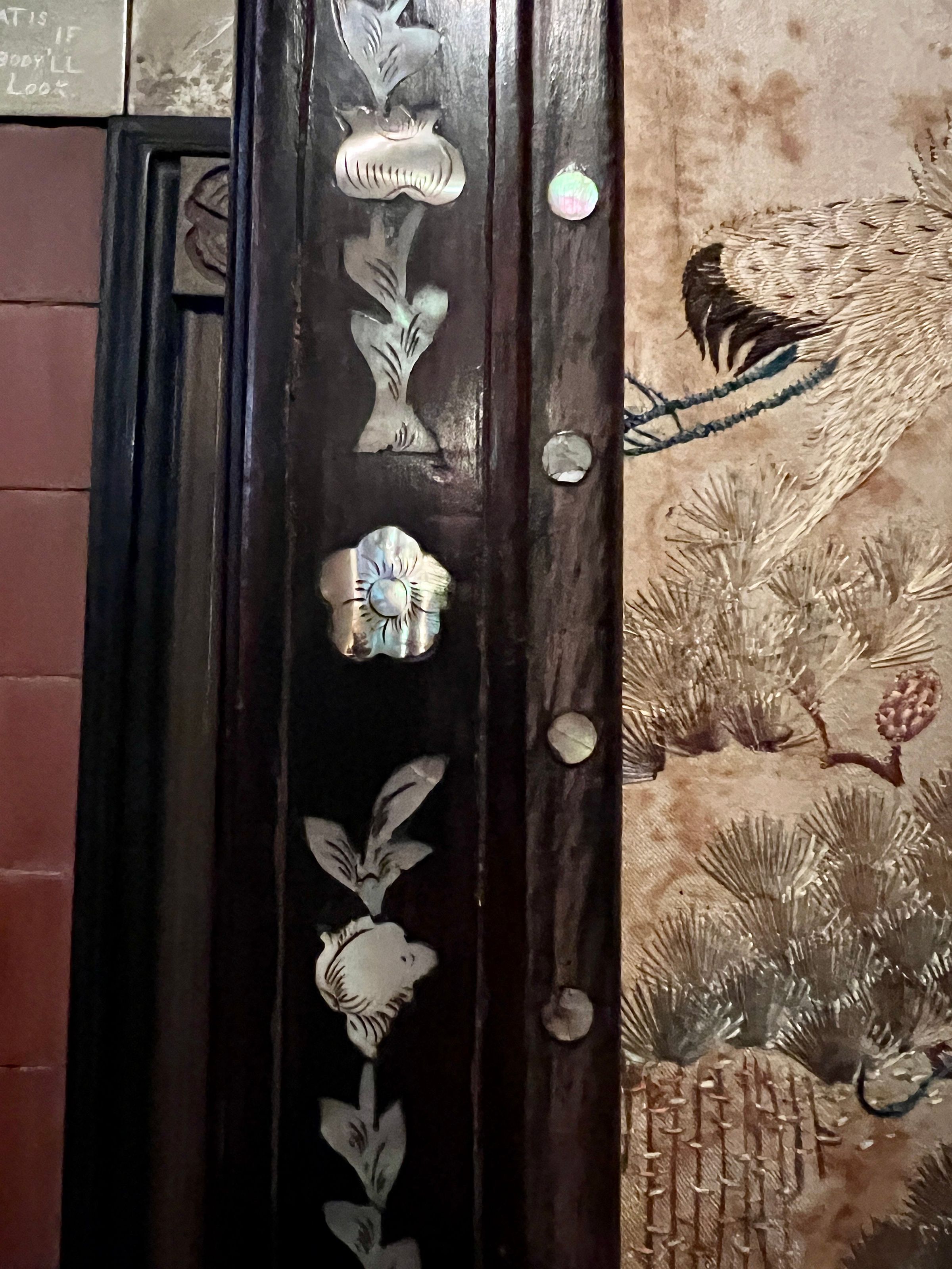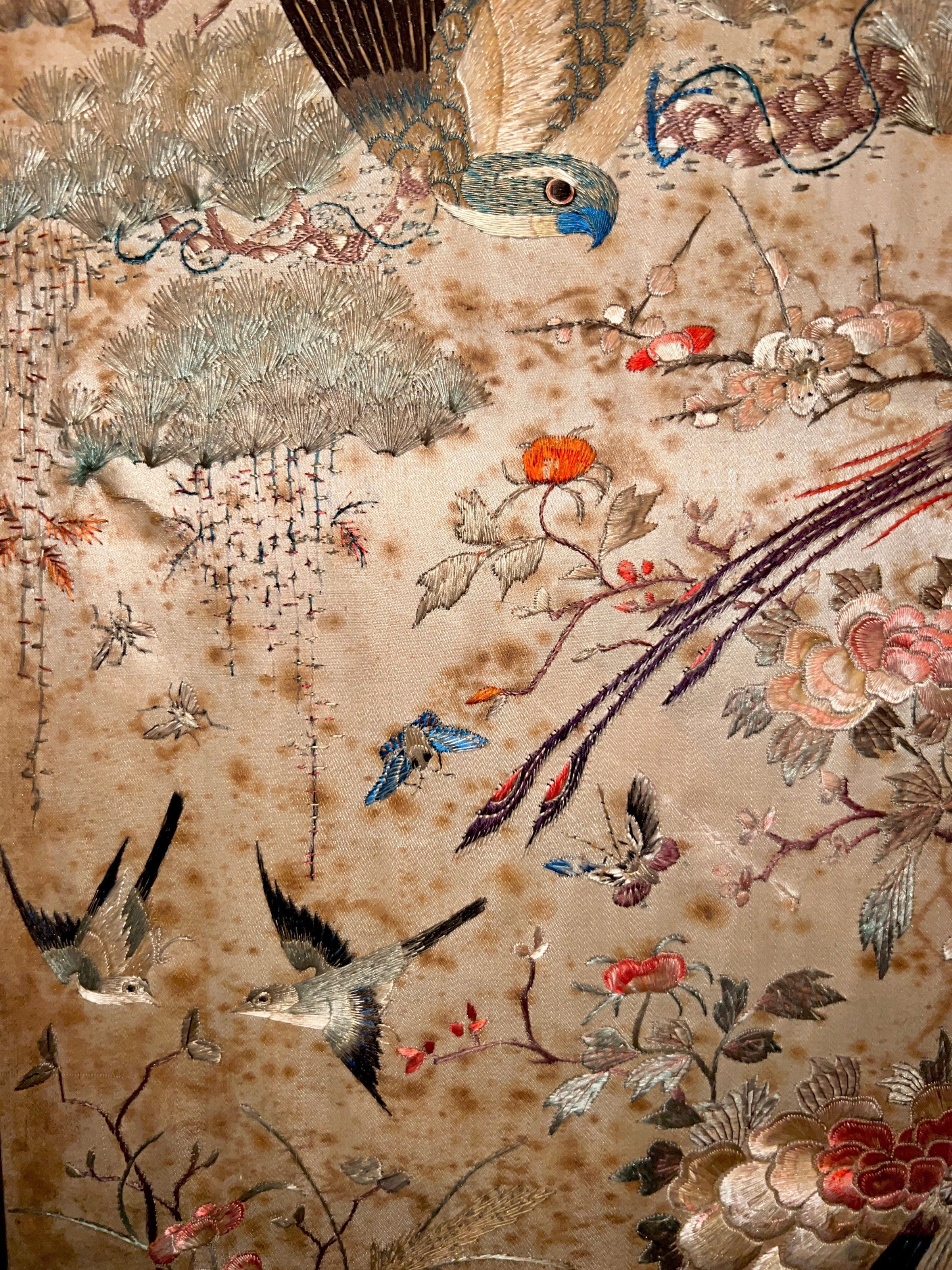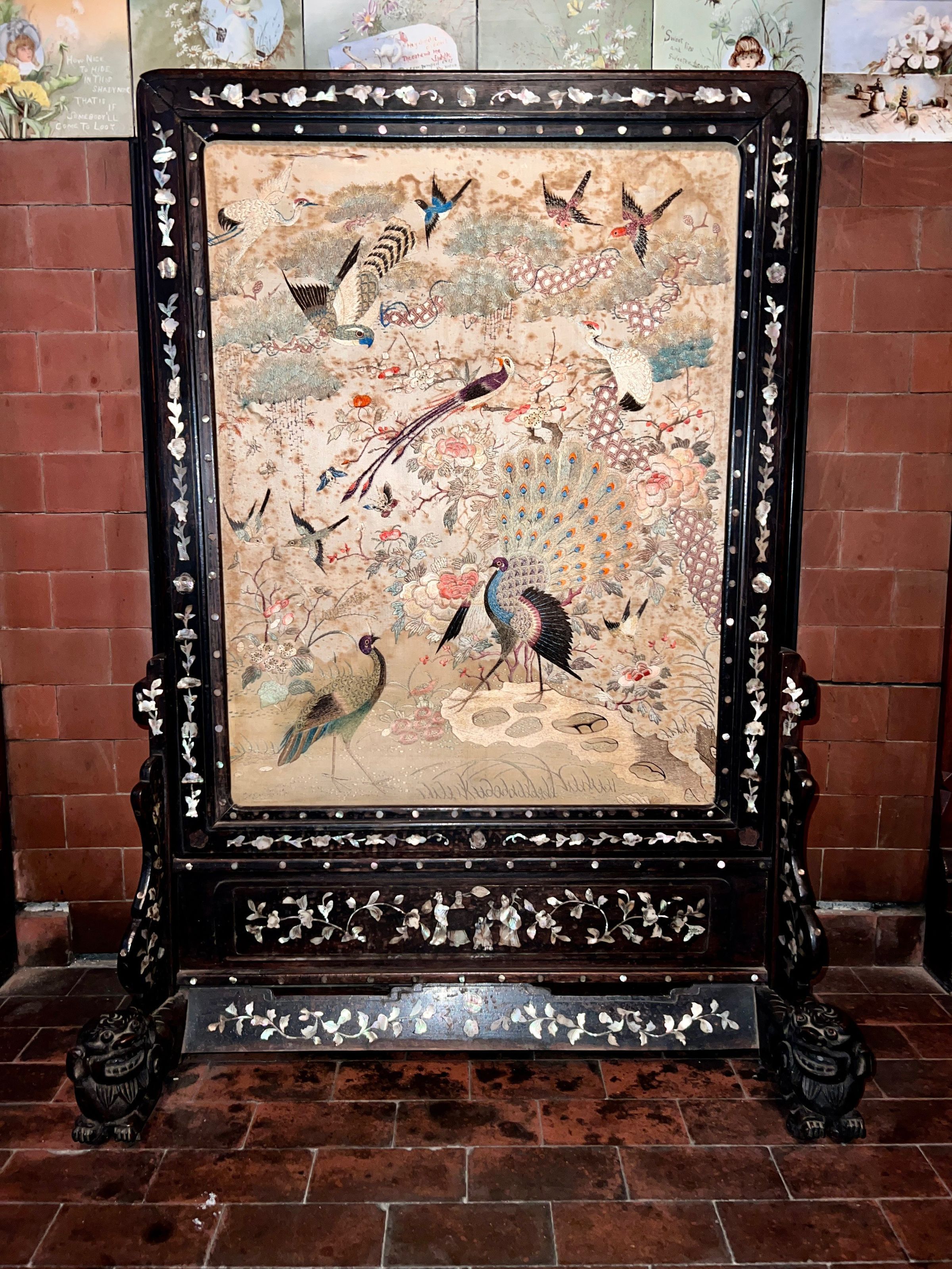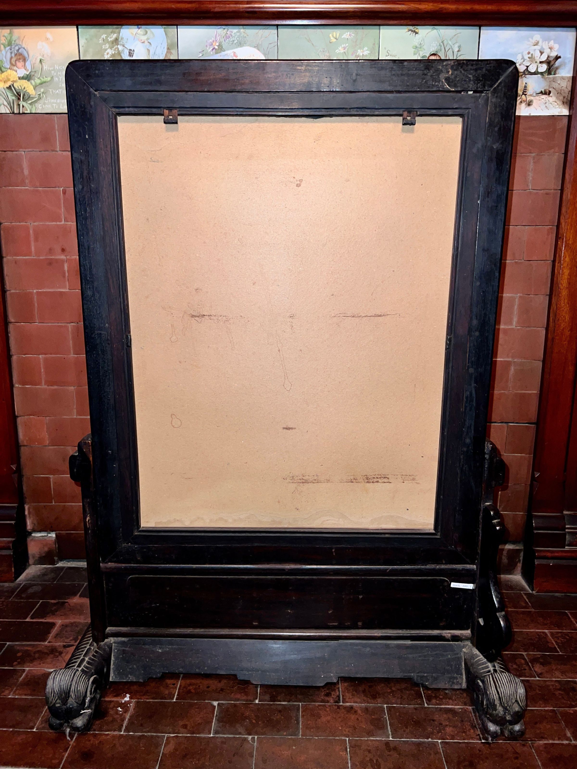Chinese embroidered silk fire screen with mother of pearl filigree and vignettes inlay in carved ebony.