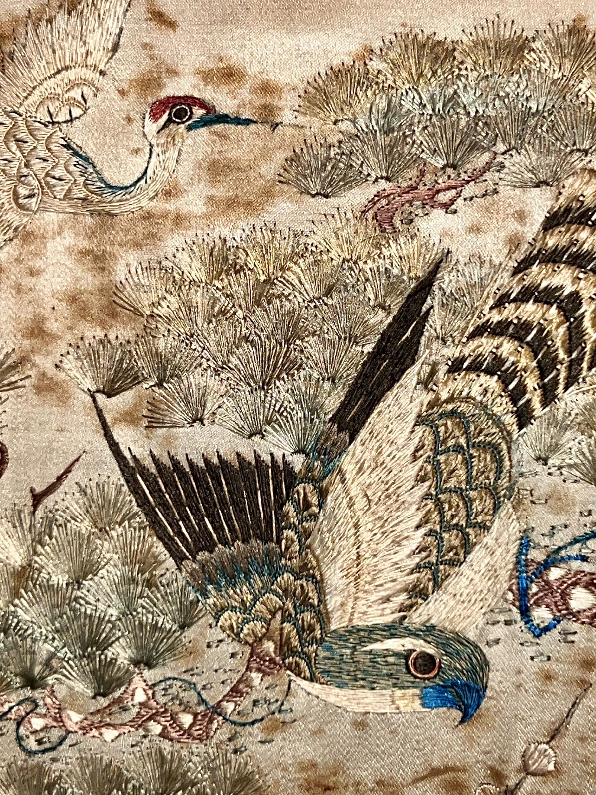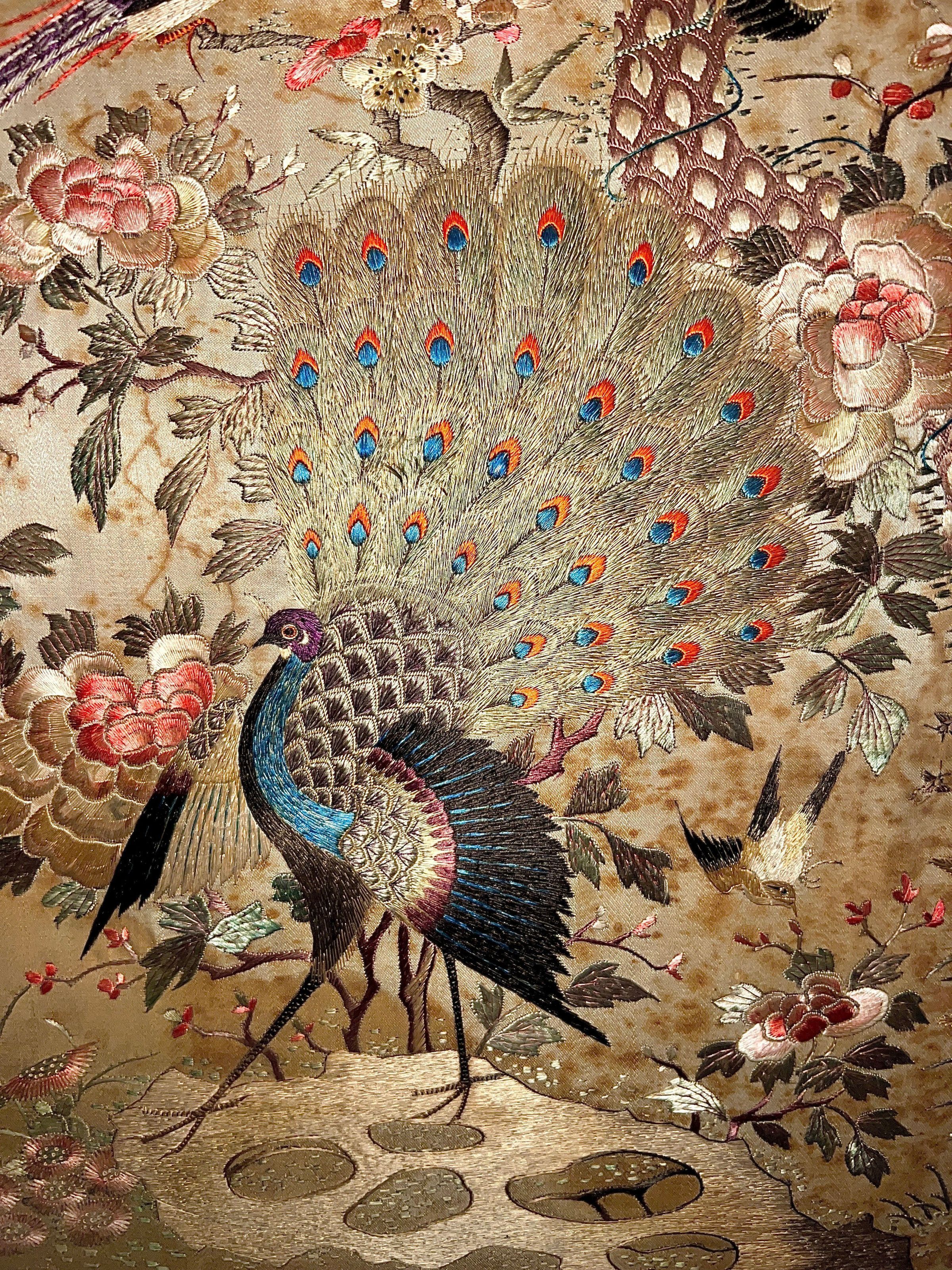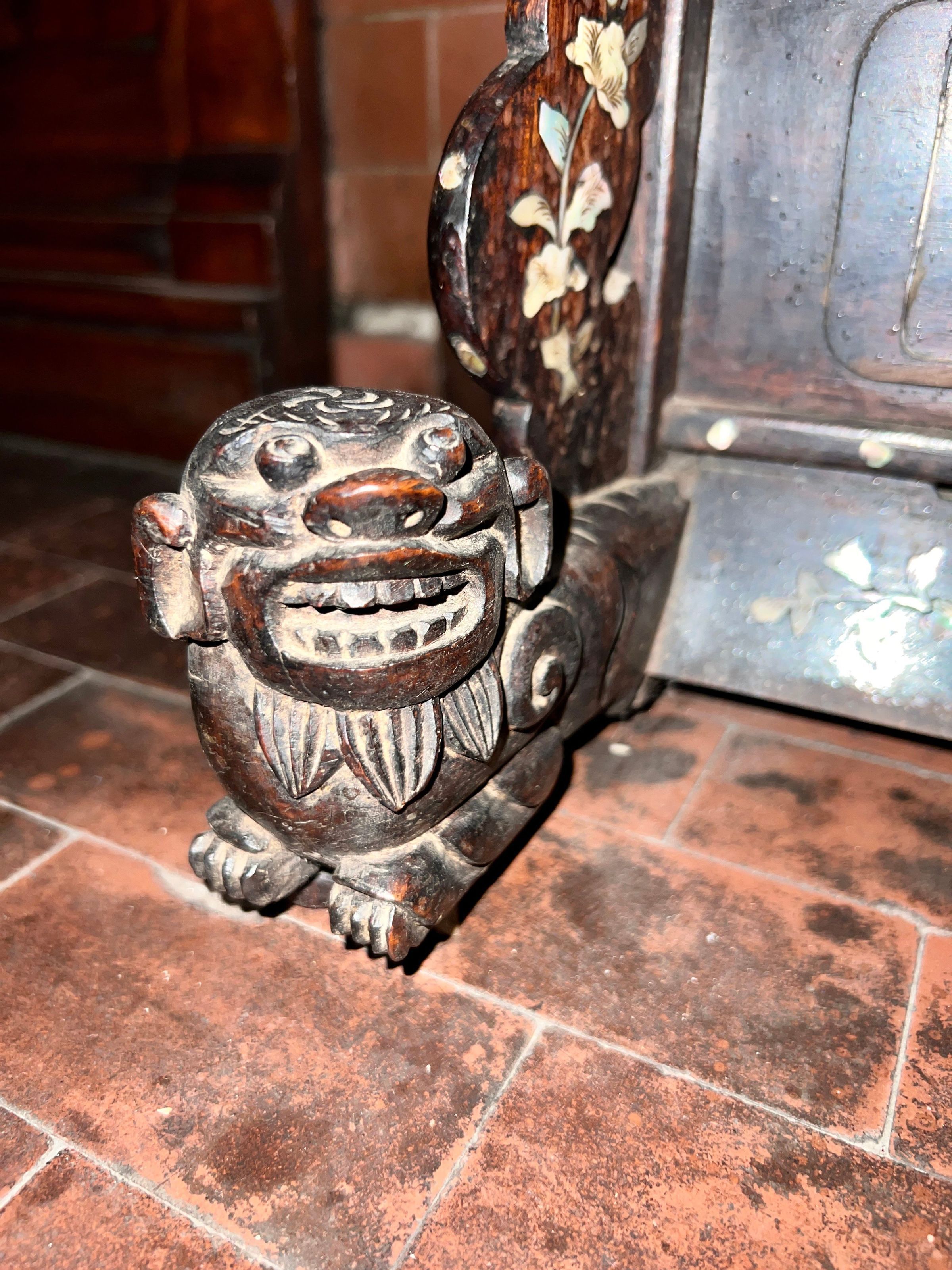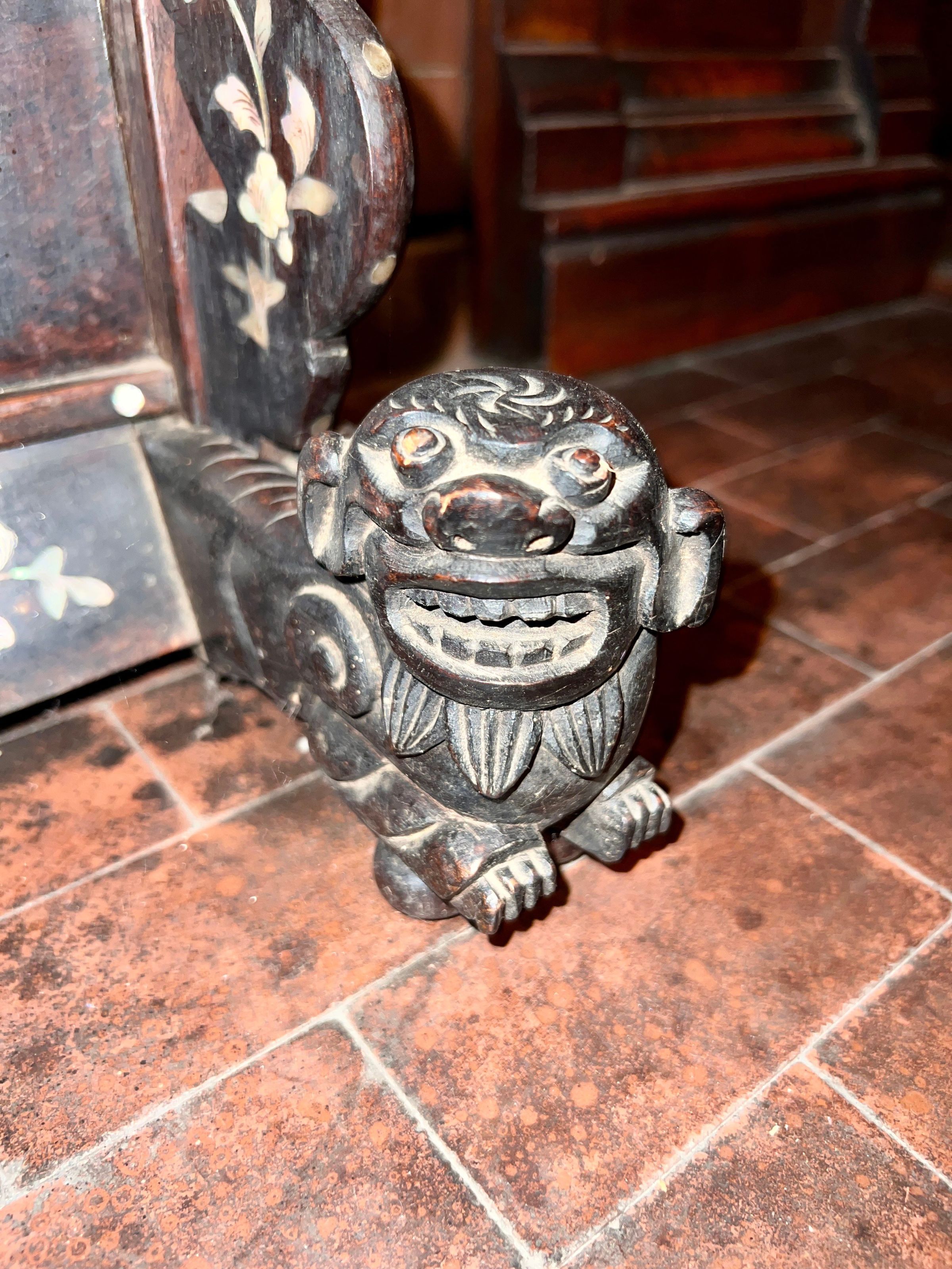 Chinese embroidered silk fire screen with mother of pearl filigree and vignettes inlay in carved ebony.
