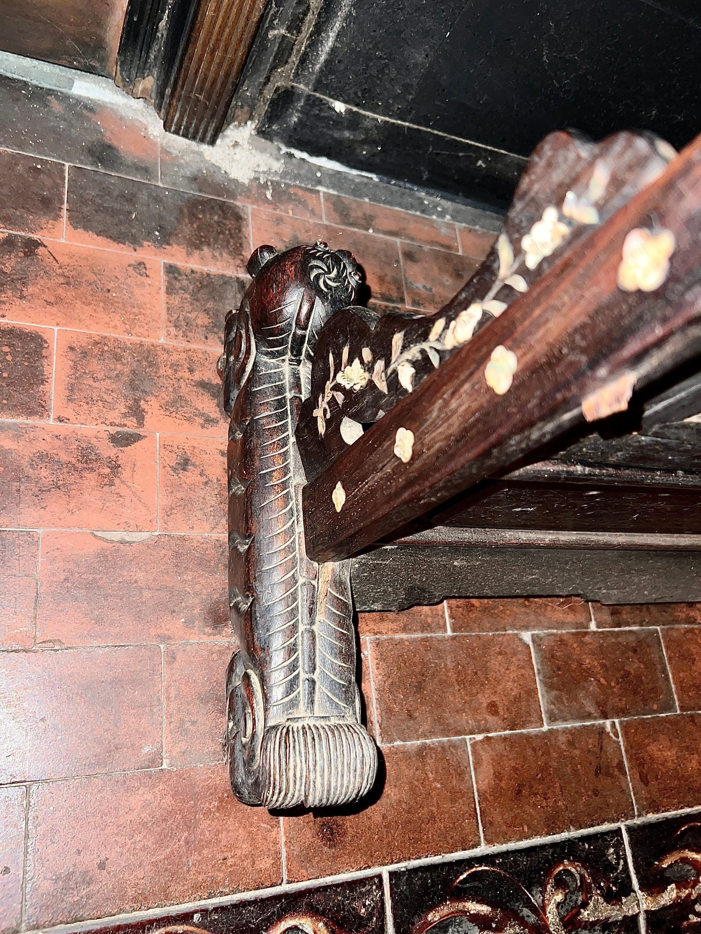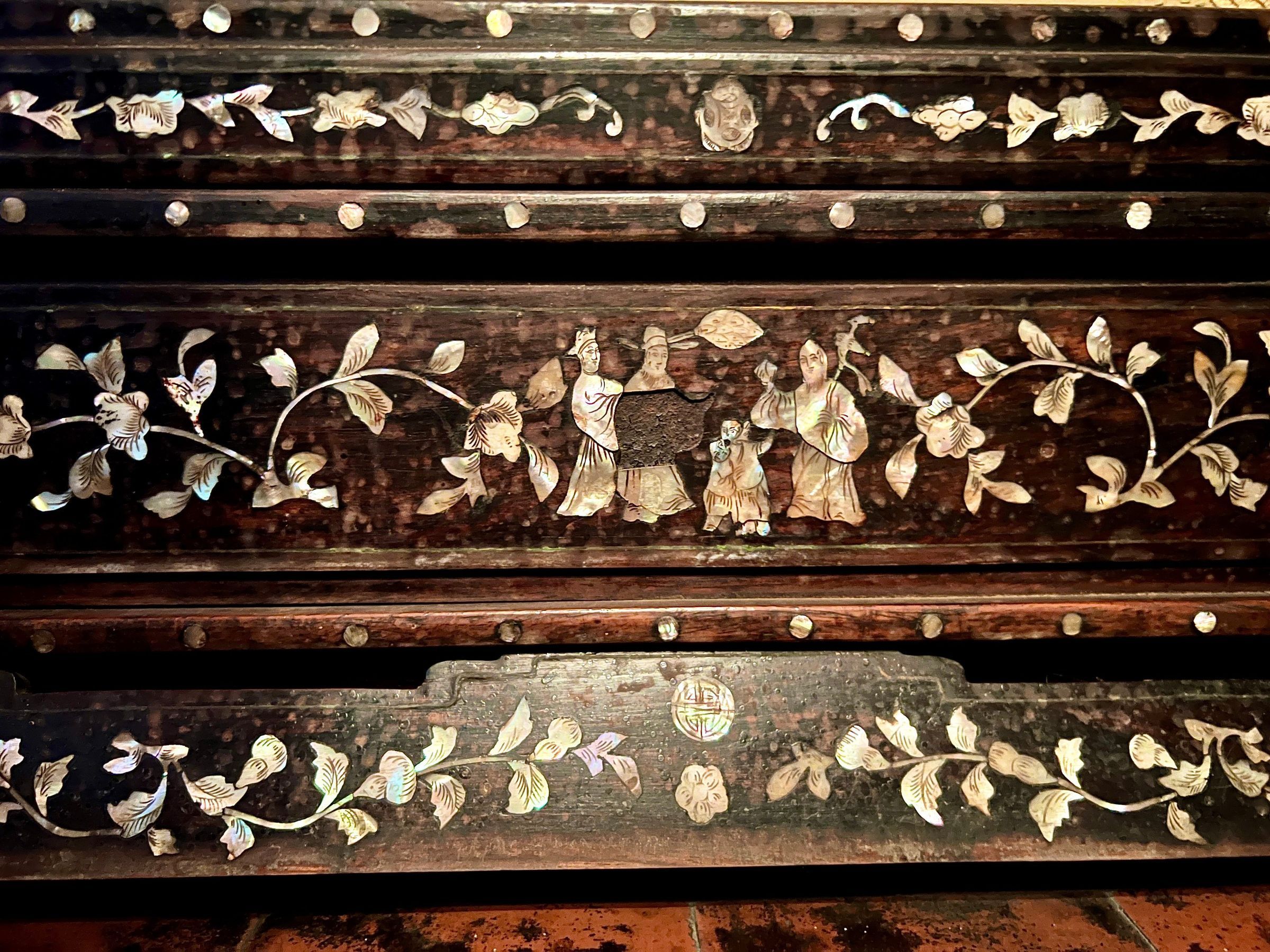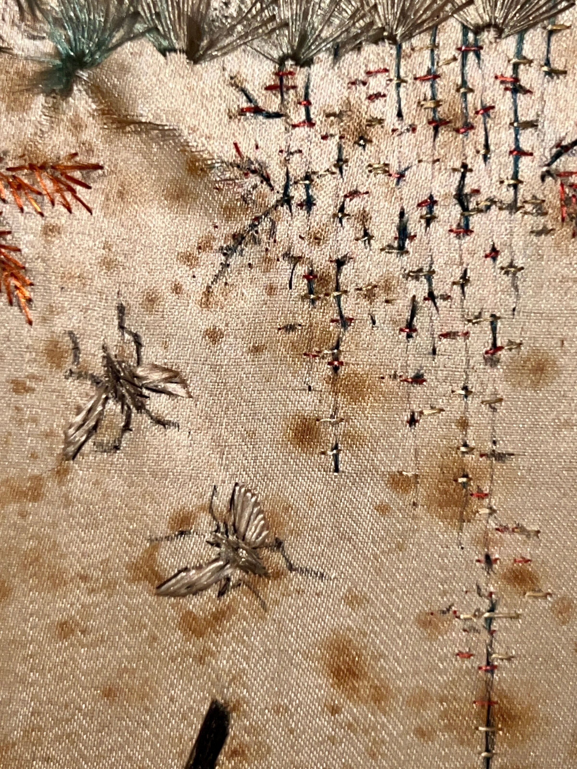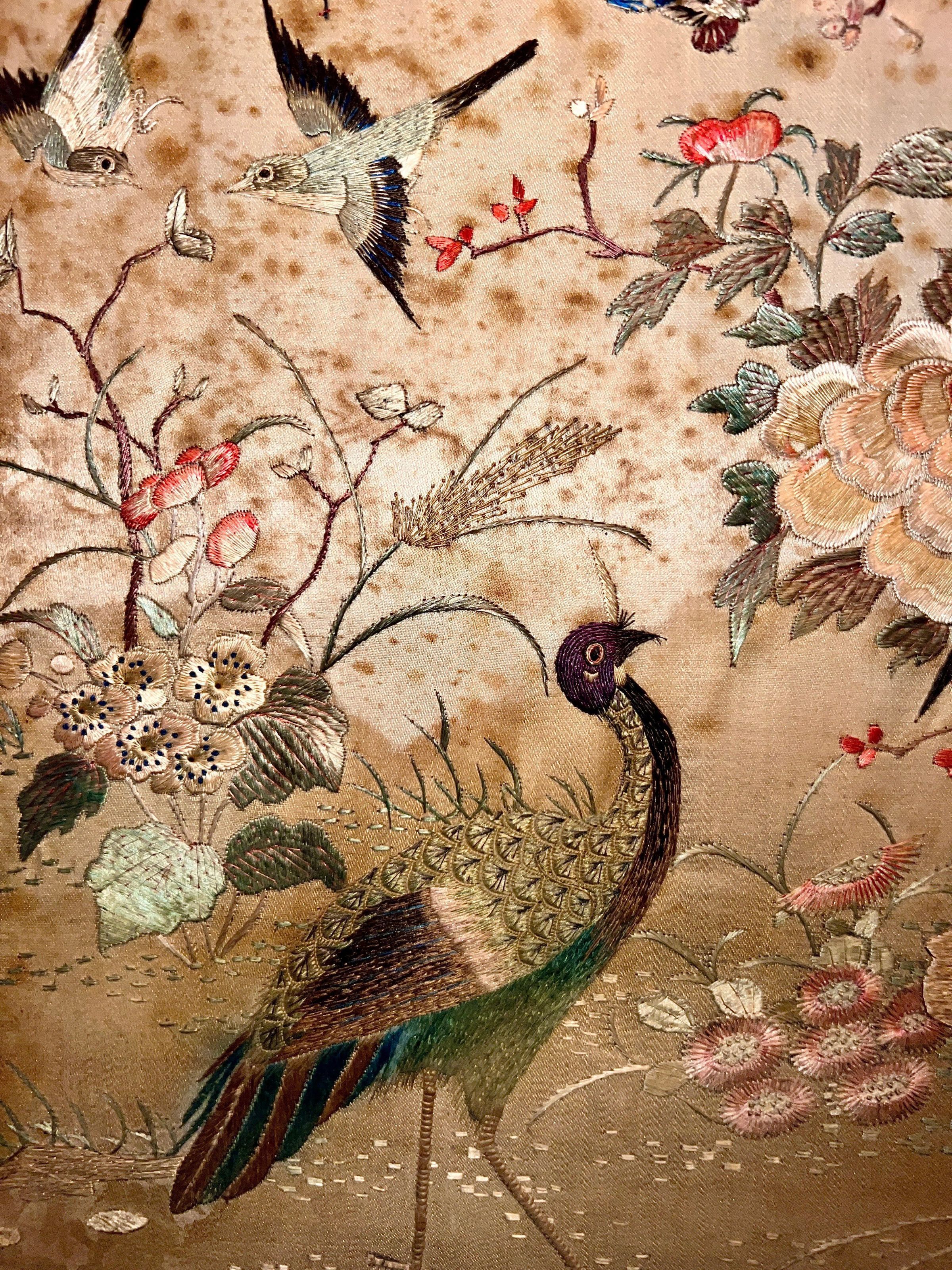 Chinese embroidered silk fire screen with mother of pearl filigree and vignettes inlay in carved ebony.
