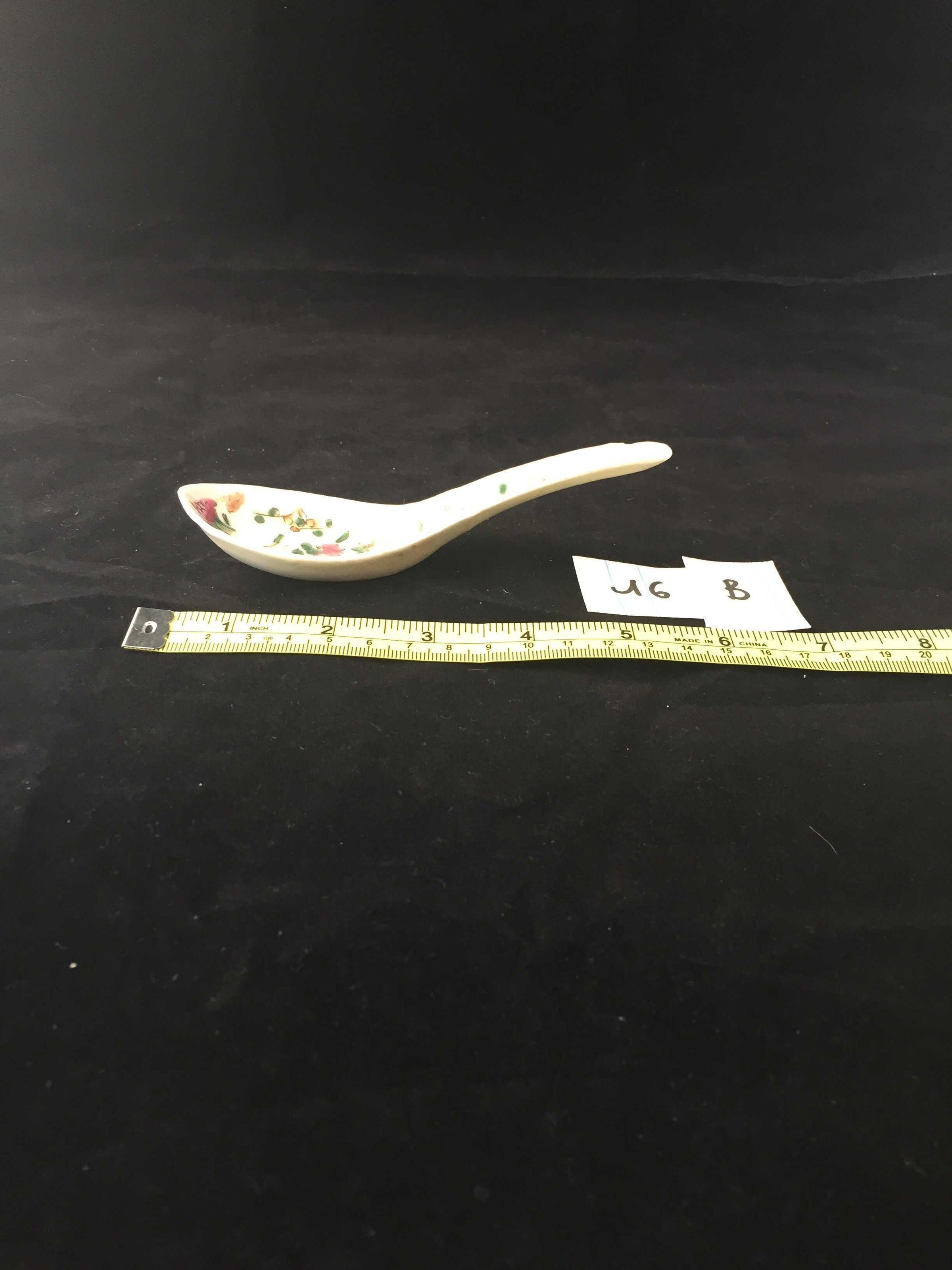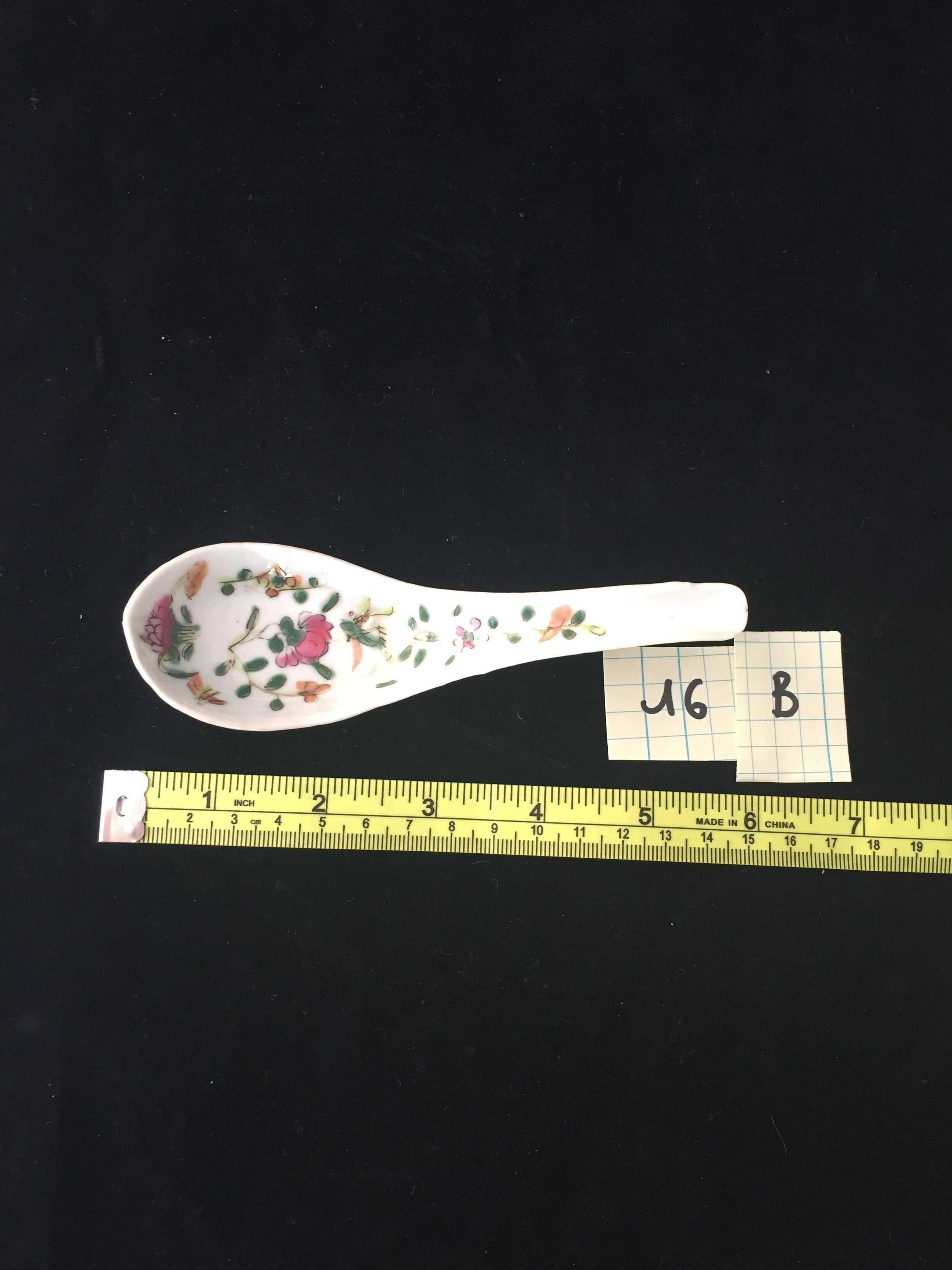 Blue, green and red floral design on face, blue and red floral design on base, scalloped rim, stoneware
