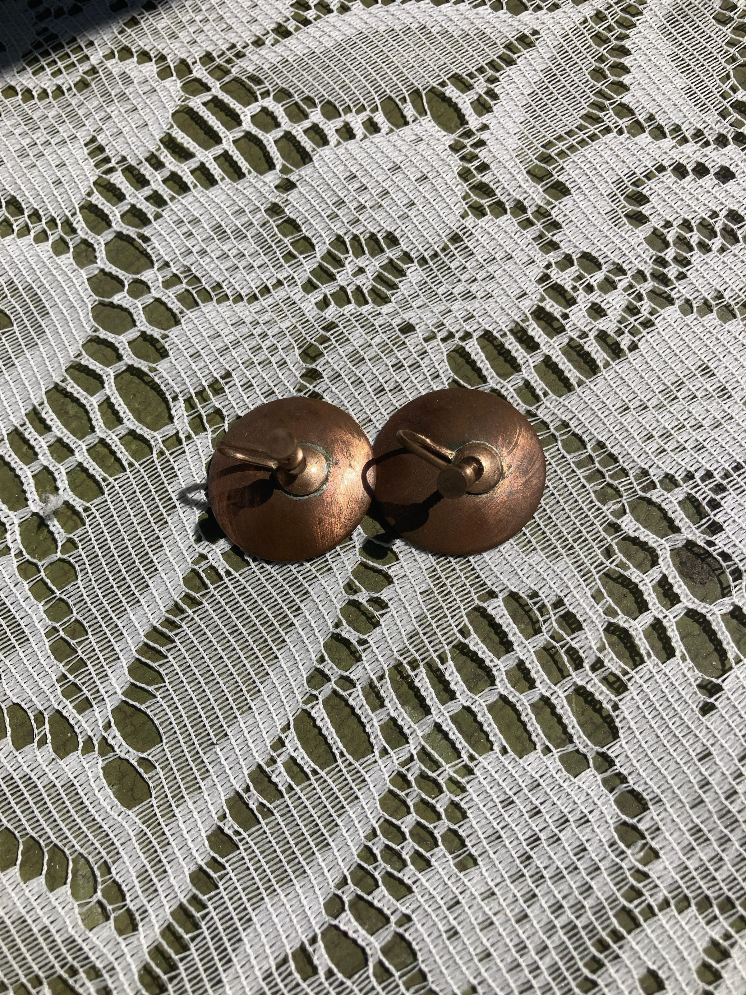Pair of screw back clip on earrings. Circular shaped, with blue, turquoise and gold flecks on the front. Copper colored on the back.Create Date