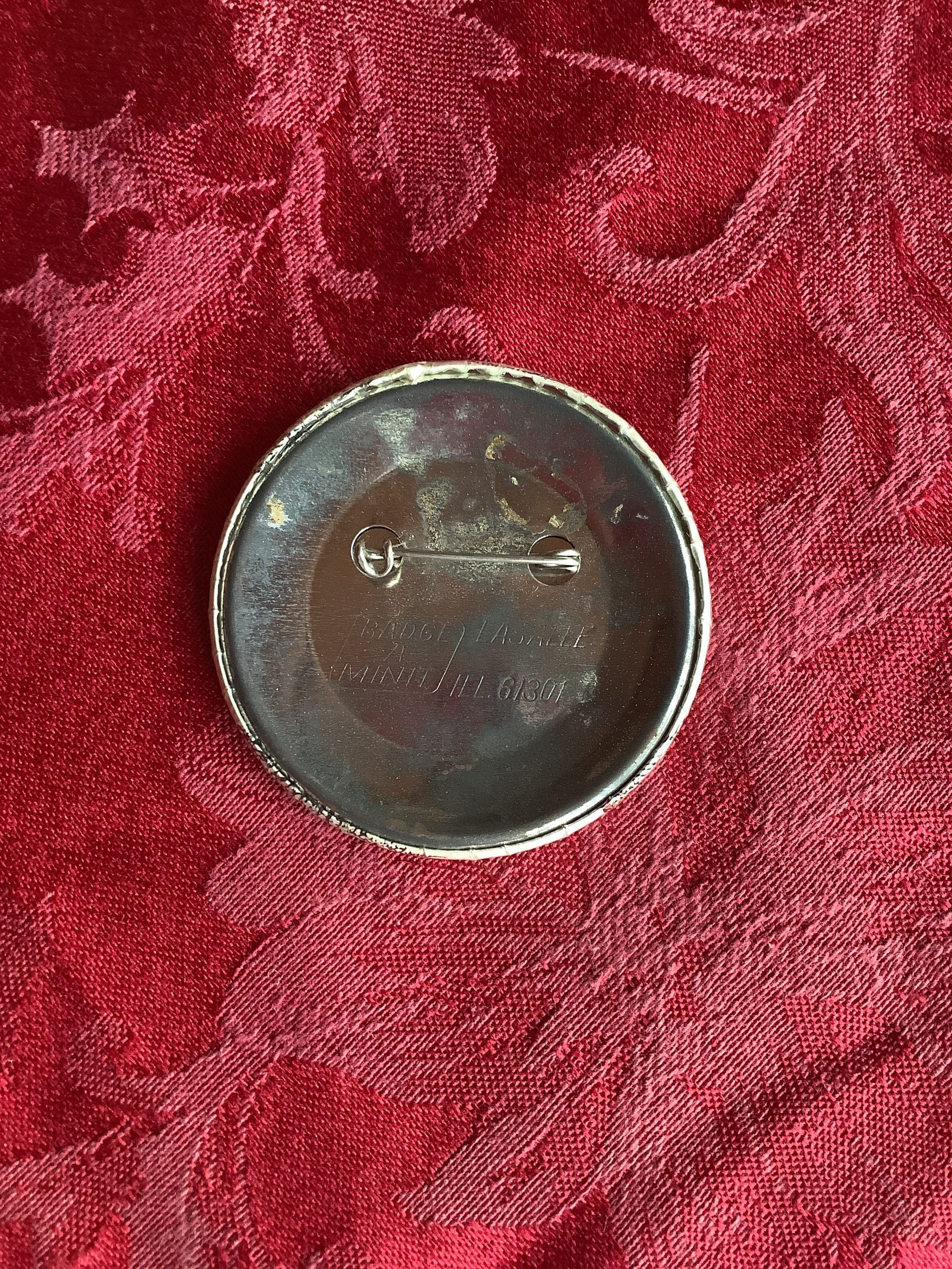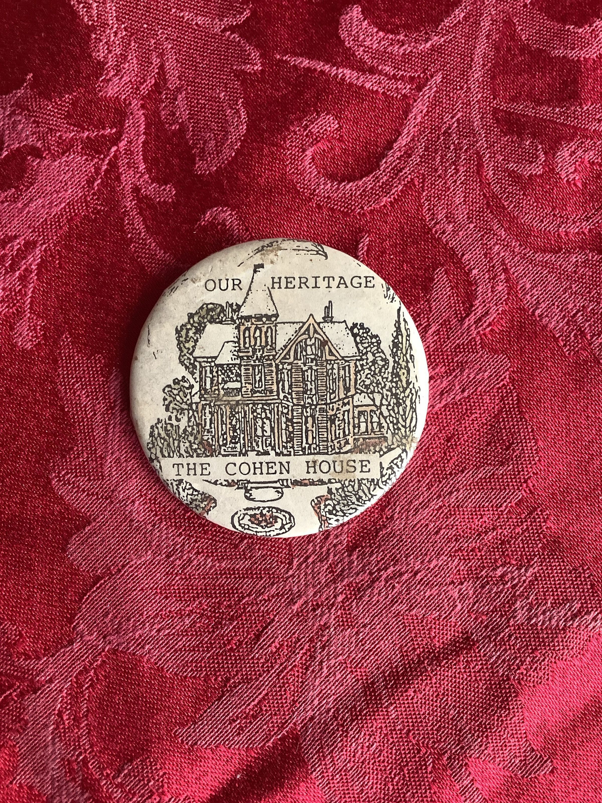 A small metal Cohen Bray House pin with the words “our heritage” on the front and an artistic rendering of the property.Mark, Engraving or Stamp