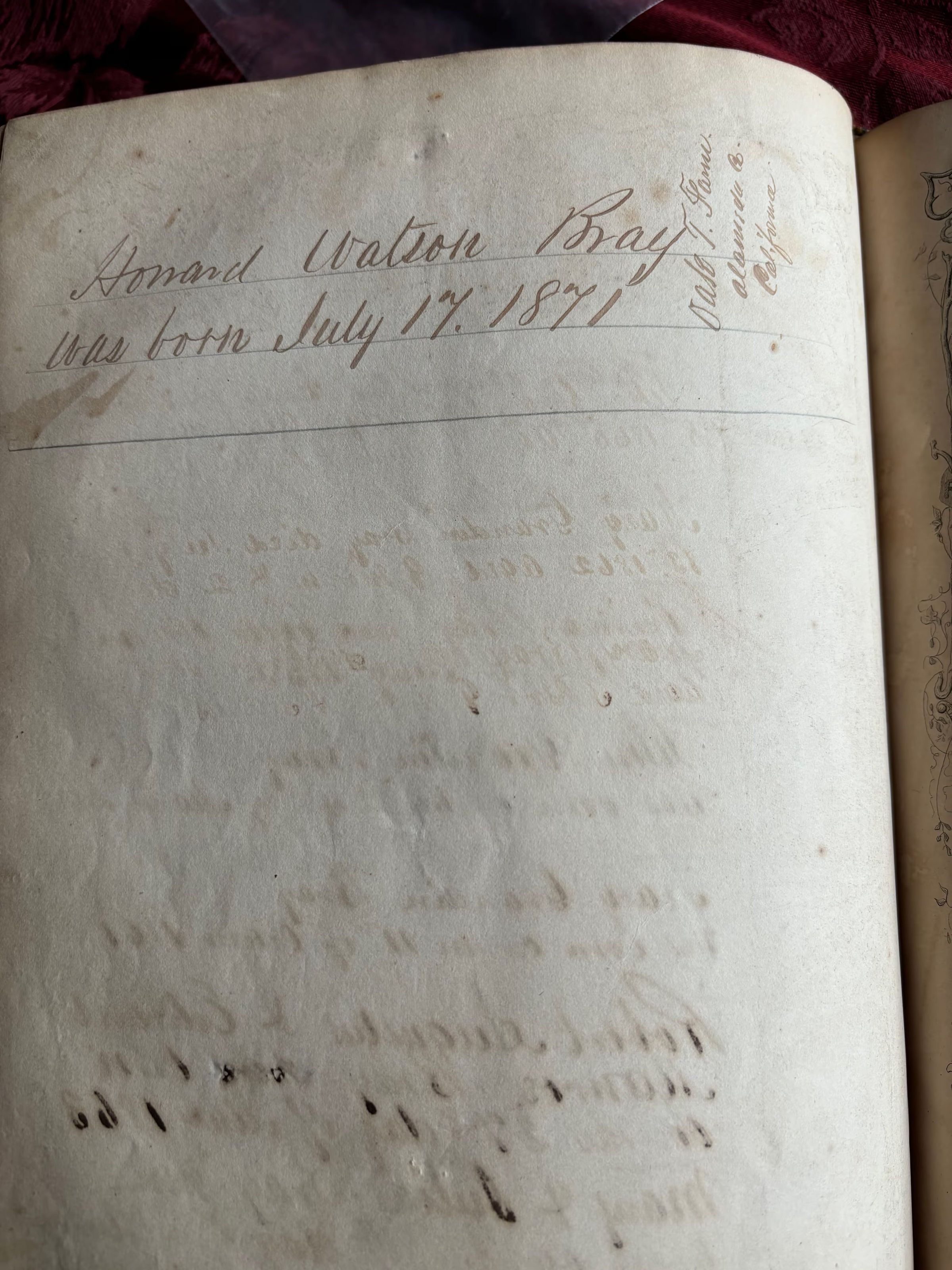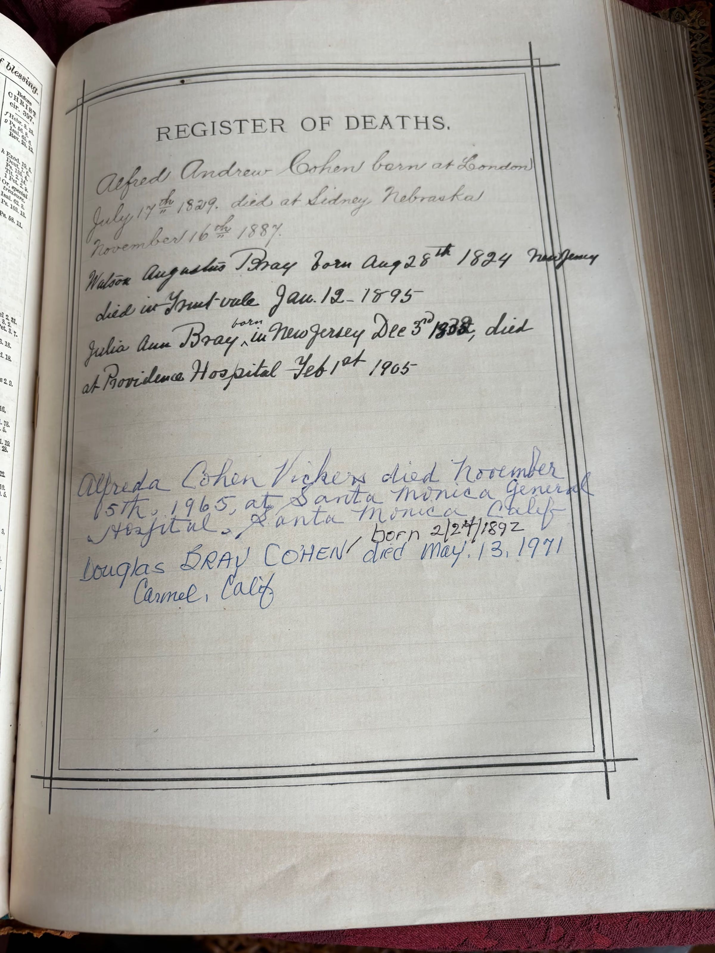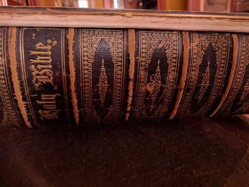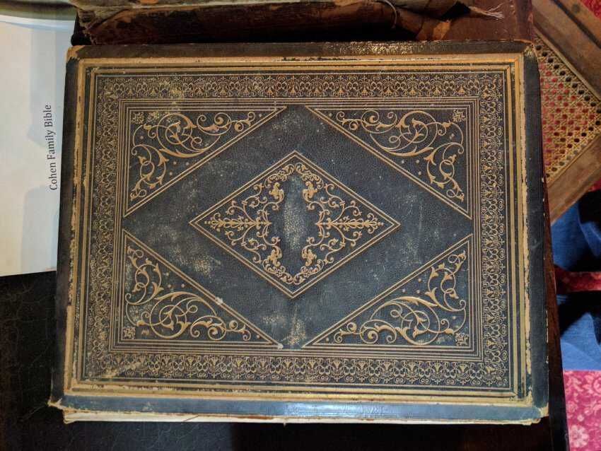 Cohen Family Bible dark blue(?) leather, cover is stamped with a design of a diamond inside a diamond inside a rectangle with a rectangular boarder around the edge of the cover. Areas are decorated with curlicues, heart shapes, and almost floral-like designs, the border has a set of repeating circles with curlicues. "Holy Bible" is stamped in gold on the spine along with a series of stacked rectangles heavily decorated with curlicues.Collection
