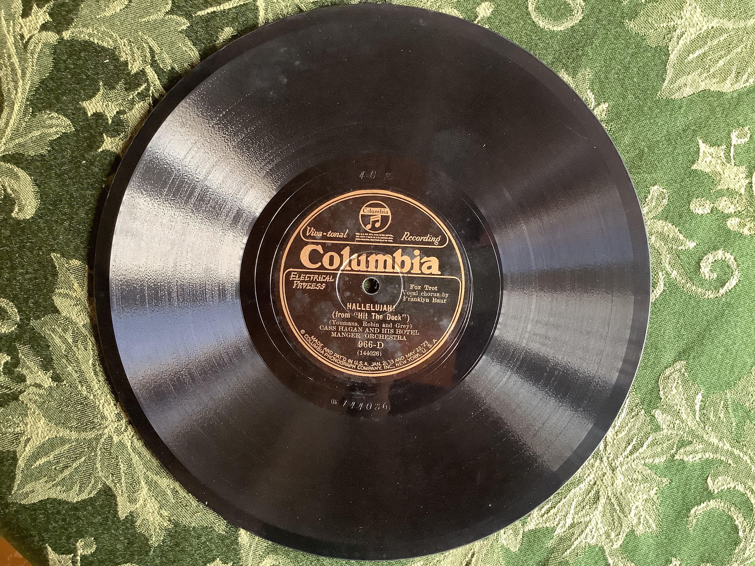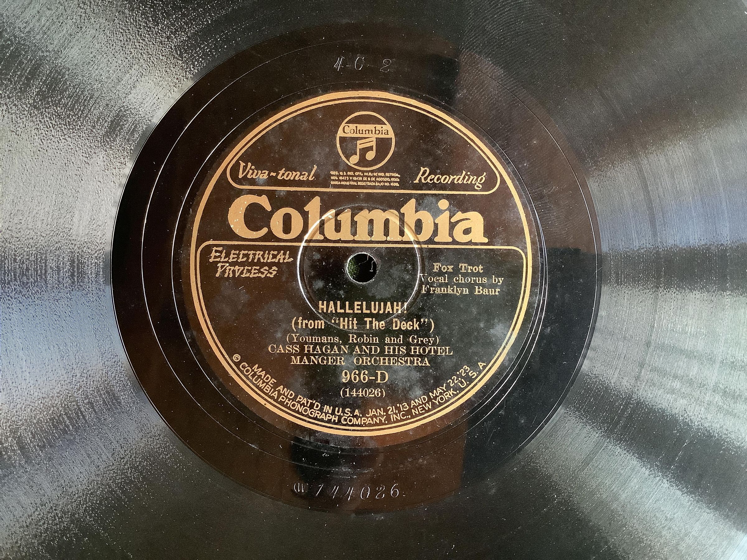 Side A: Hallelujah! from "Hit the Deck". Youmans, Robin and Grey. Fox Trot, Vocal chorus by Franklyn Baur. Cass Hagan and his Hotel Manger Orchestra. 966-D (144026).