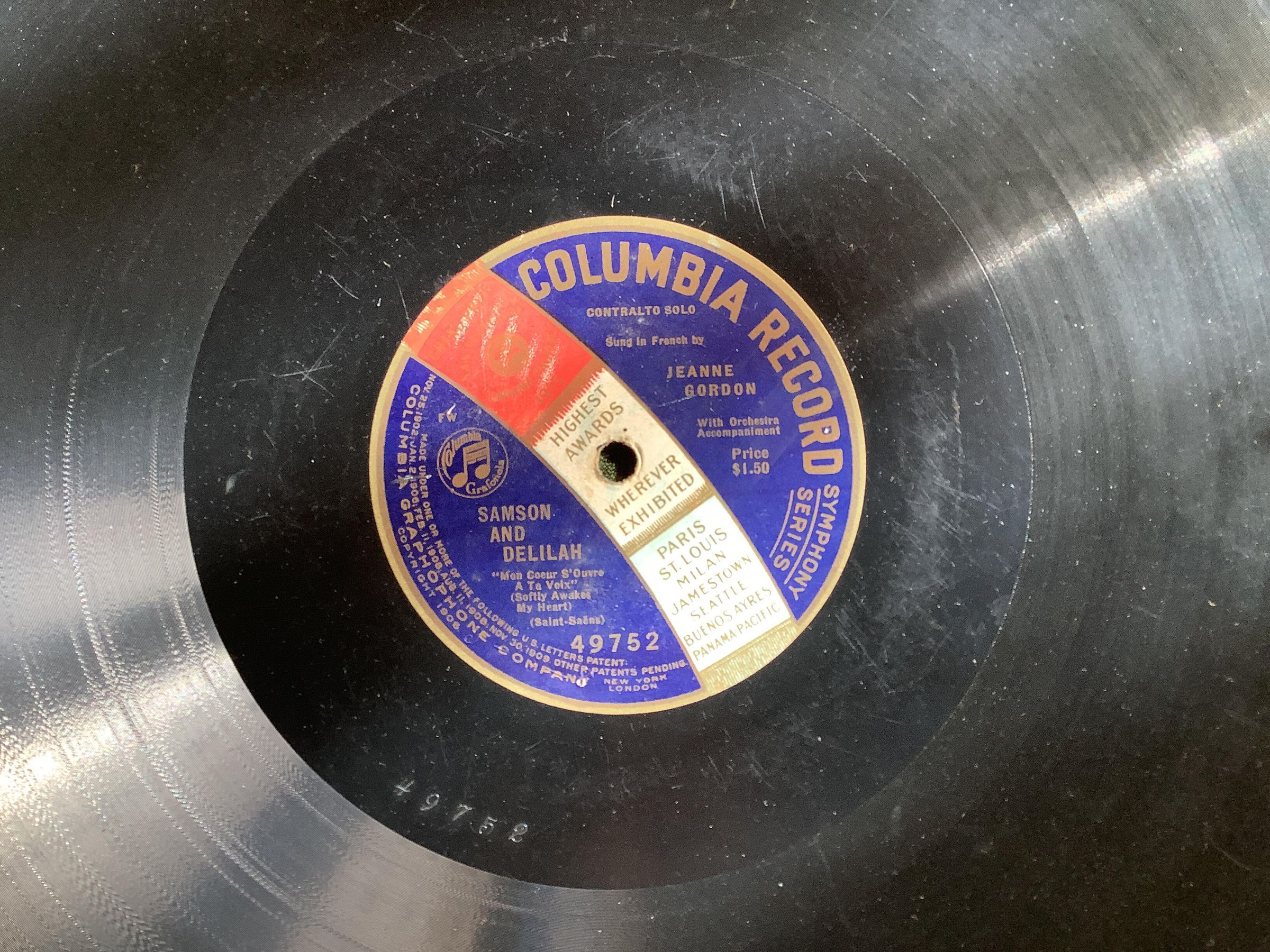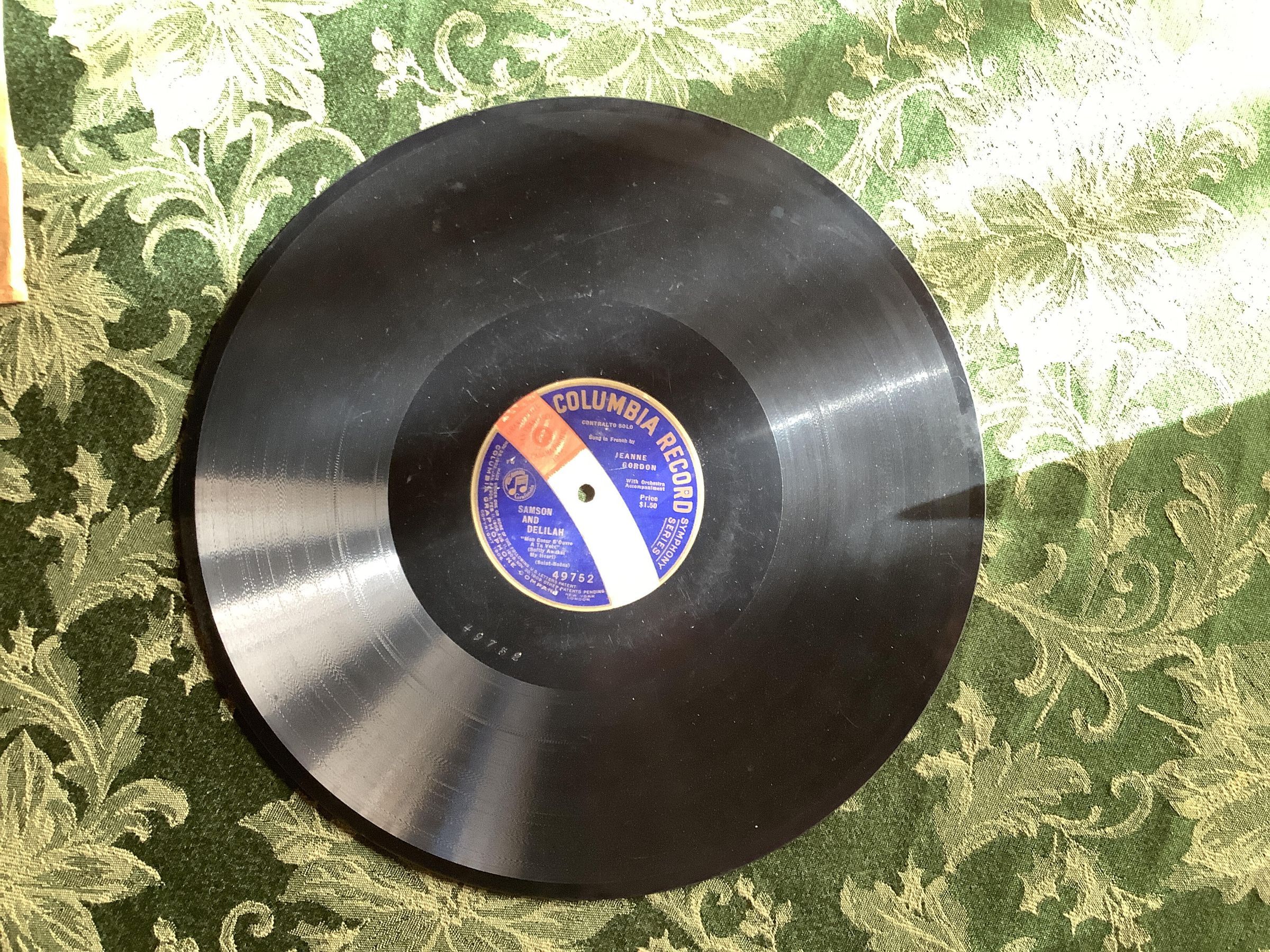 Columbia Record, Symphony Series. Contralto Solo Sung in French by Jeanne Gordon with Orchestra Accompaniment. Price $1.50. Samson and Delilah (Opera), "Mon Coeur S'Ouvre A Ta Voix" (Softly Awakes My Heart) Saint-Saëns. 49752.Create Date