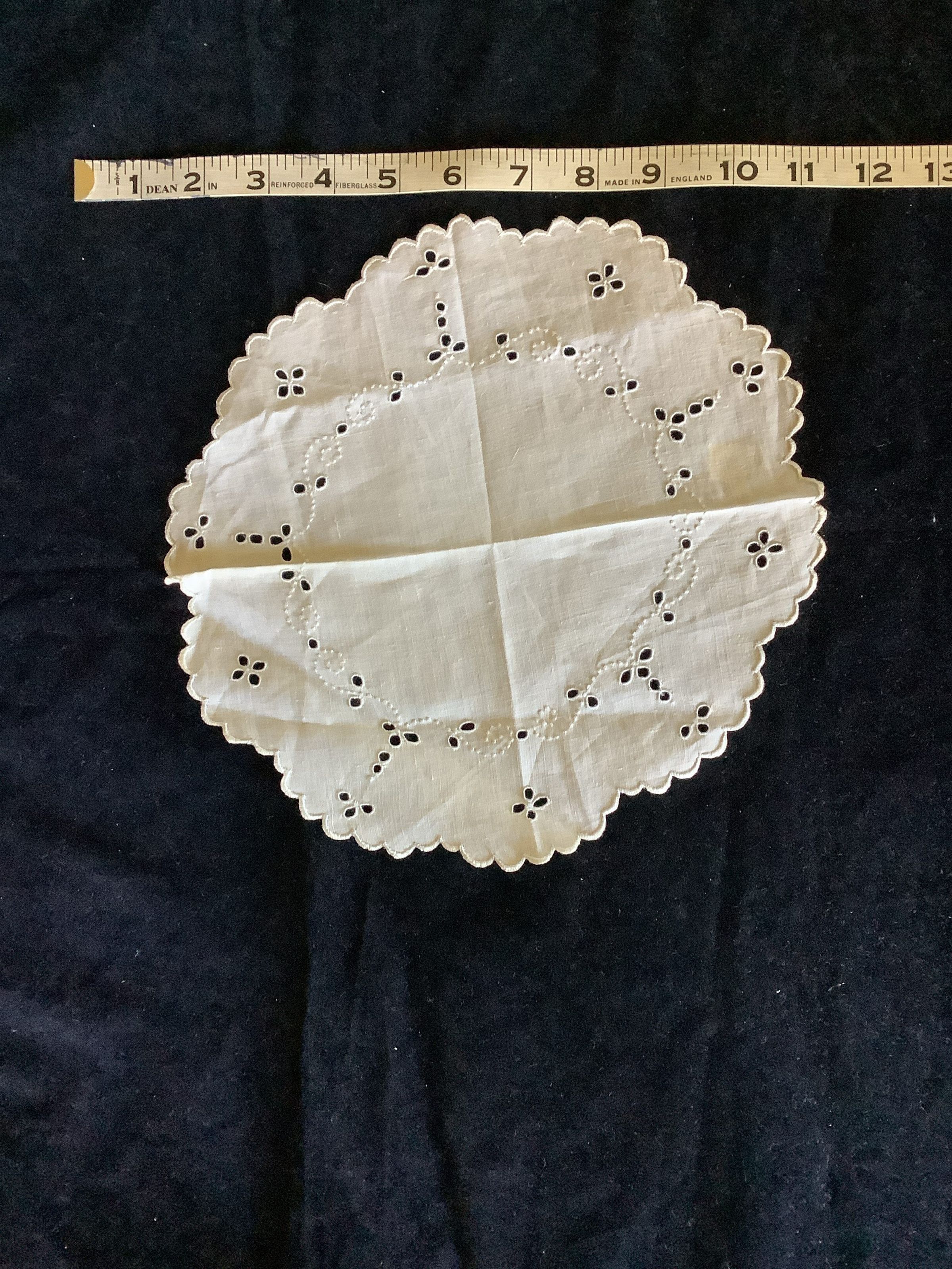 This is a round cotton doily with embroidery and drawn designs. On the back there is yellow residue left over from a price tag