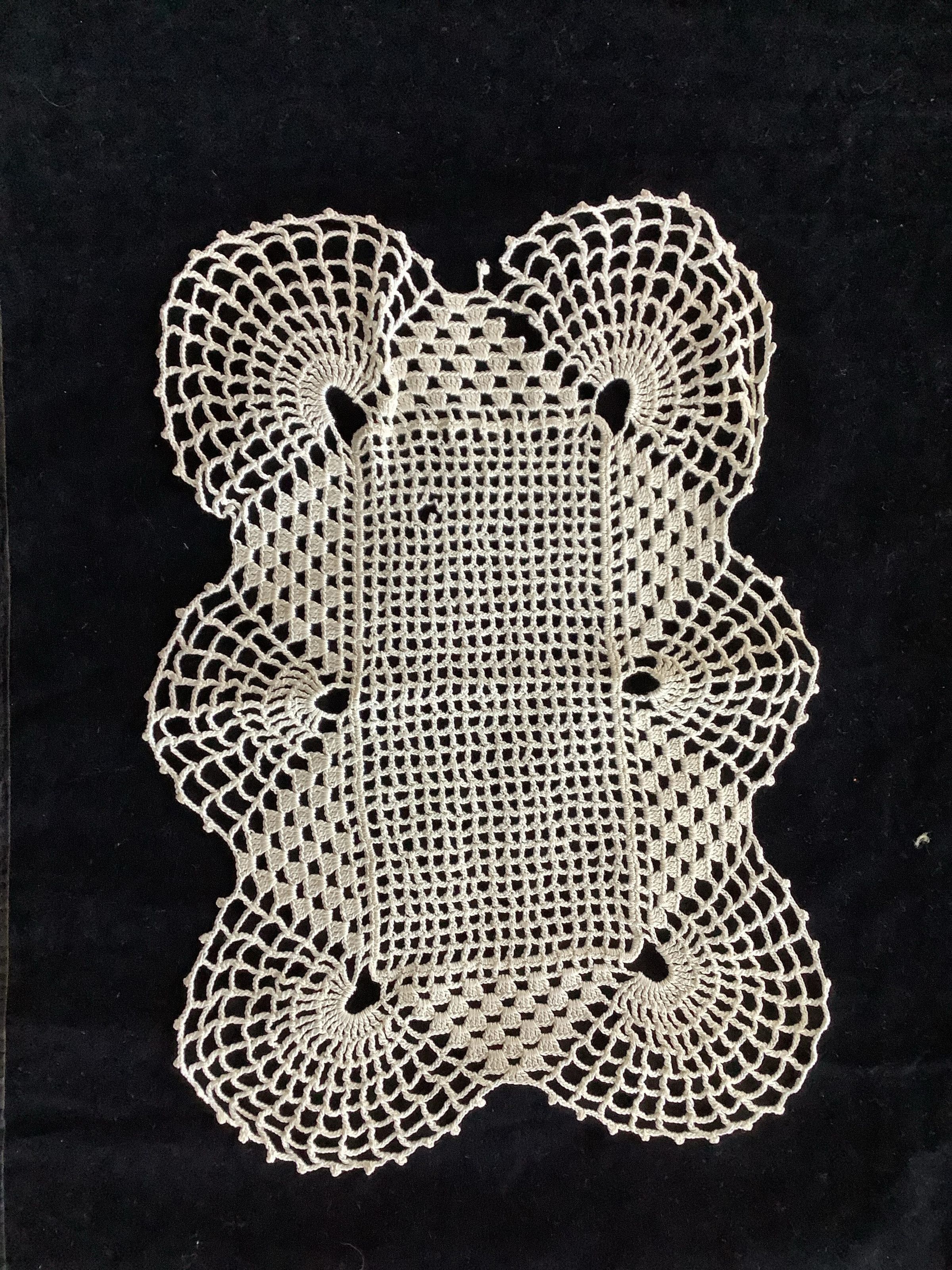 This is a rectangle doily made from crocheted thread.