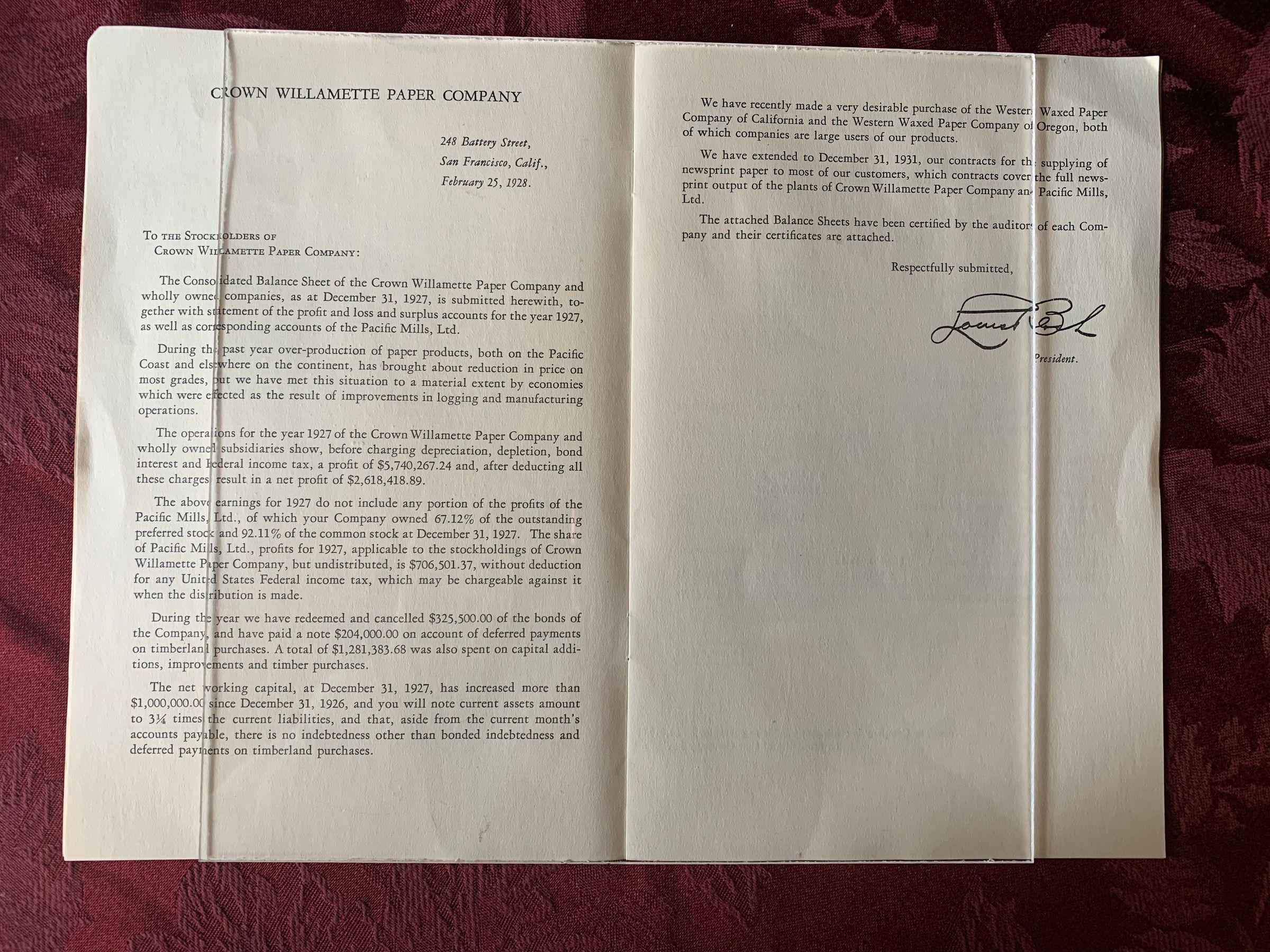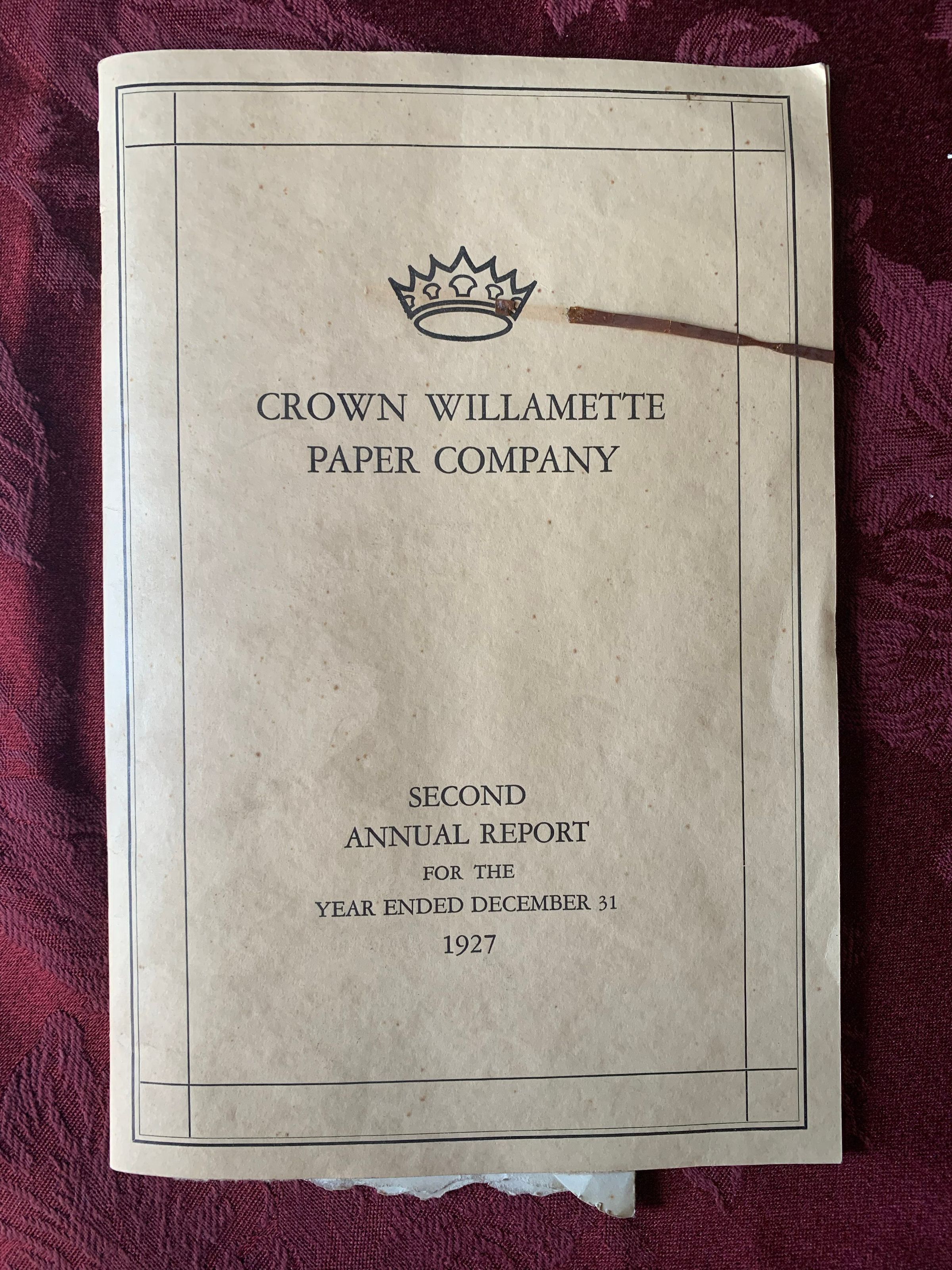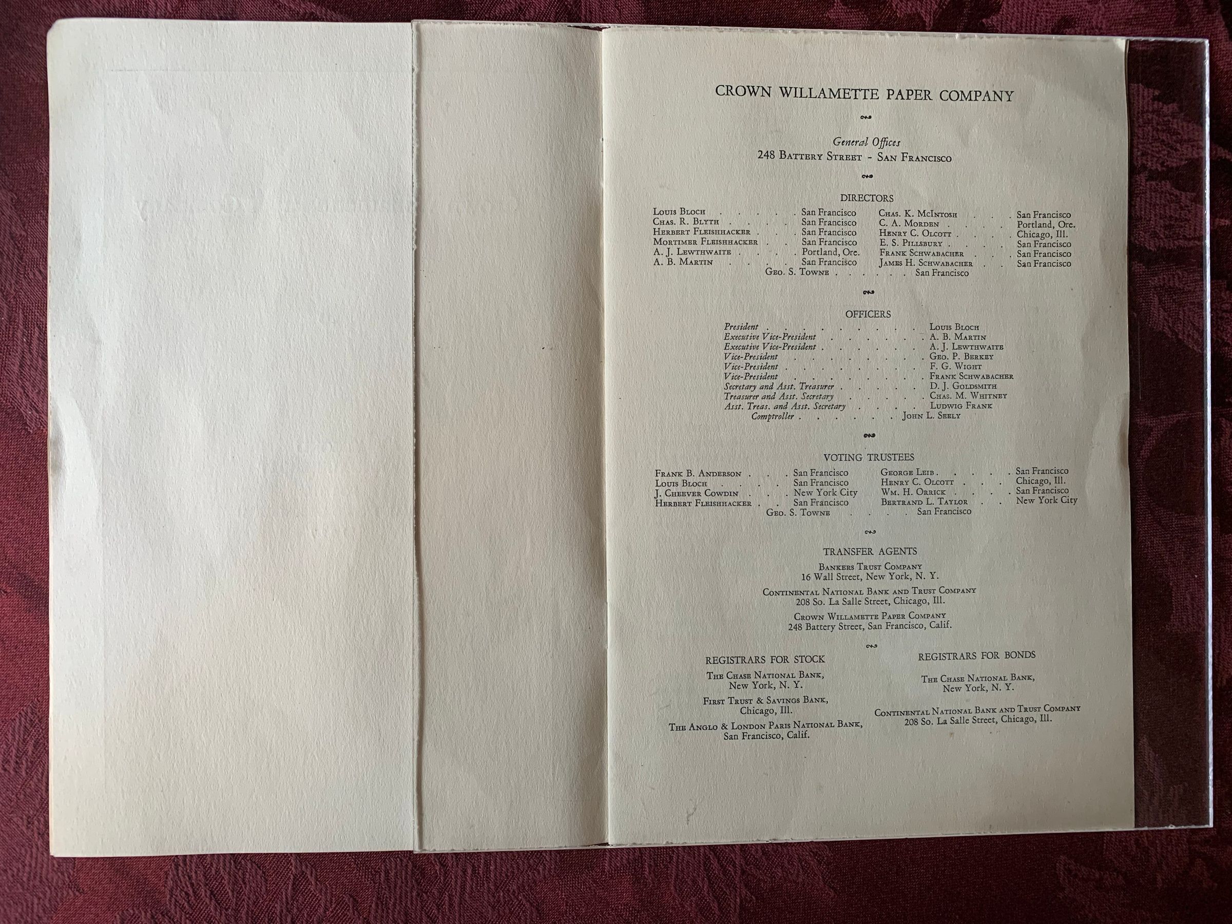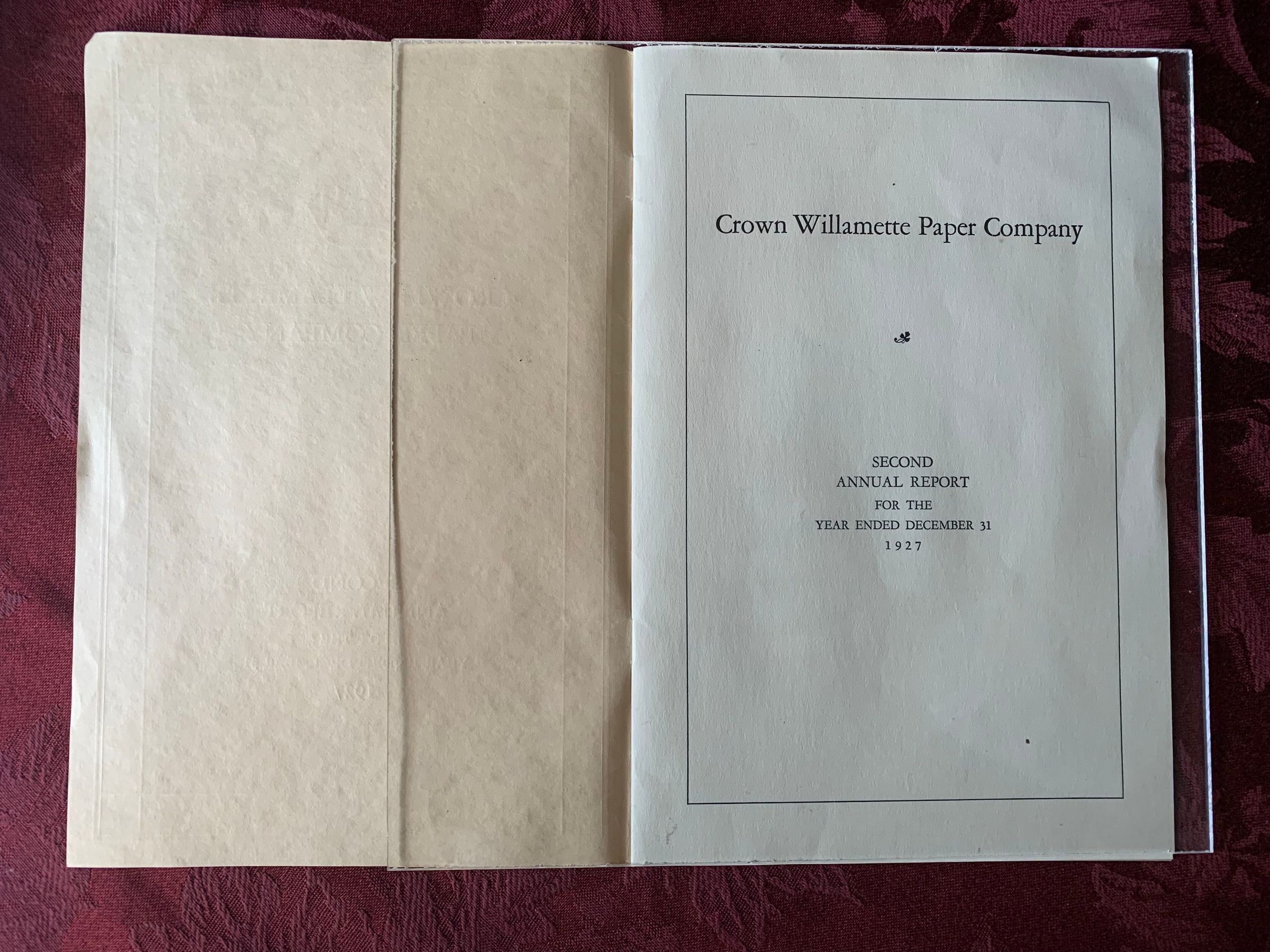 This is a report from Crown Willamette Paper Company for their stock holders. It has information on their offices and balance sheets for the year. It also includes profit and loss accounts.Create Date