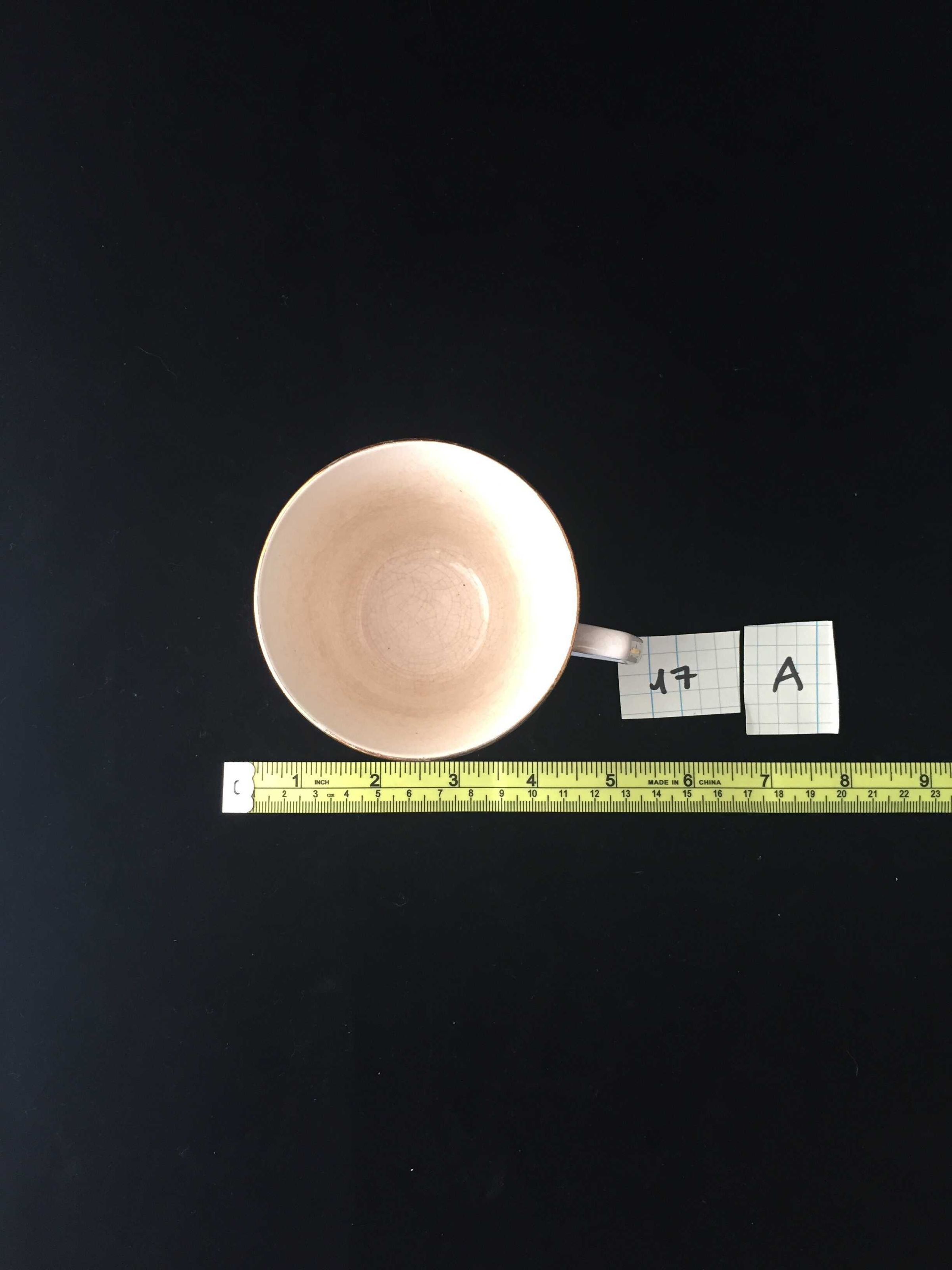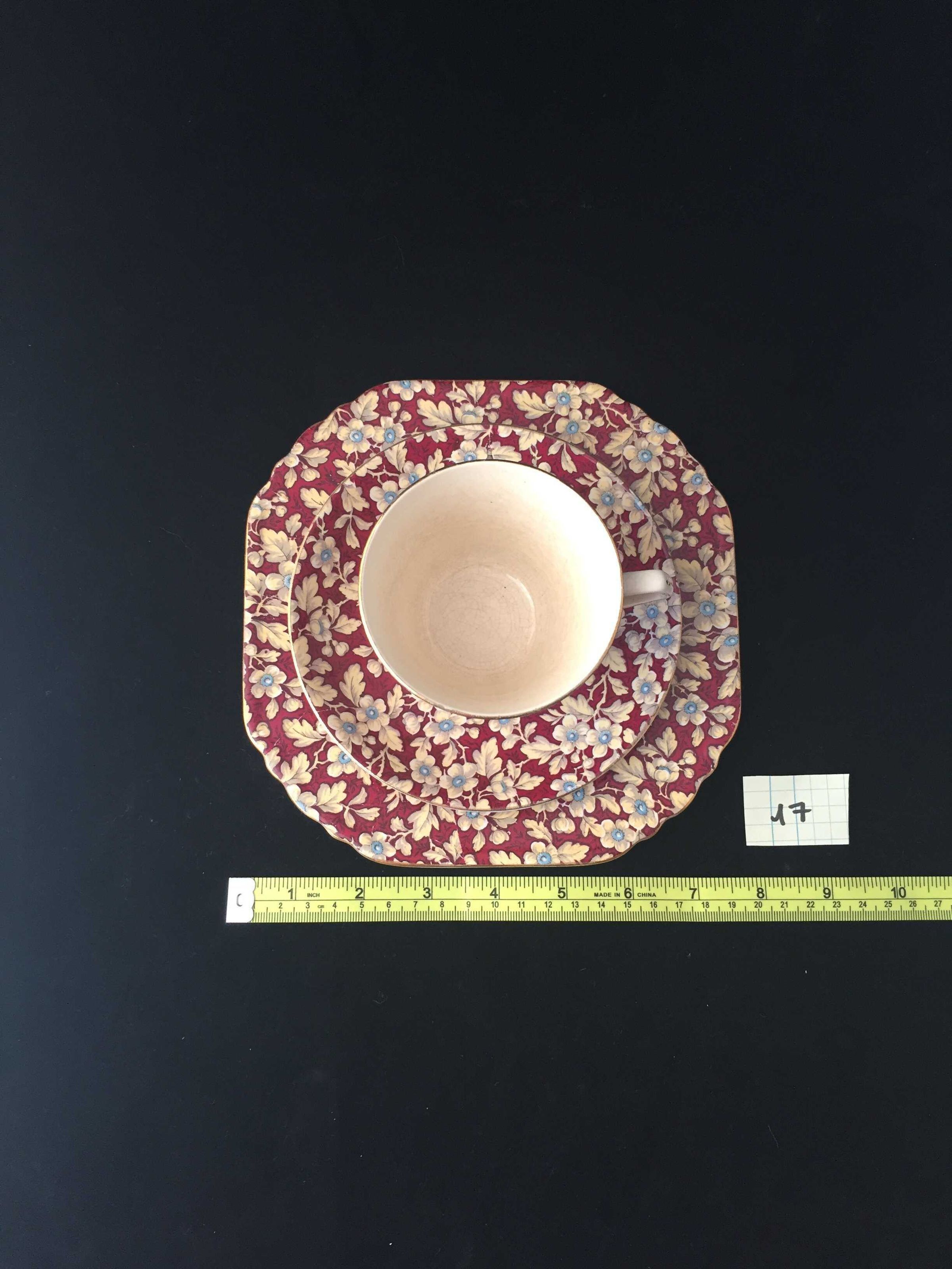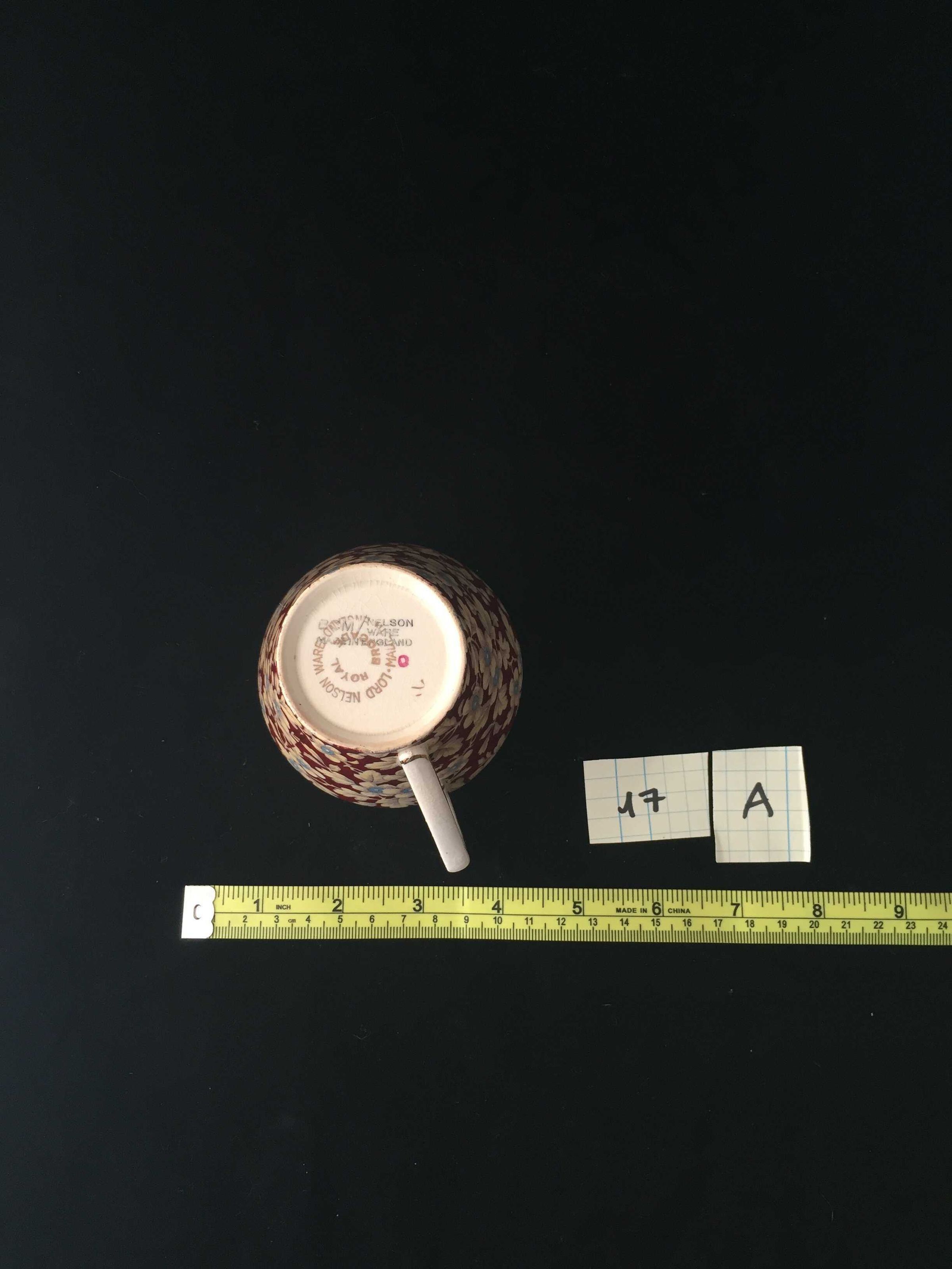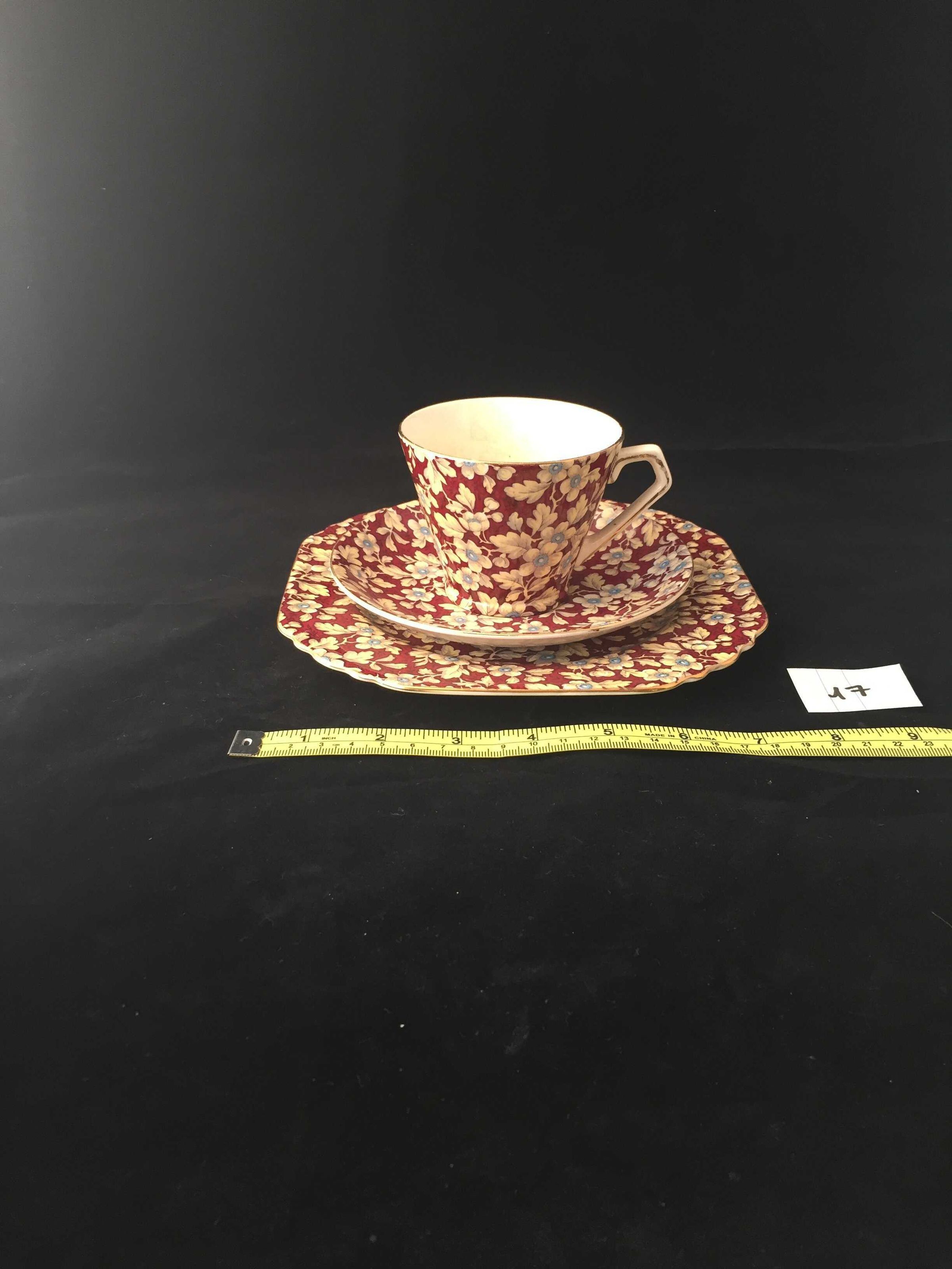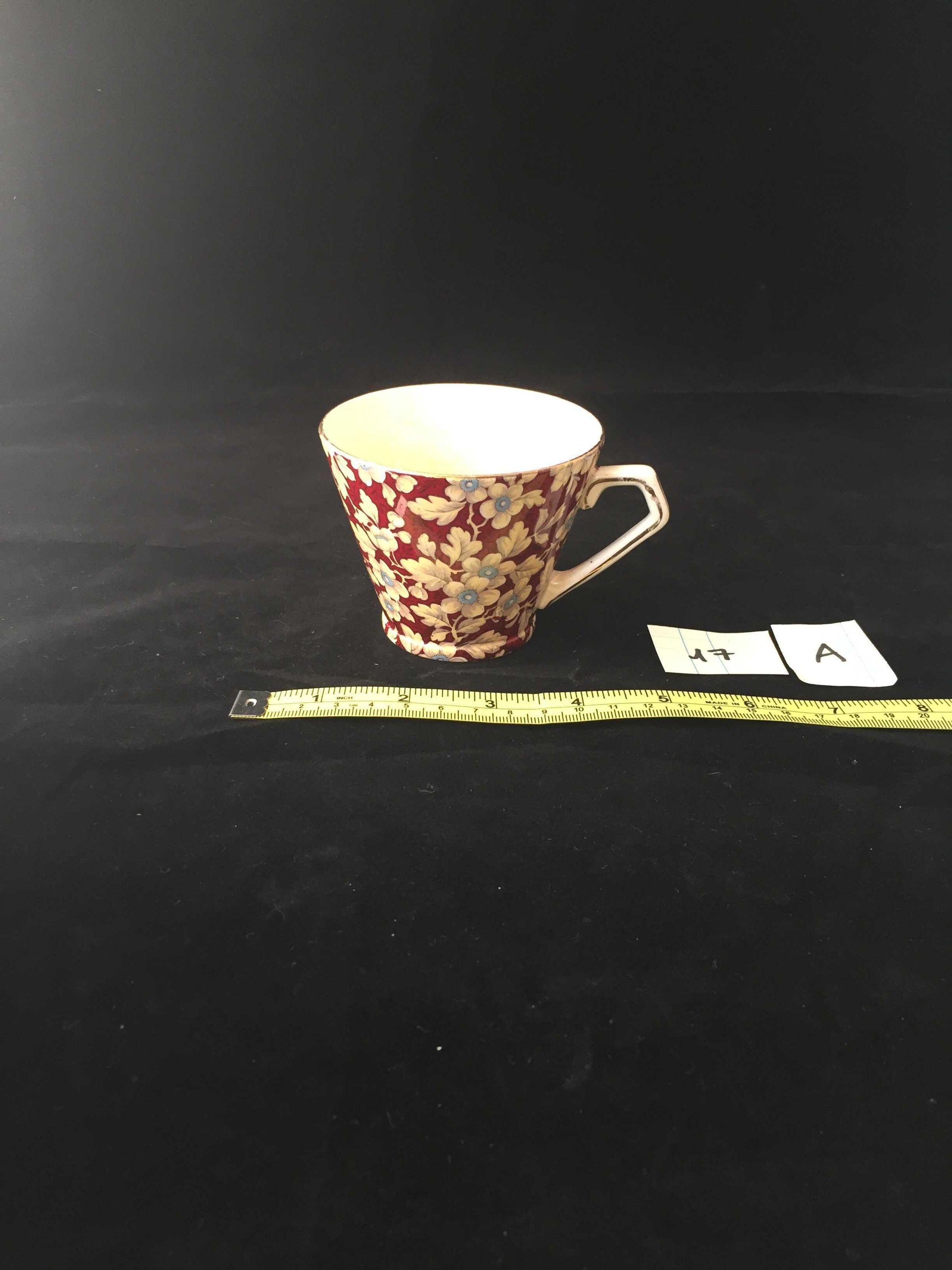Red base with yellow and blue floral design, white handle with gold leaf line design