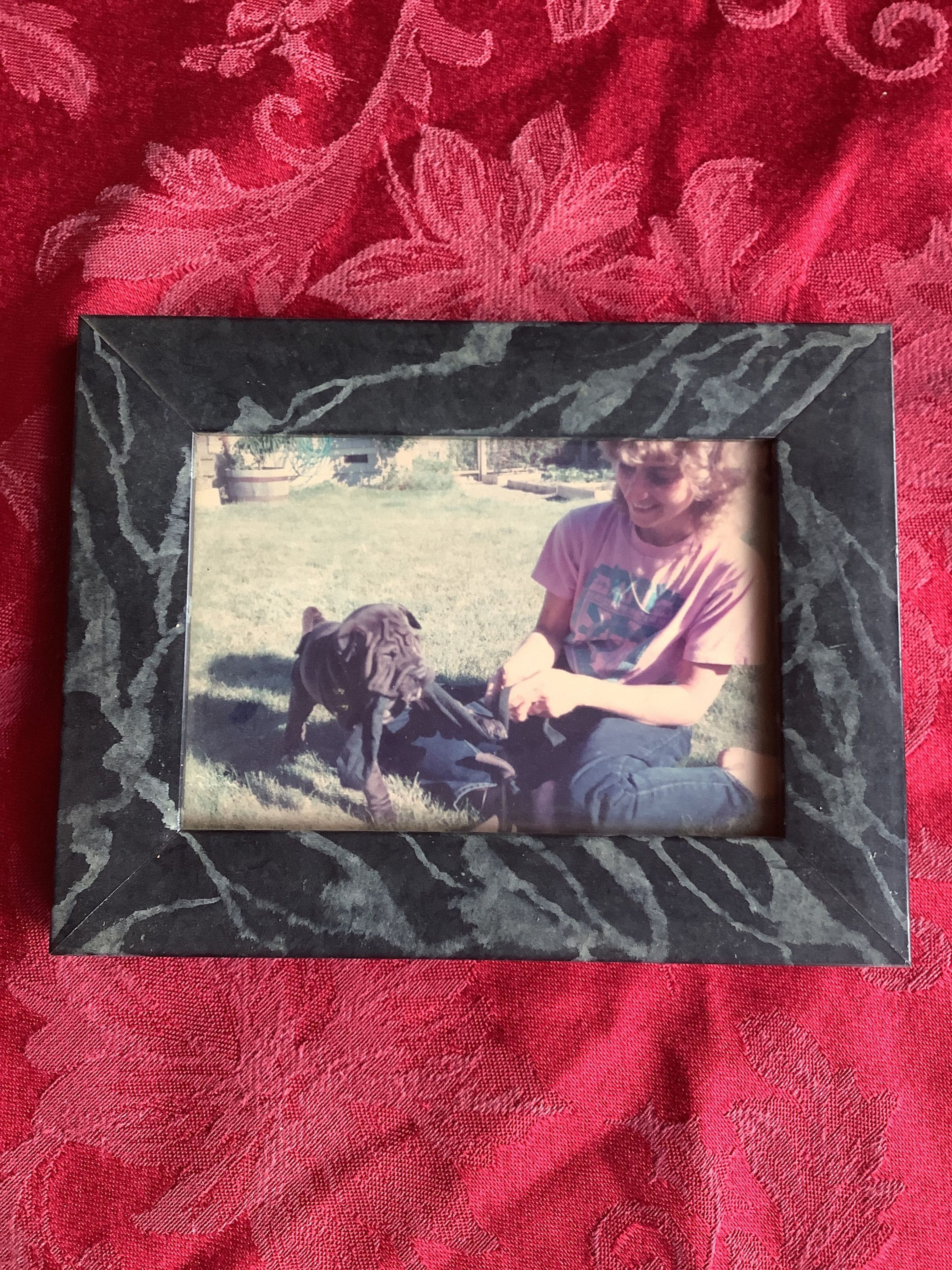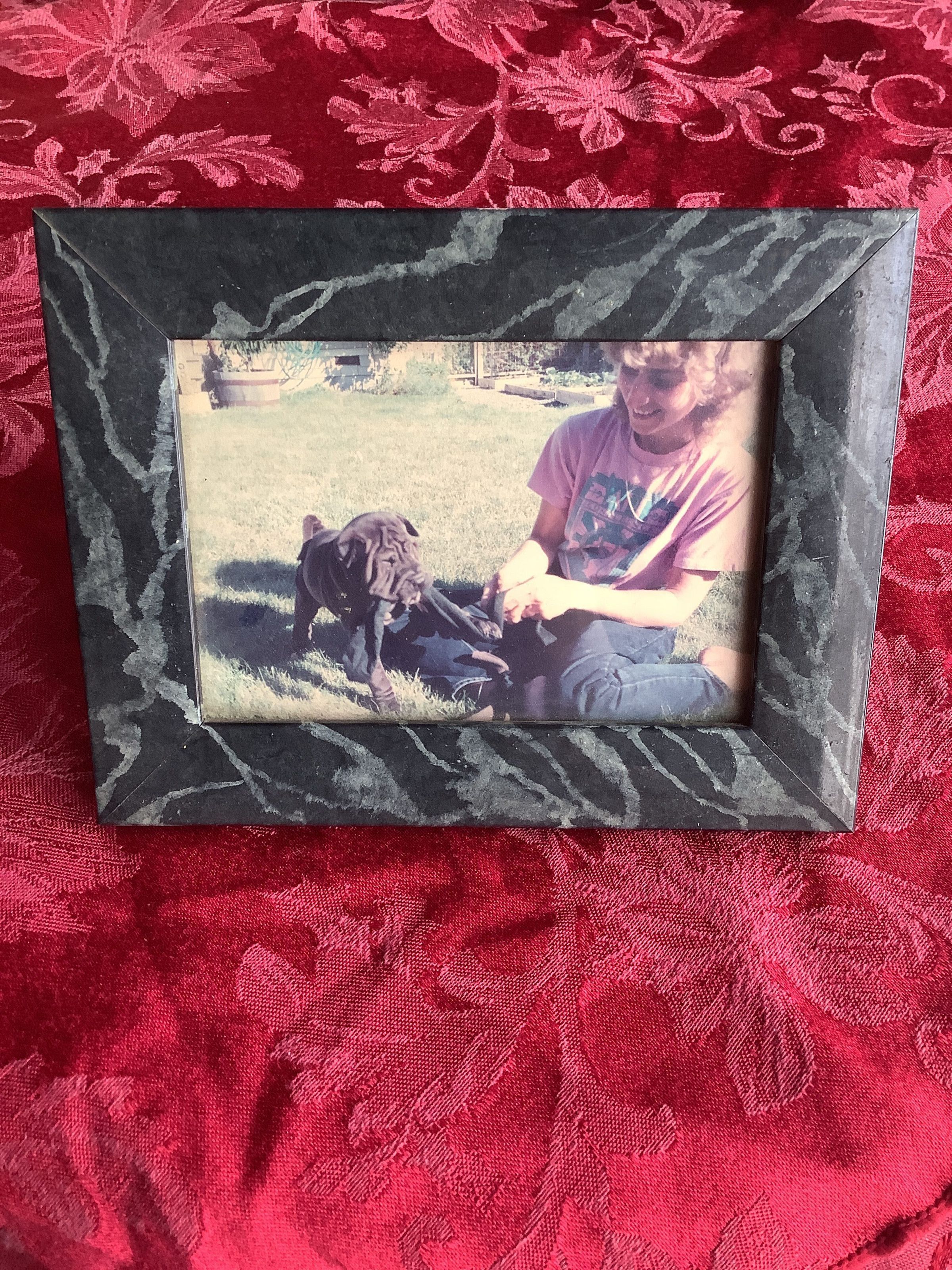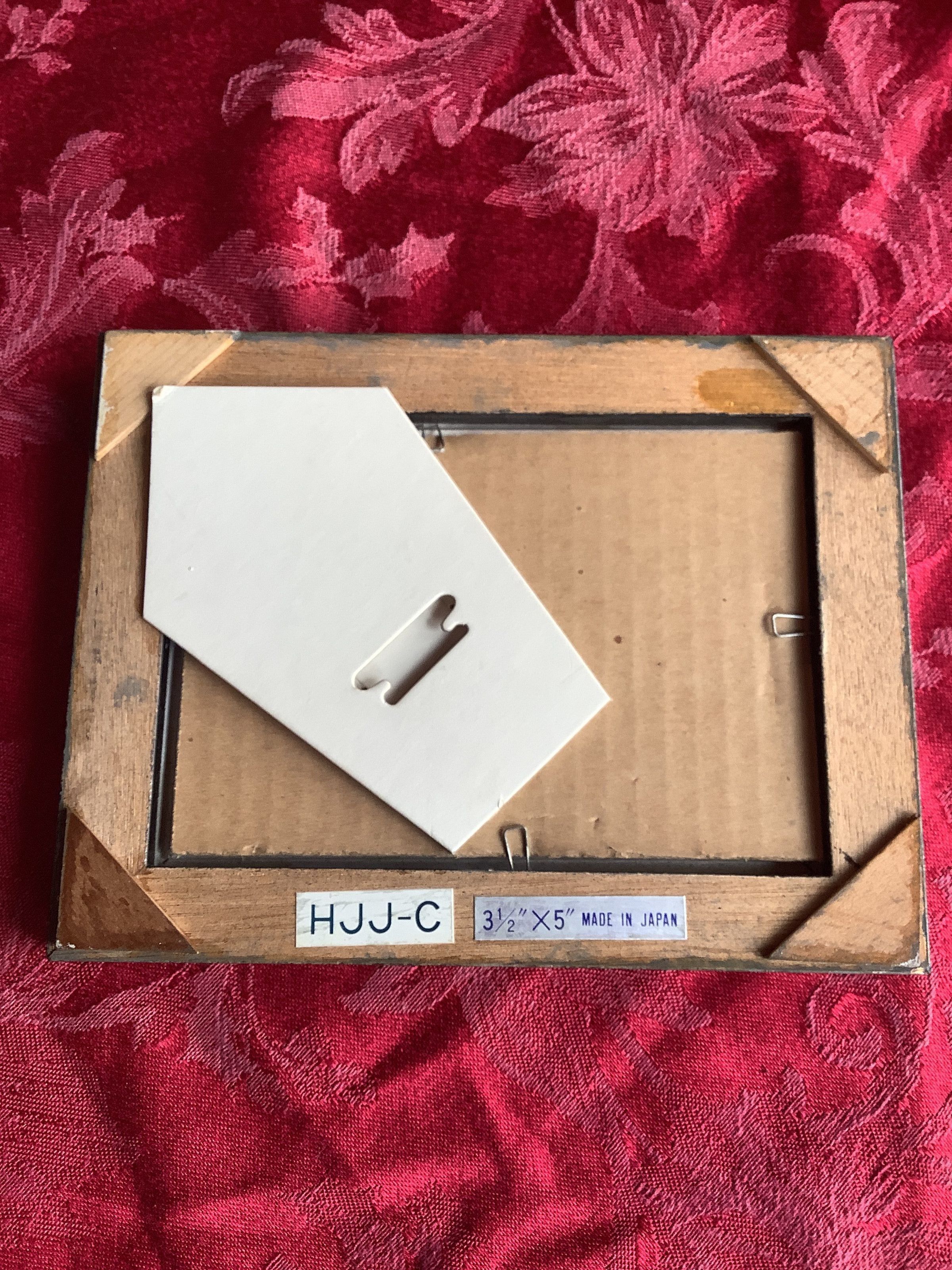 A 3.5 x 5.0 wooden framed photograph of an unknown girl and a small puppy. There’s a green stone design of some sort on the front of the frame, along with a “made in Japan” sticker and an “HJJ-C” sticker.Made/Created