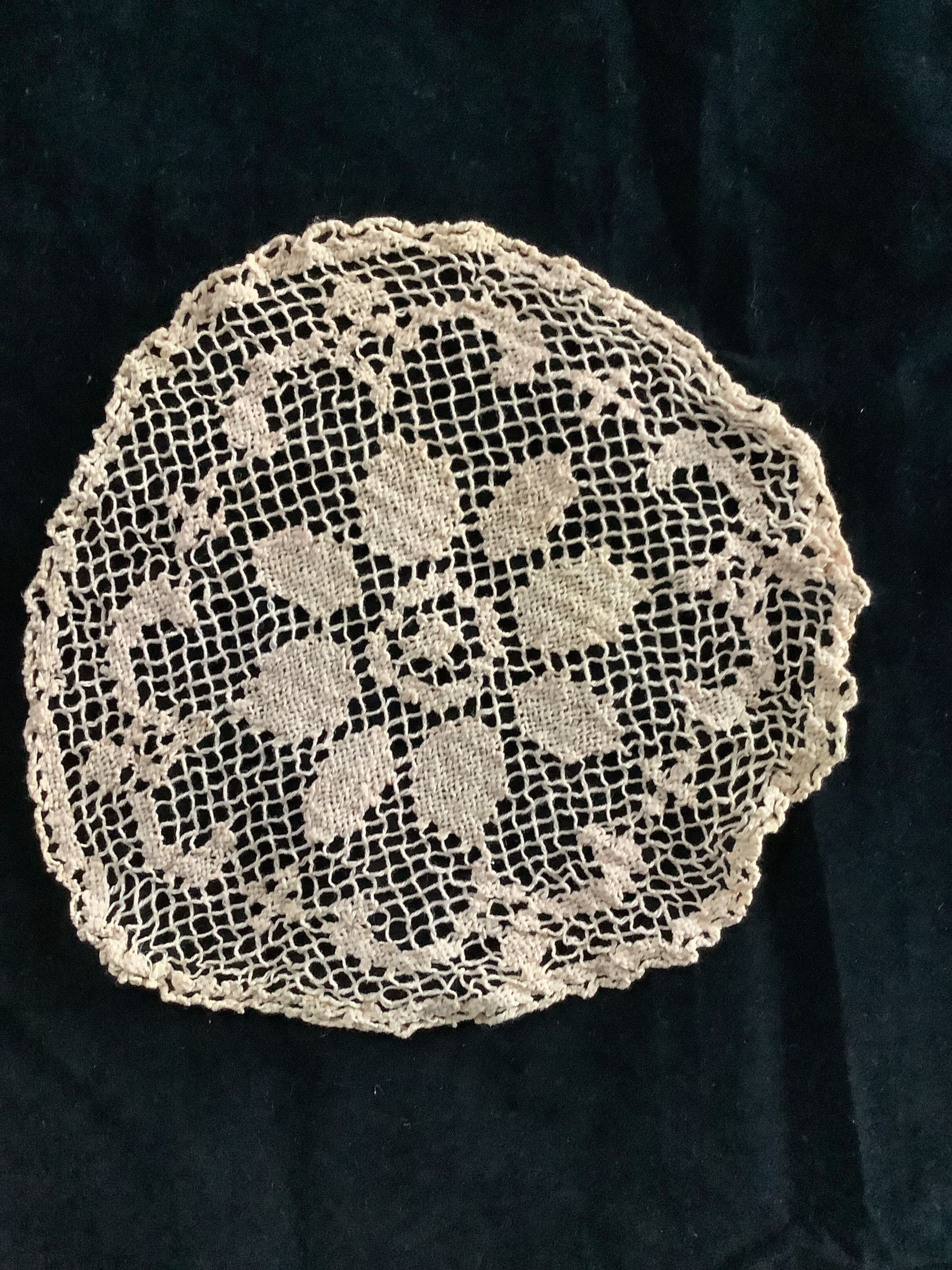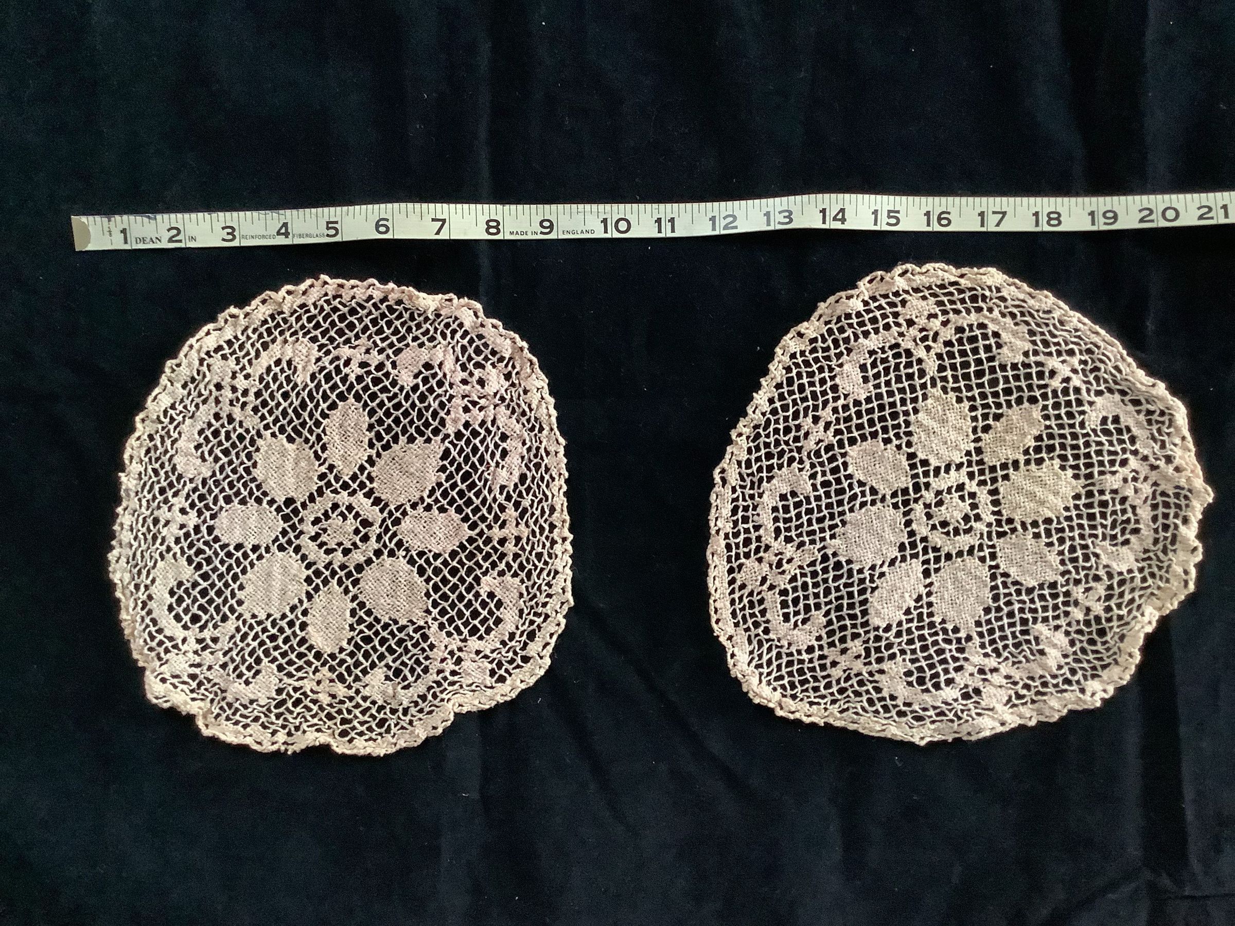 Two lace doily’s with a flower design in the middle. circular shape, somewhat misshapen into an oval. Both are in good condition