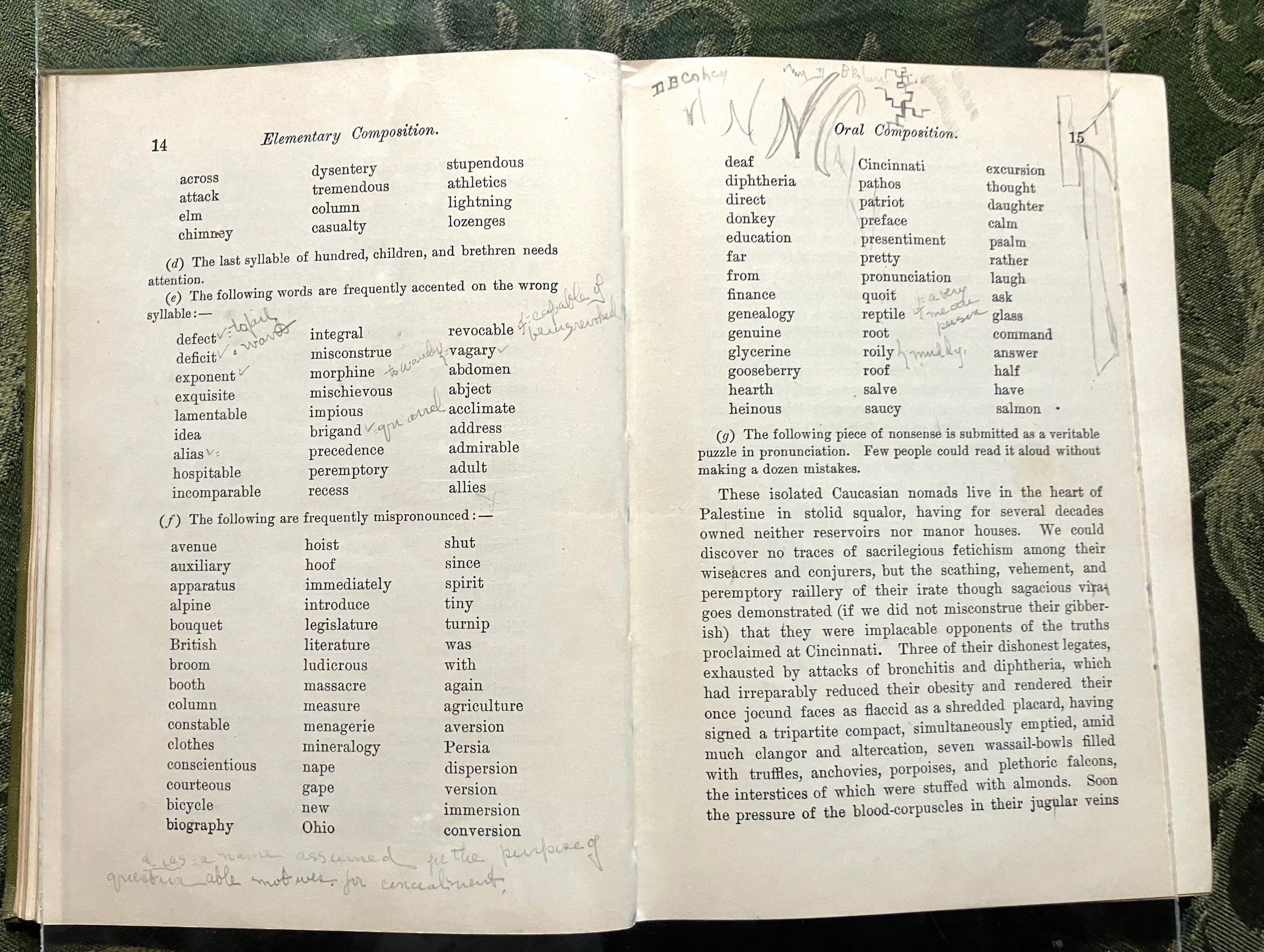 Various doodles- donkeys braying/saying "hee haw", cartoon man with name "D.B. Cohen"Type