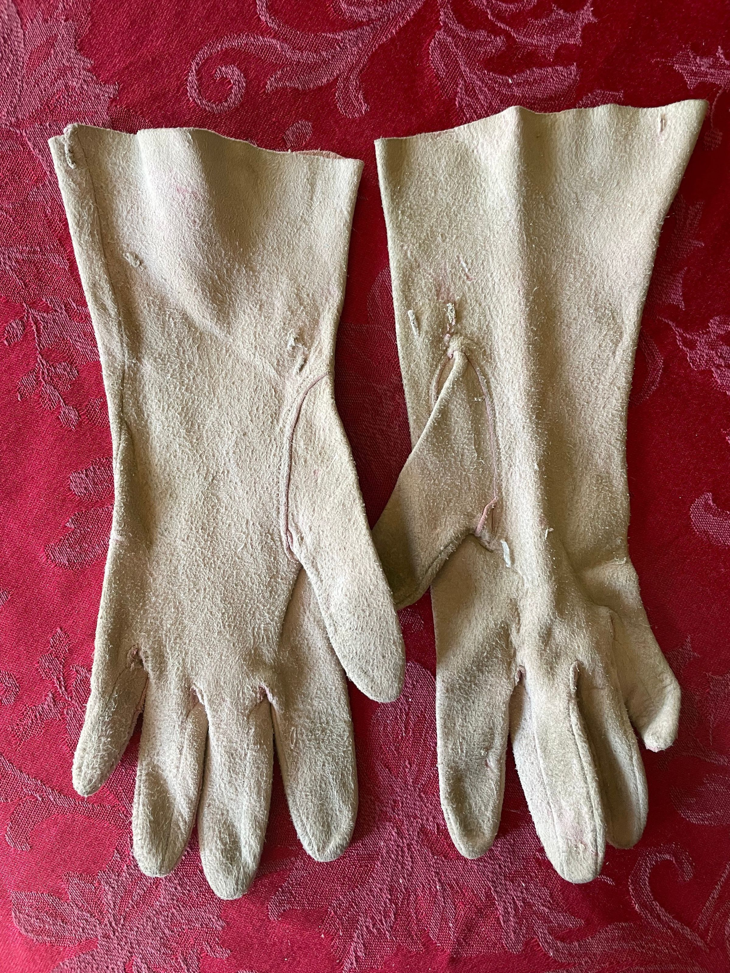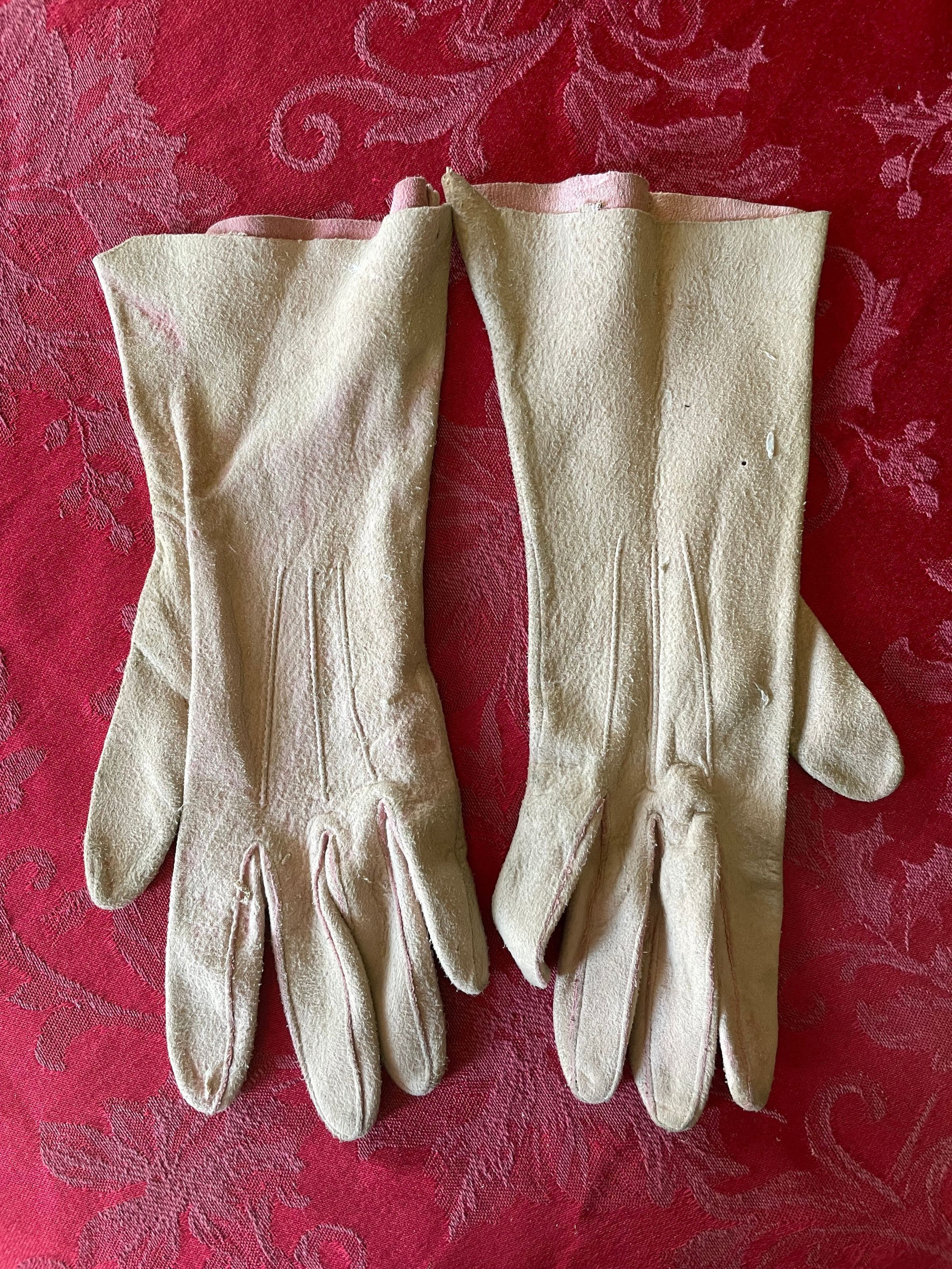 A pair of white suede gloves with protruding stitching across three fingers and slightly flared openings.