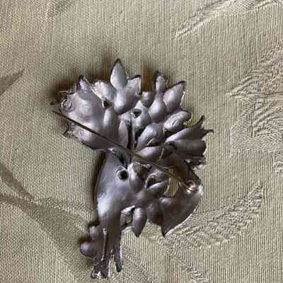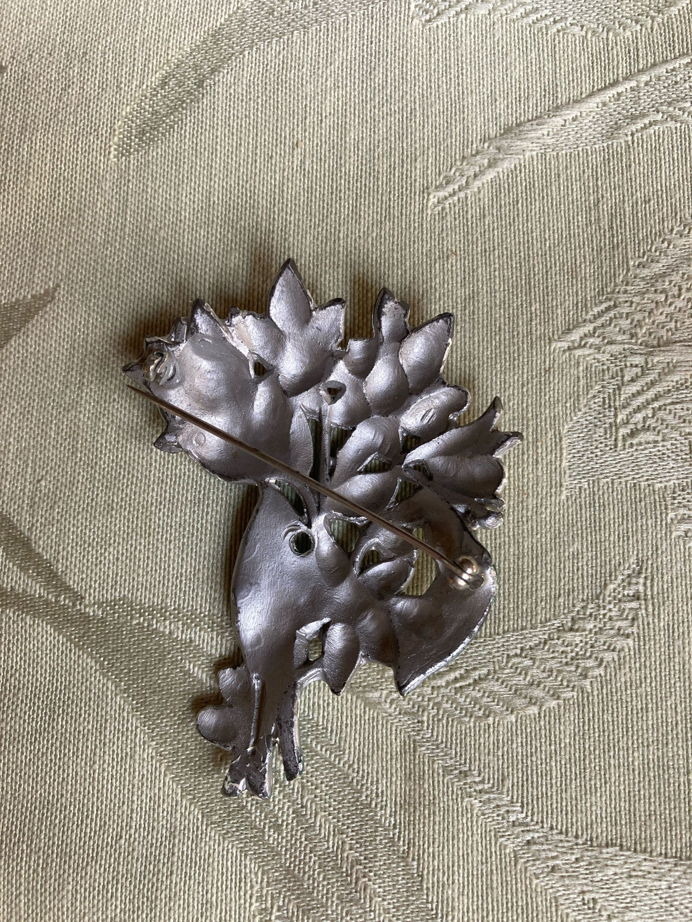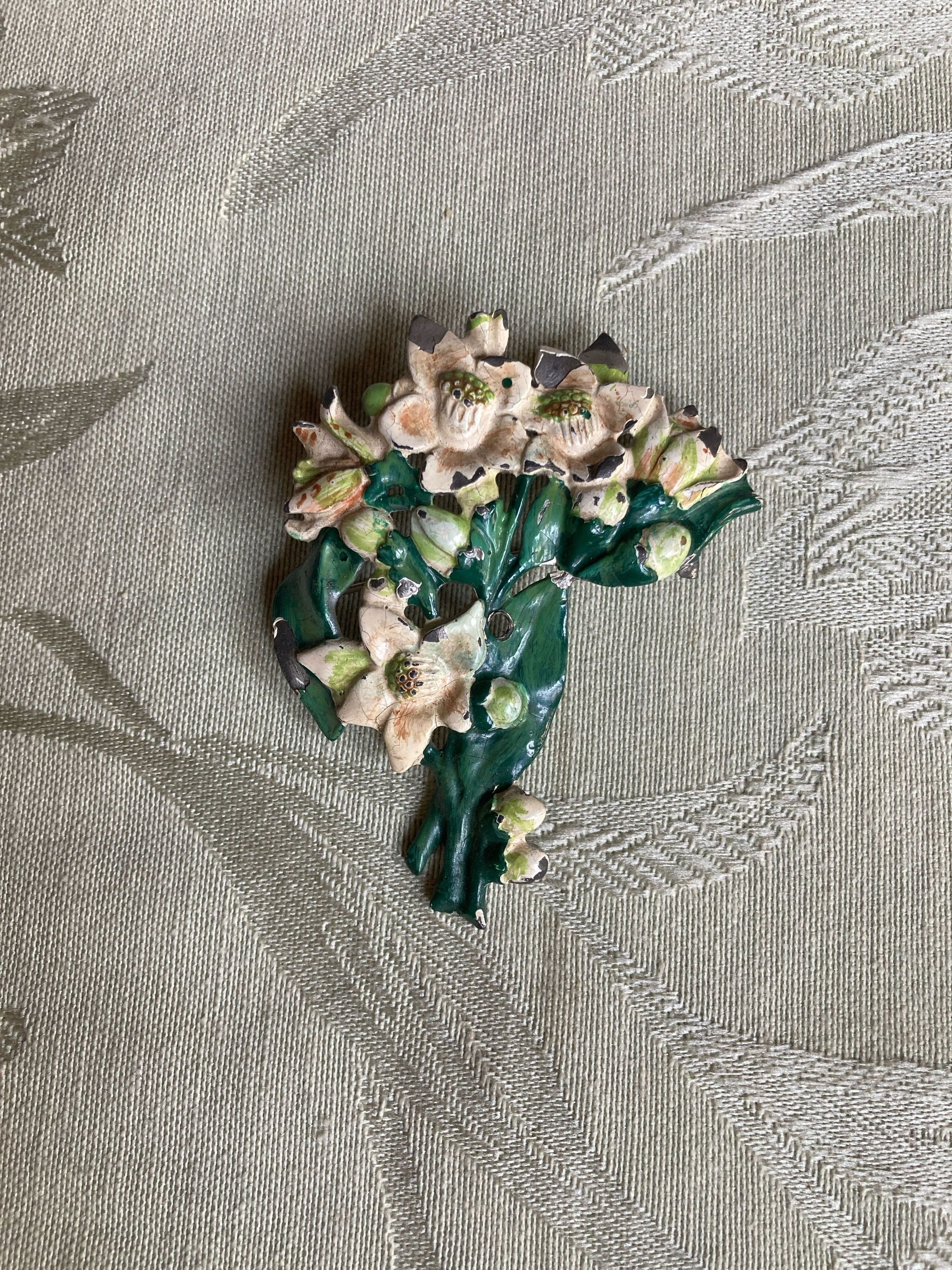 Metal brooch in the shape of and painted with white daffodils and green leaves. The back is painted silver.
