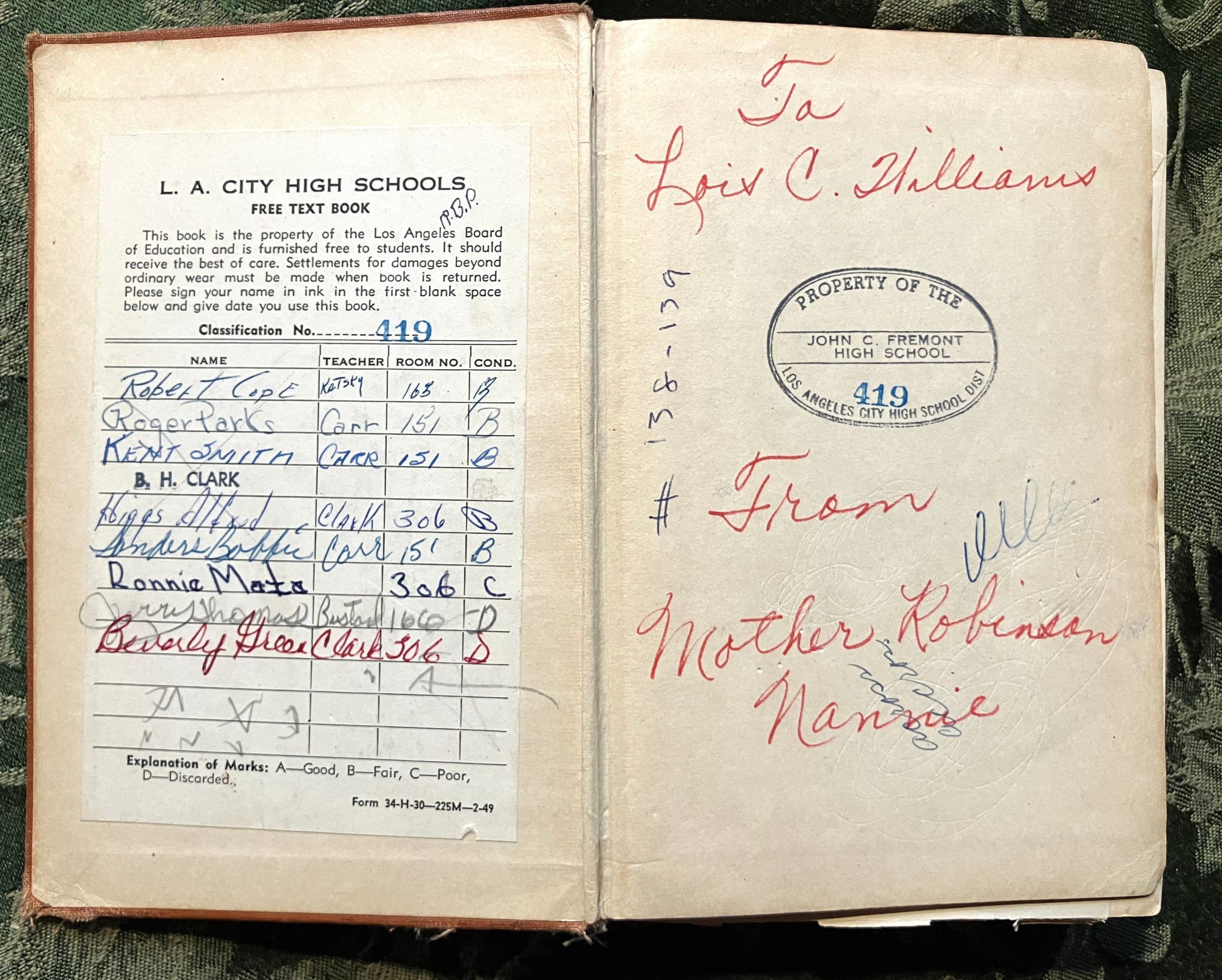 Label from L.A. City High Schools. "Free text book. This book is property of the Los Angeles Board of Education..." Classification No. 419, list of names, teachers, rooms and condition.Type