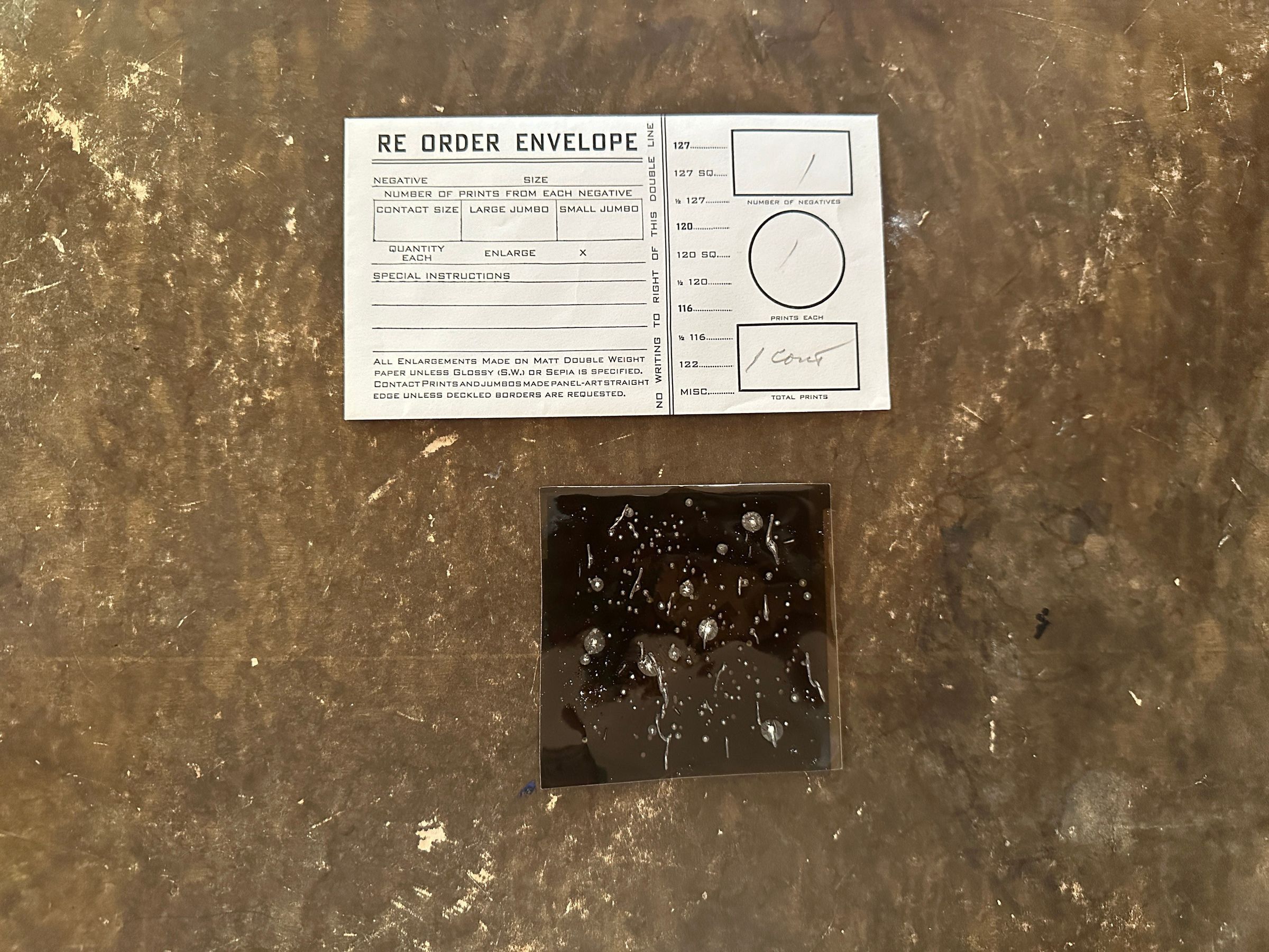 Negative of a dachshund breed dog outside. There is a large pine cone in front of the dog an a small one next to the big one. Te dog has a metal collar with tags. It is looking directly at the camera.Collection