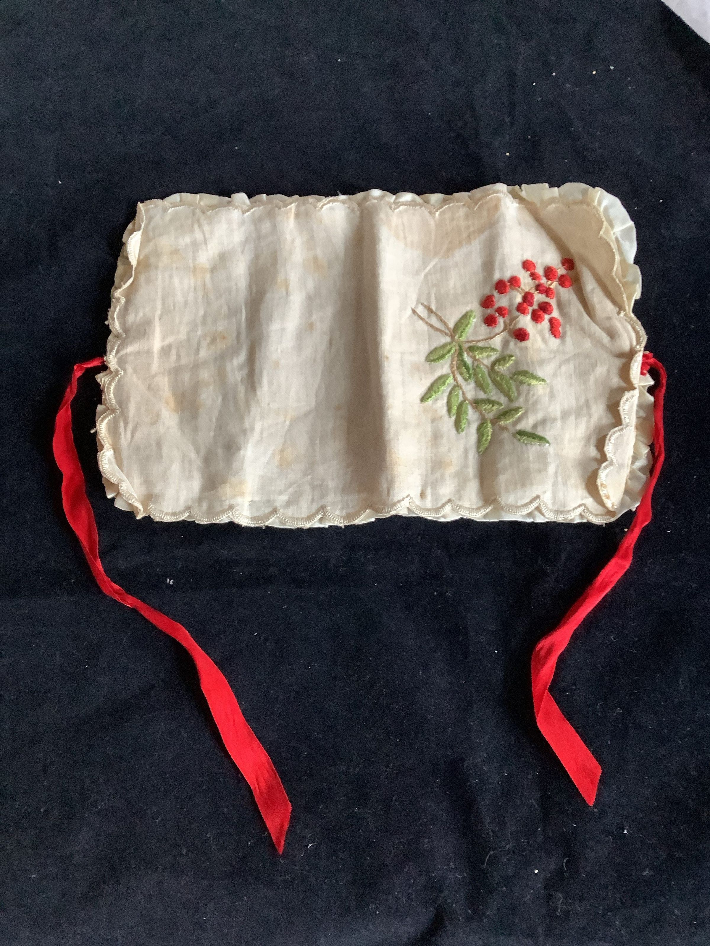This is a a piece with two layers of fabric, one cotton and silk. There is an embroidered holly branch and two red ribbon ties. There are a few yellowing stains.Create Date
