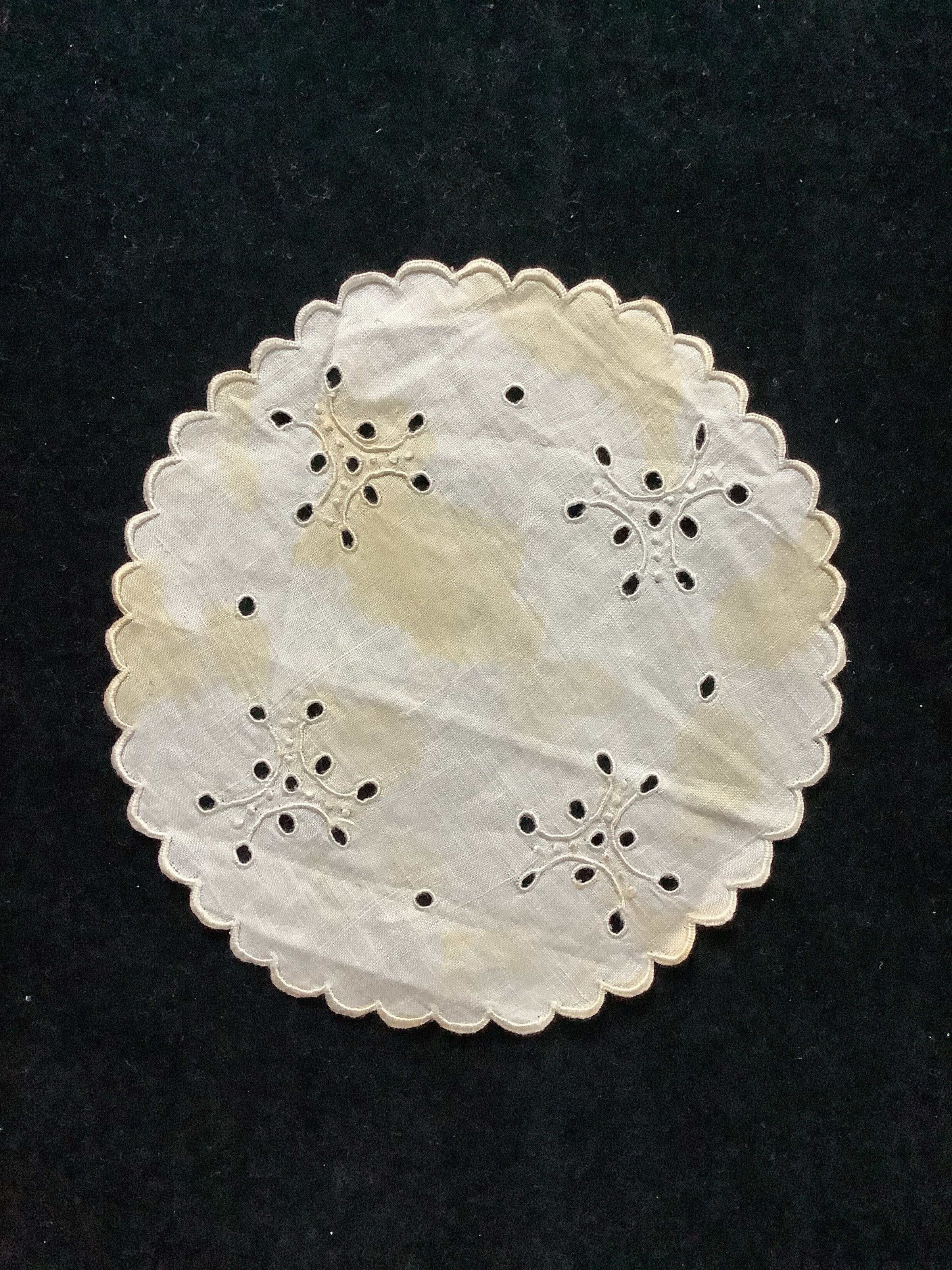 This a small circular cotton doily with embroidered designs and drawn holes.