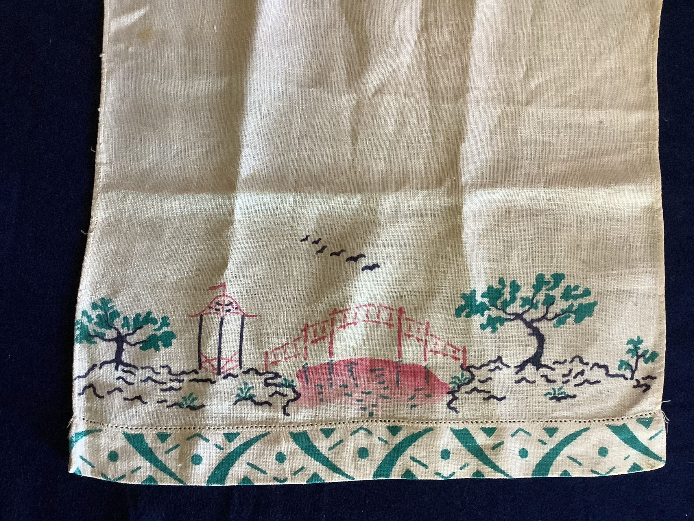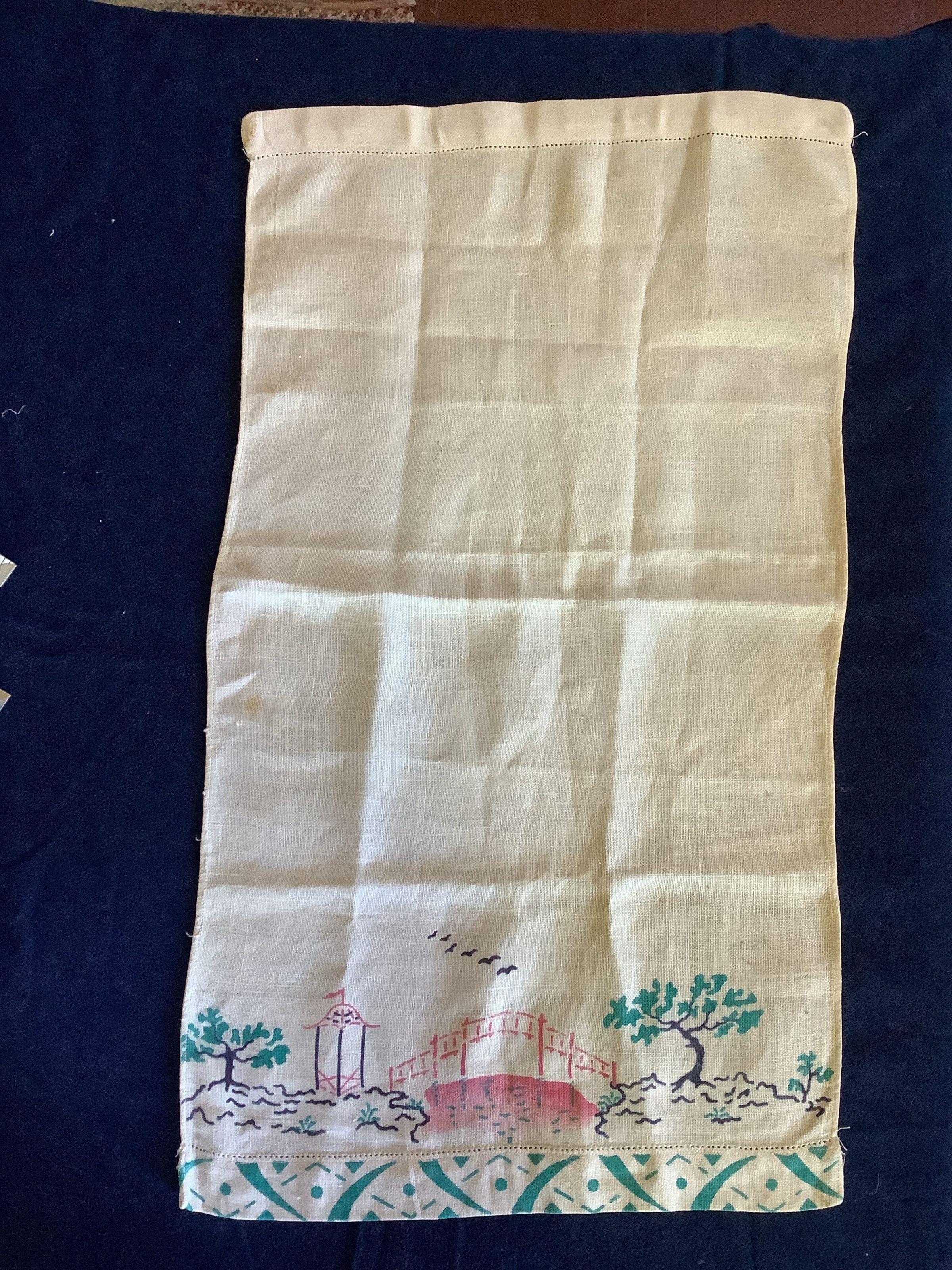 This is a rectangle linen with a printed Japanese bridge design.