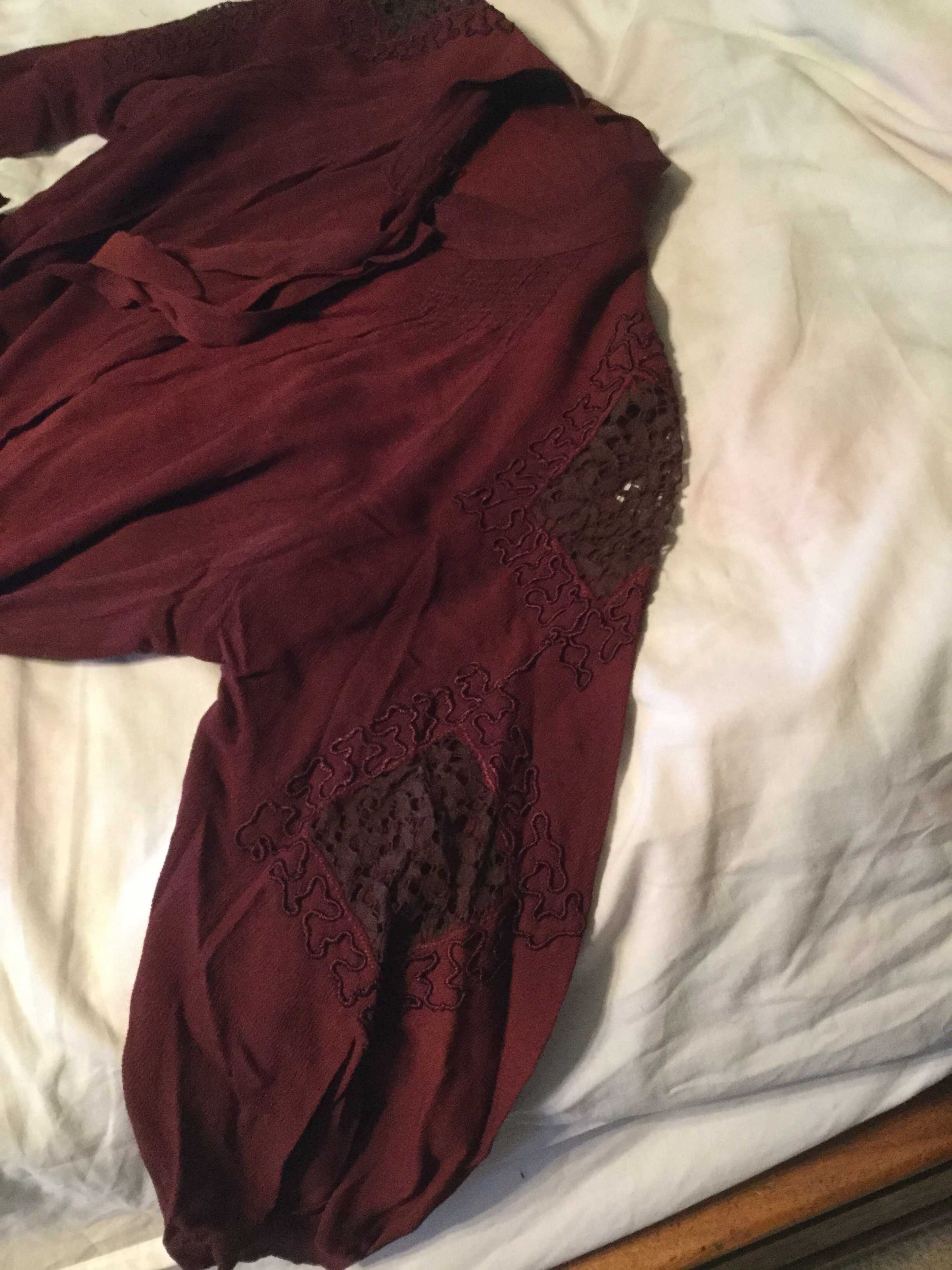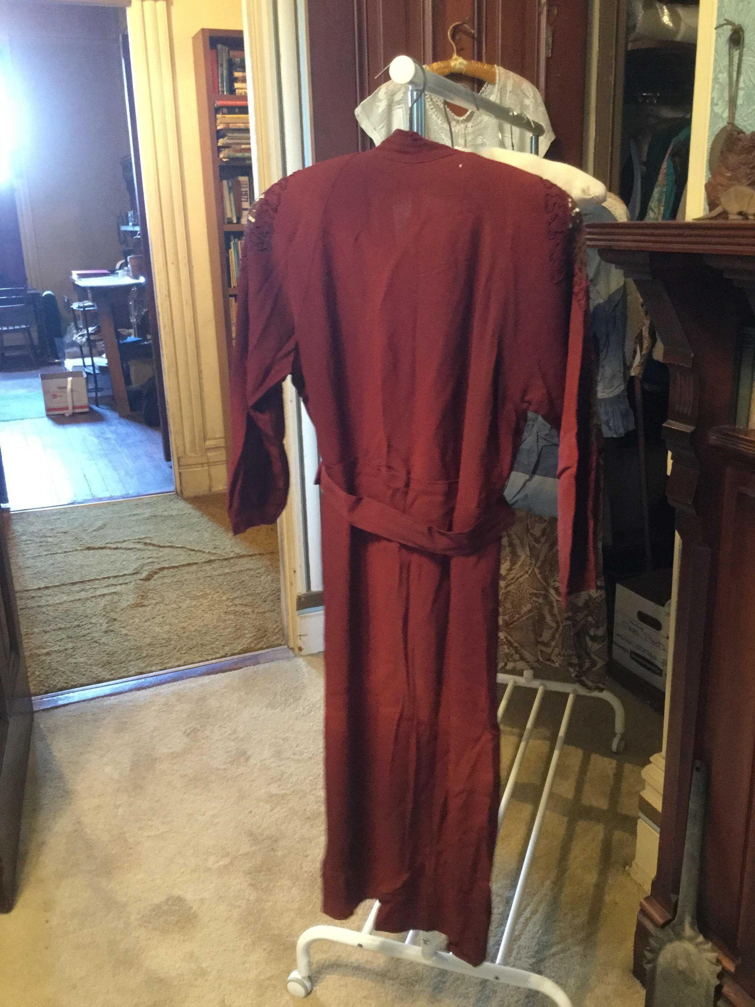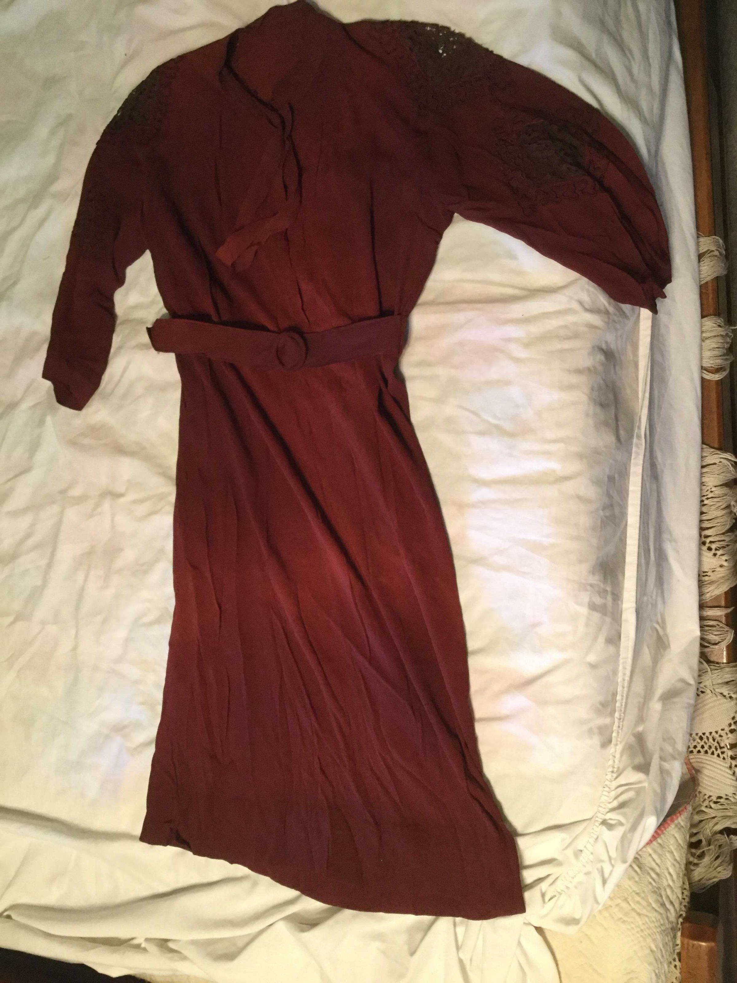 dress; burgundy, rayon (?); long raglan sleeves, gathered band cuff; shoulder and forearm lace insets, diamond shaped, brown lace, surrounded by embroidery; neck fastens with snap has attached ties; belt and underarm protection pads ( we removed the pads)Collection