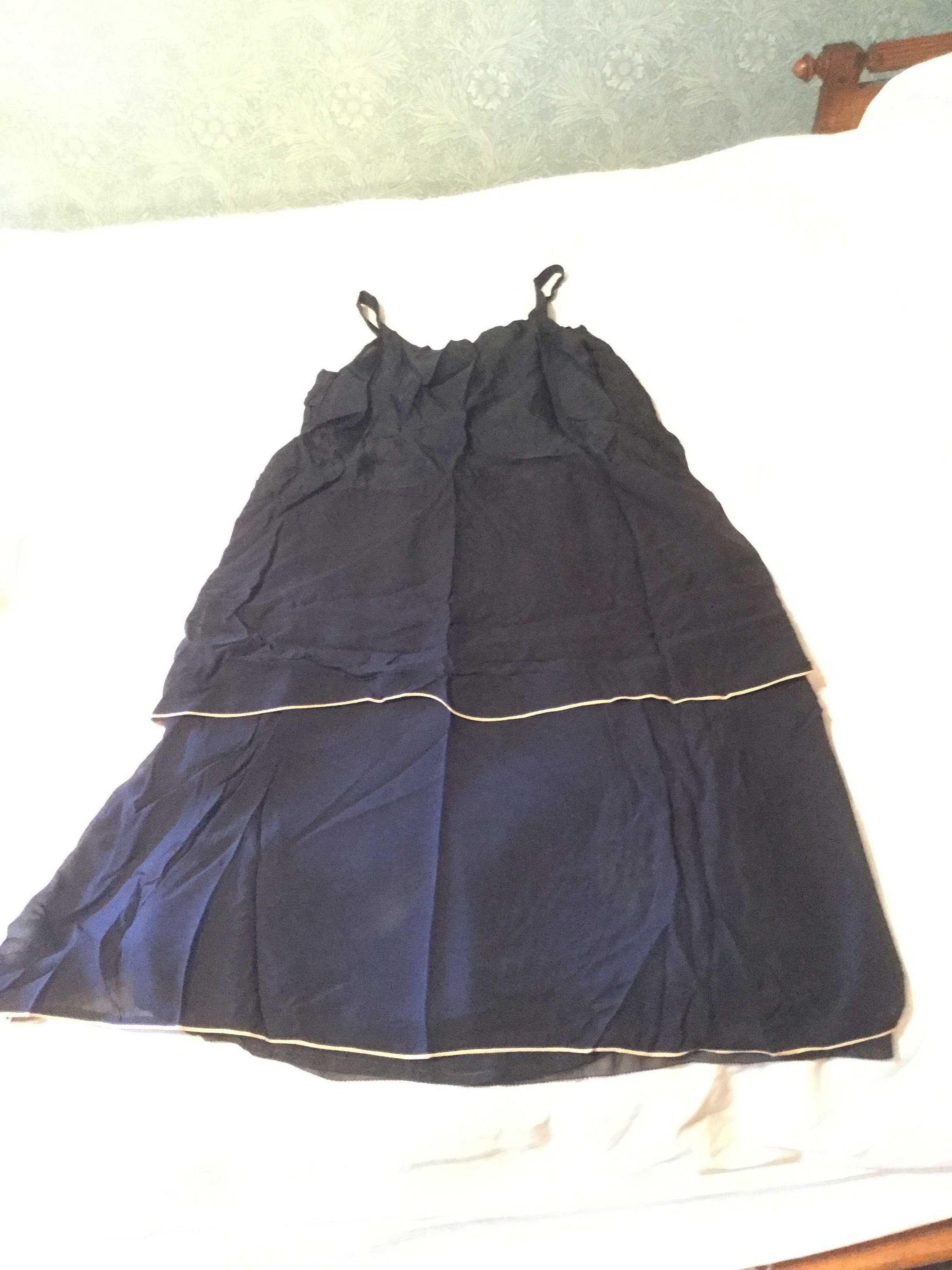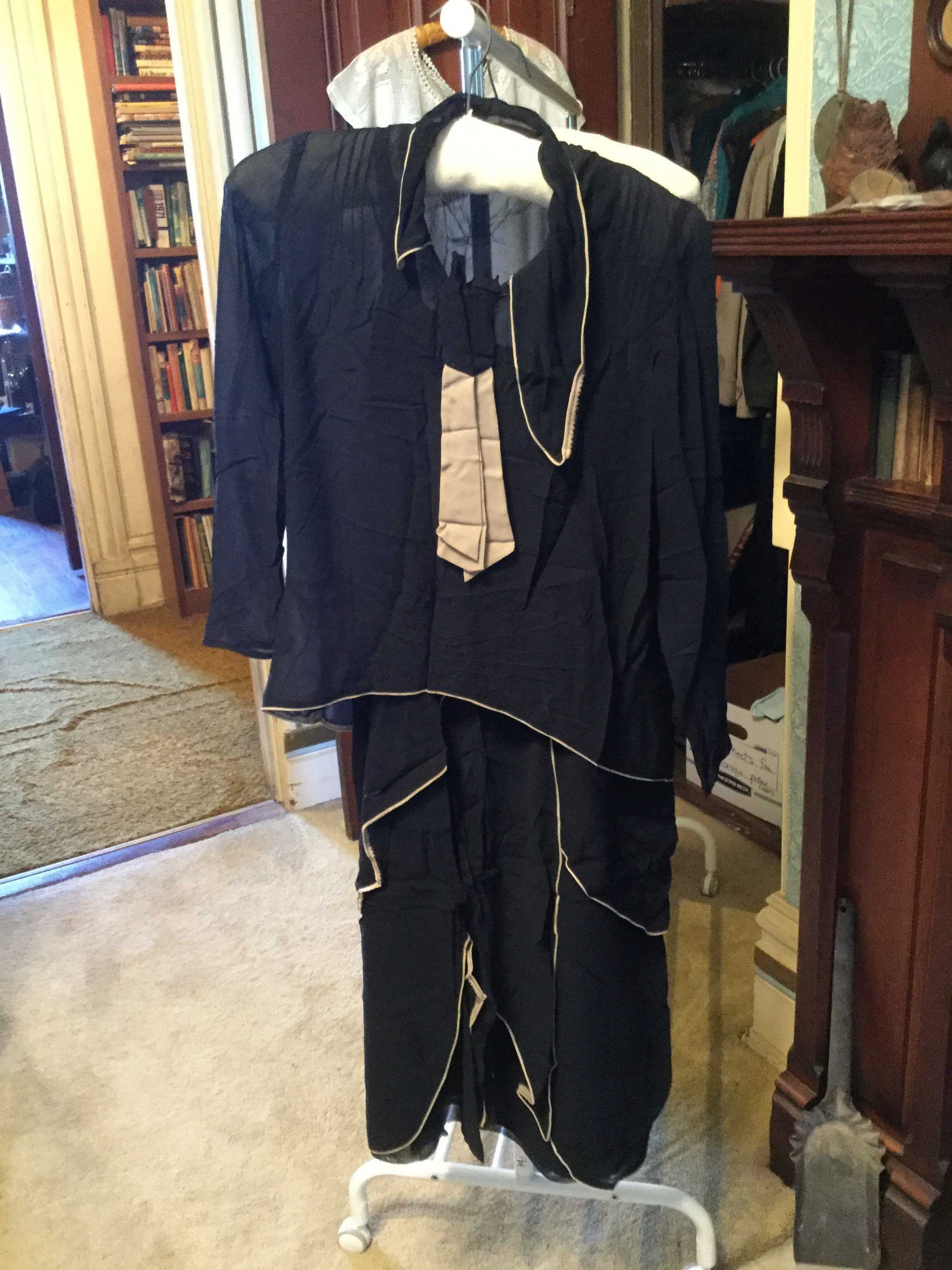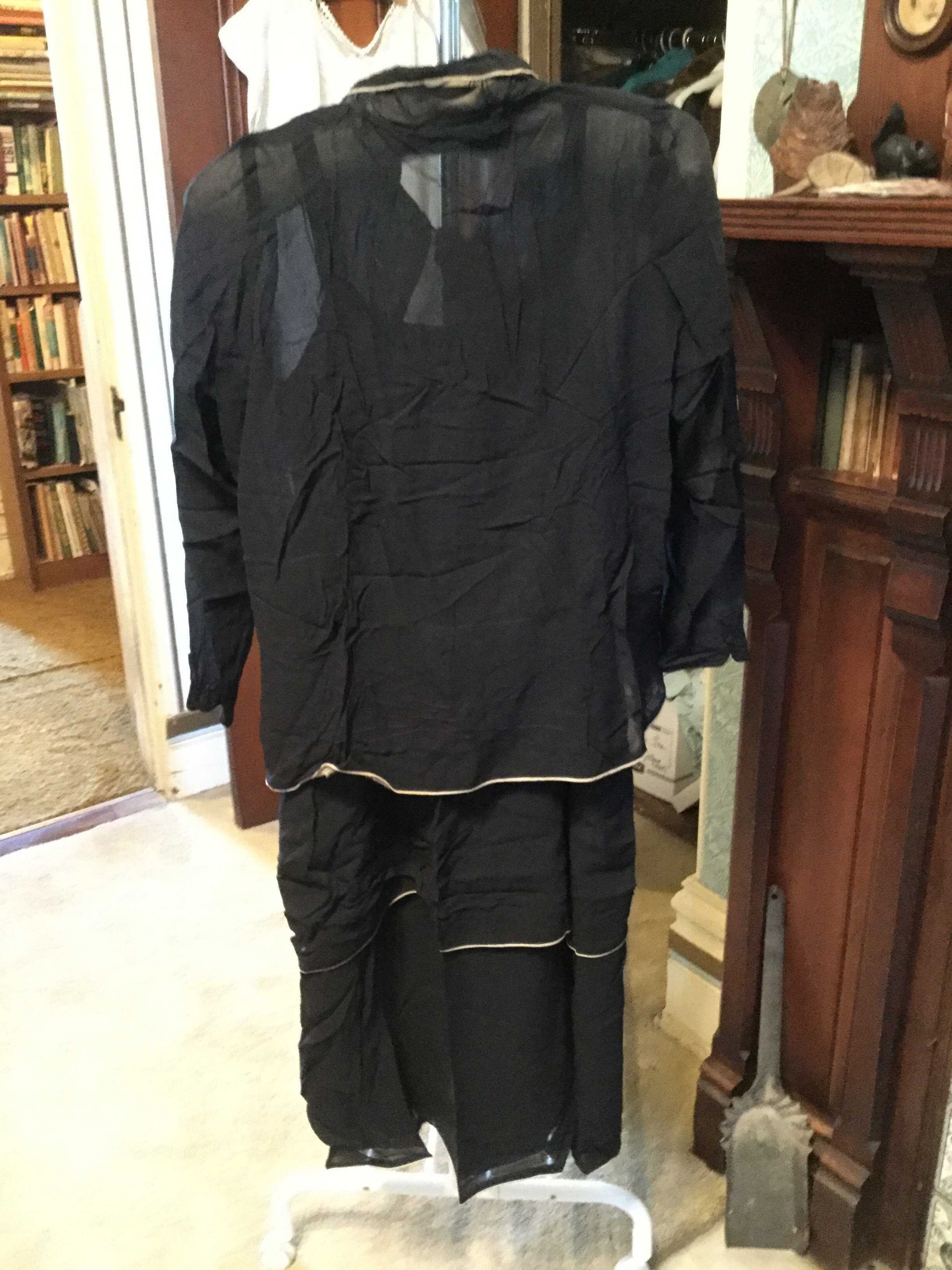 dress black chiffon with ecru piping;inner dress, silk (?); 1920s; overskirt has asymmetrical panels, underskirt chiffon, slip top is heavier silk (?) fabric with straight top, straps; machine sewn; looks like had tag but none now;Collection