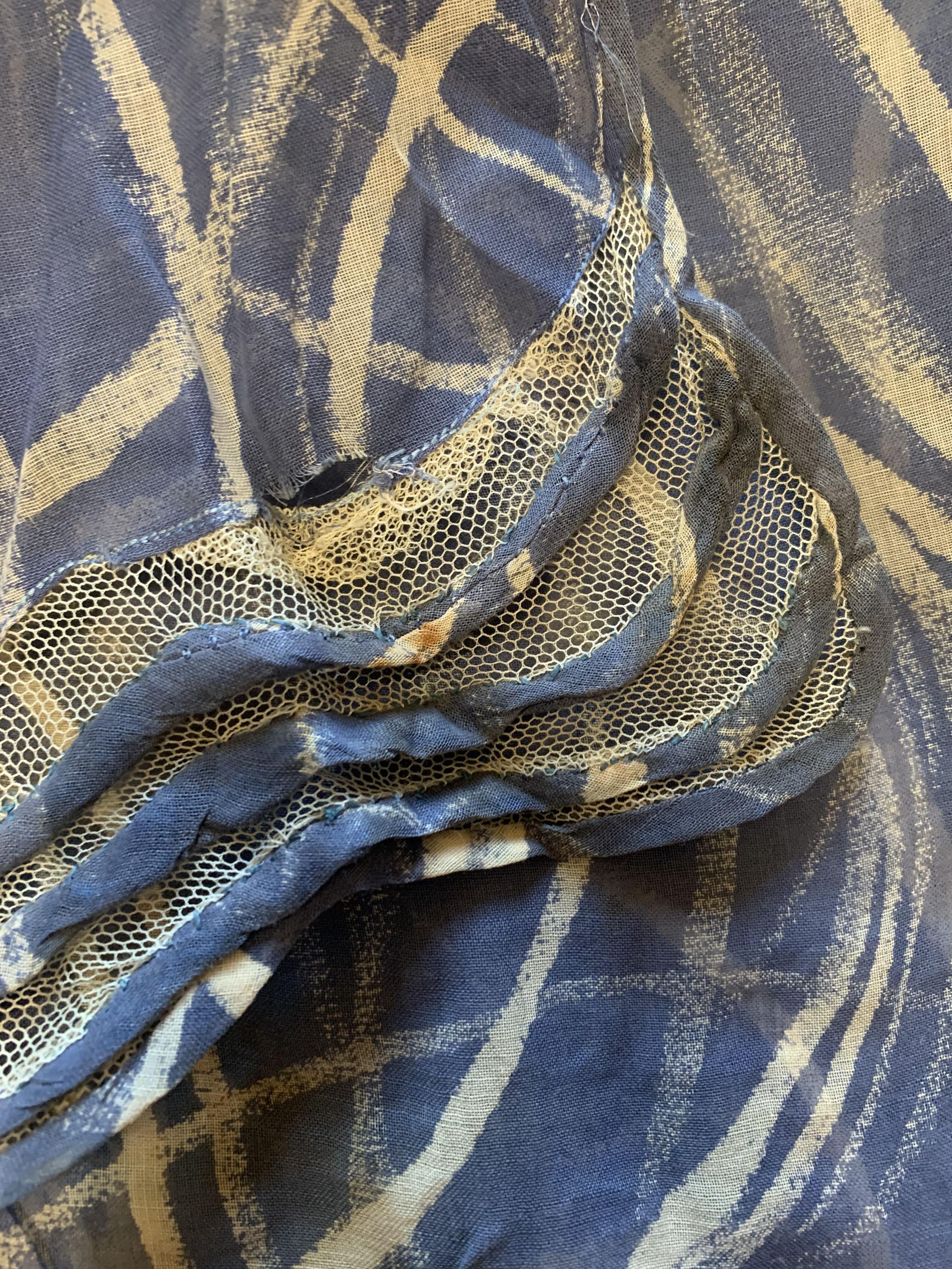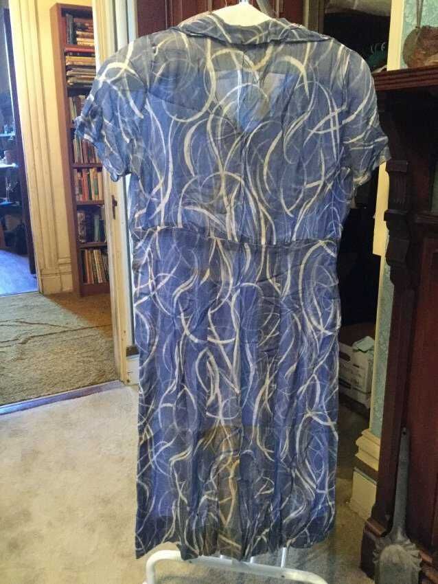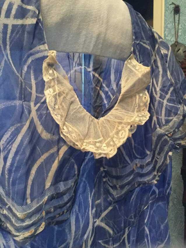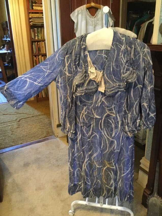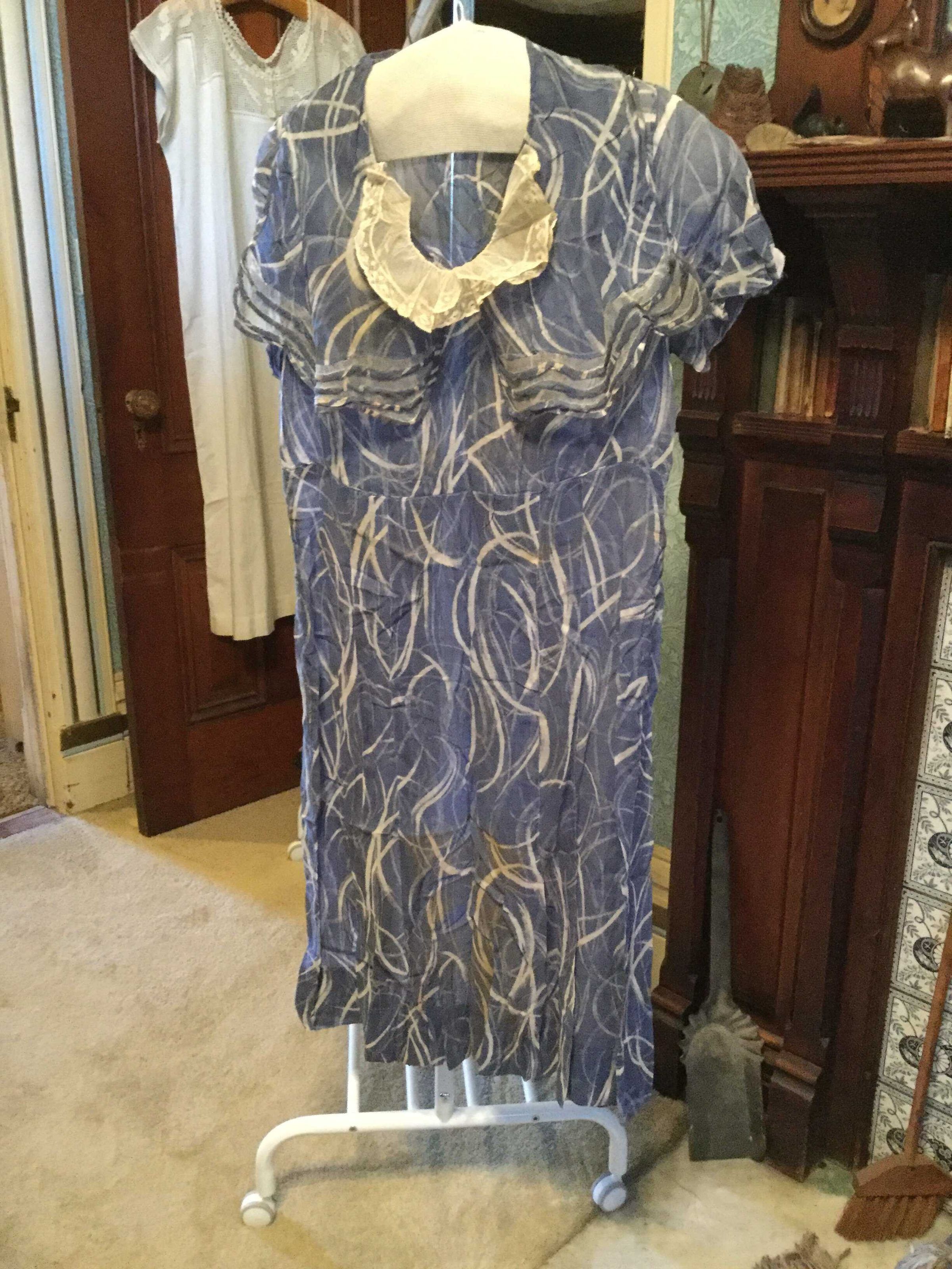 Dress with jacket; blue with abstract white print; cotton georgette(?), sailor collar has net inset/self-fabric piping overlay; separate lace frill at neckline front; machine sewn/hand finished; no tag; 1930s; has thread belt loops, no beltCollection
