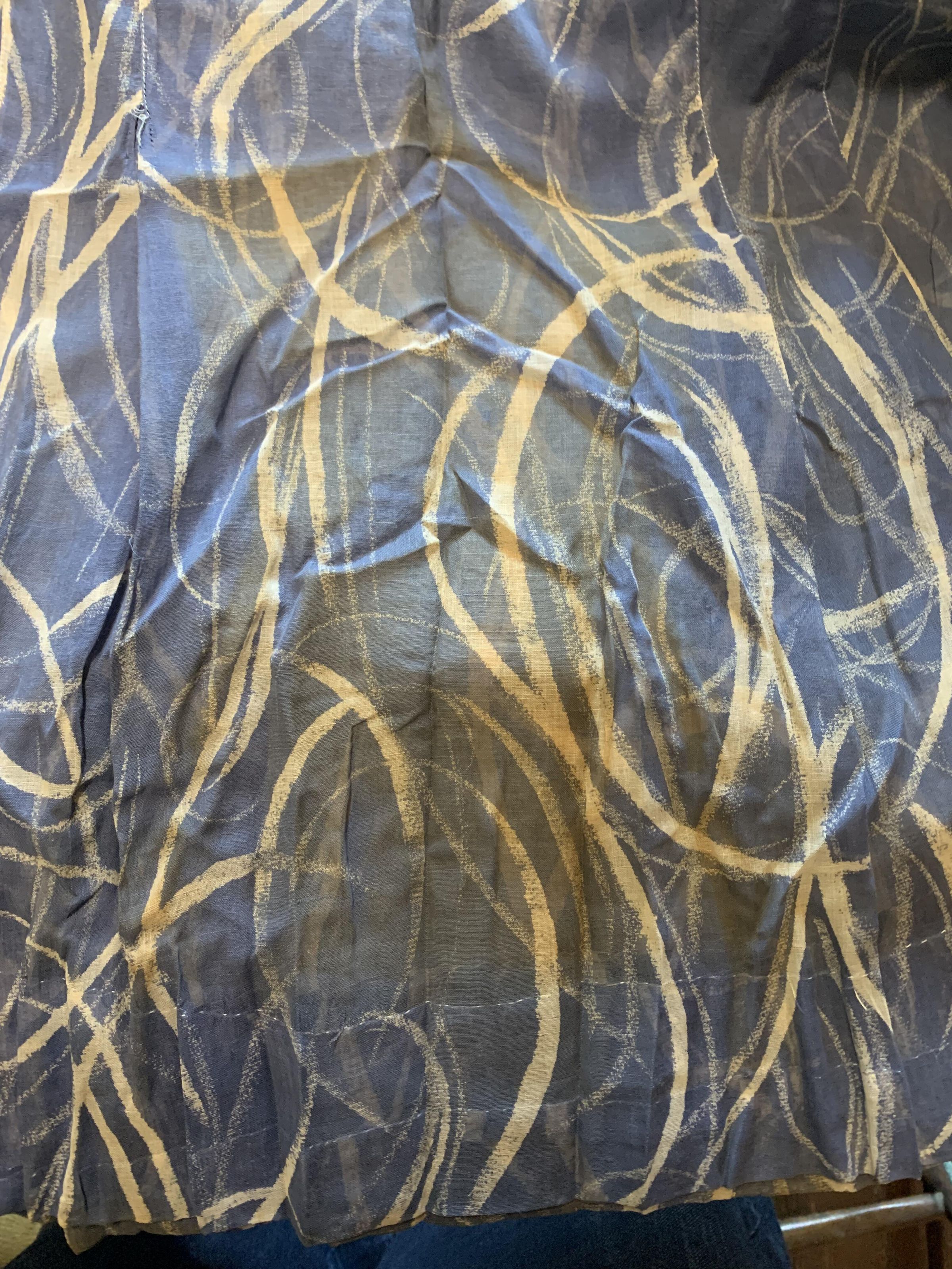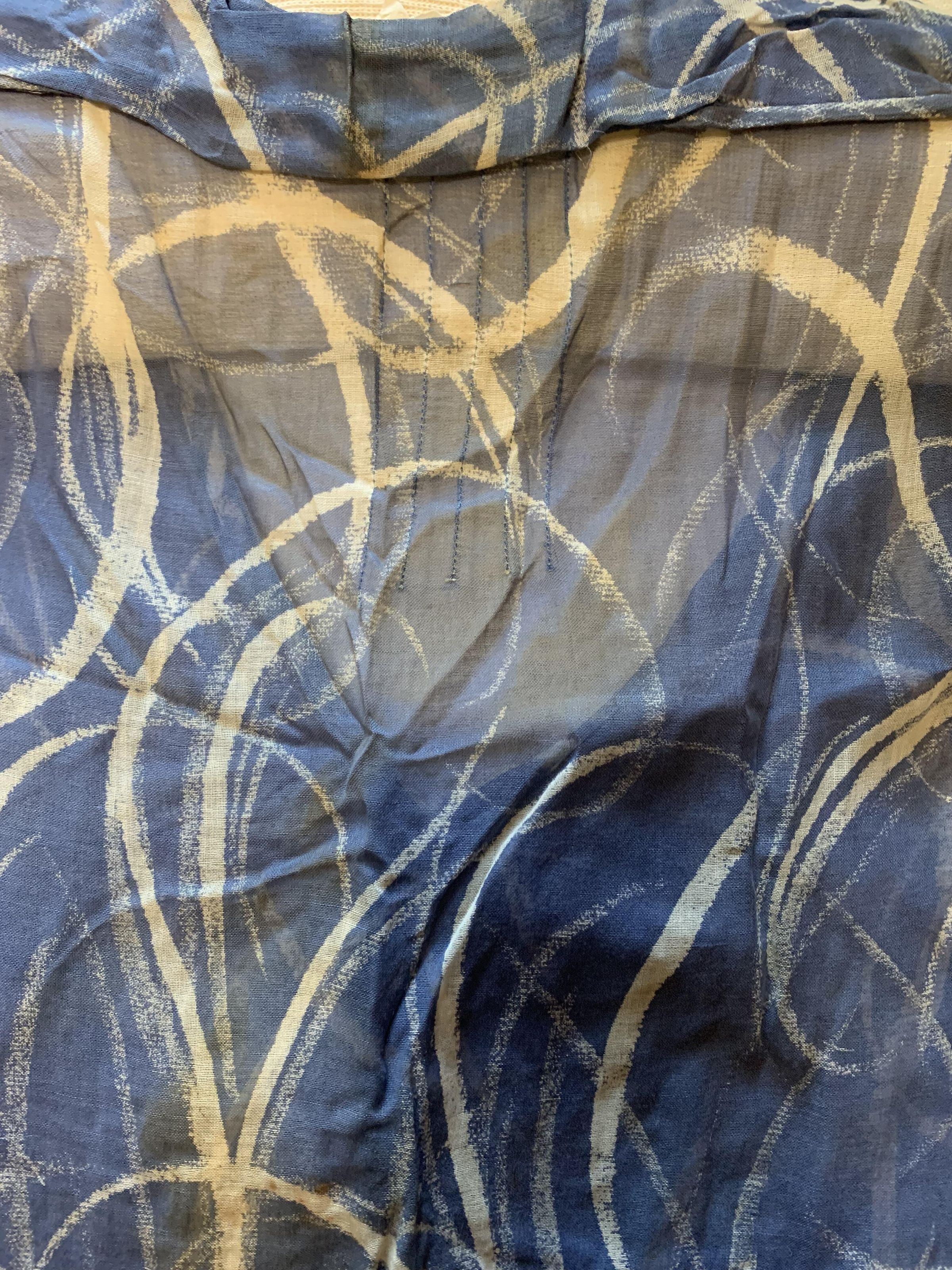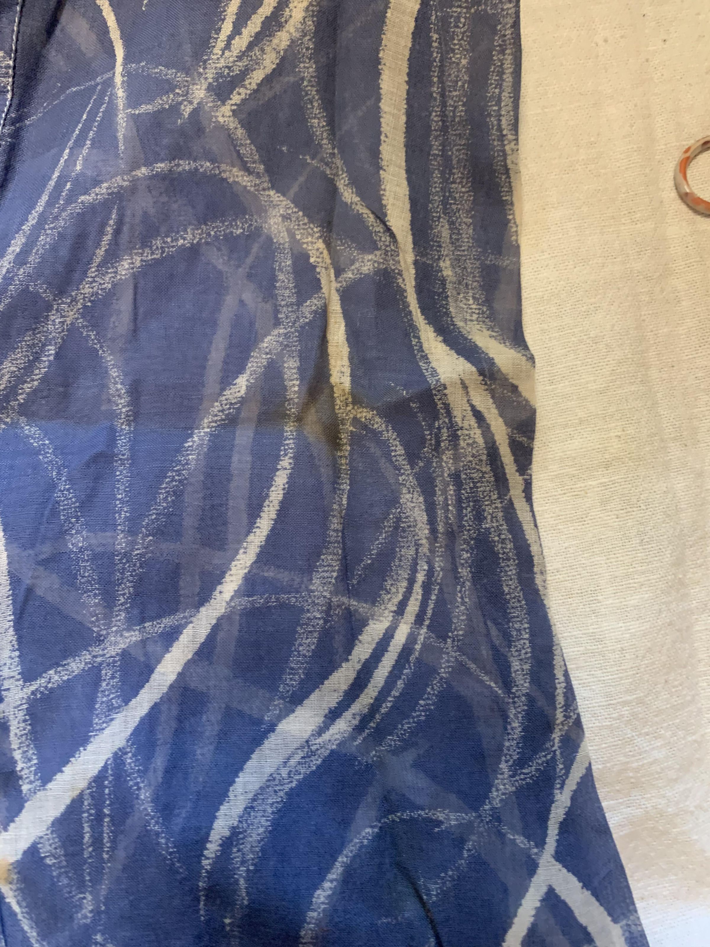 Dress with jacket; blue with abstract white print; cotton georgette(?), sailor collar has net inset/self-fabric piping overlay; separate lace frill at neckline front; machine sewn/hand finished; no tag; 1930s; has thread belt loops, no beltCollection