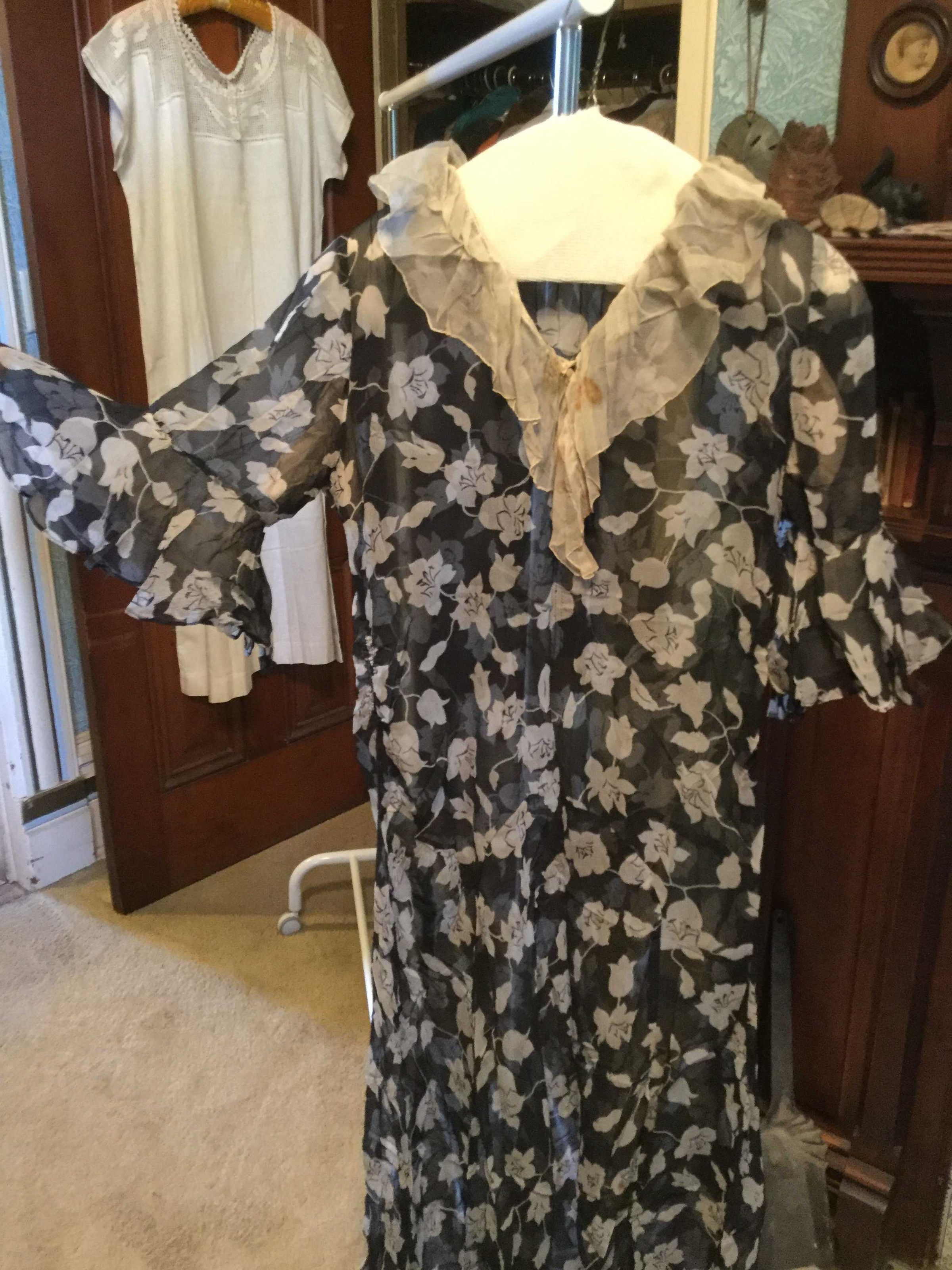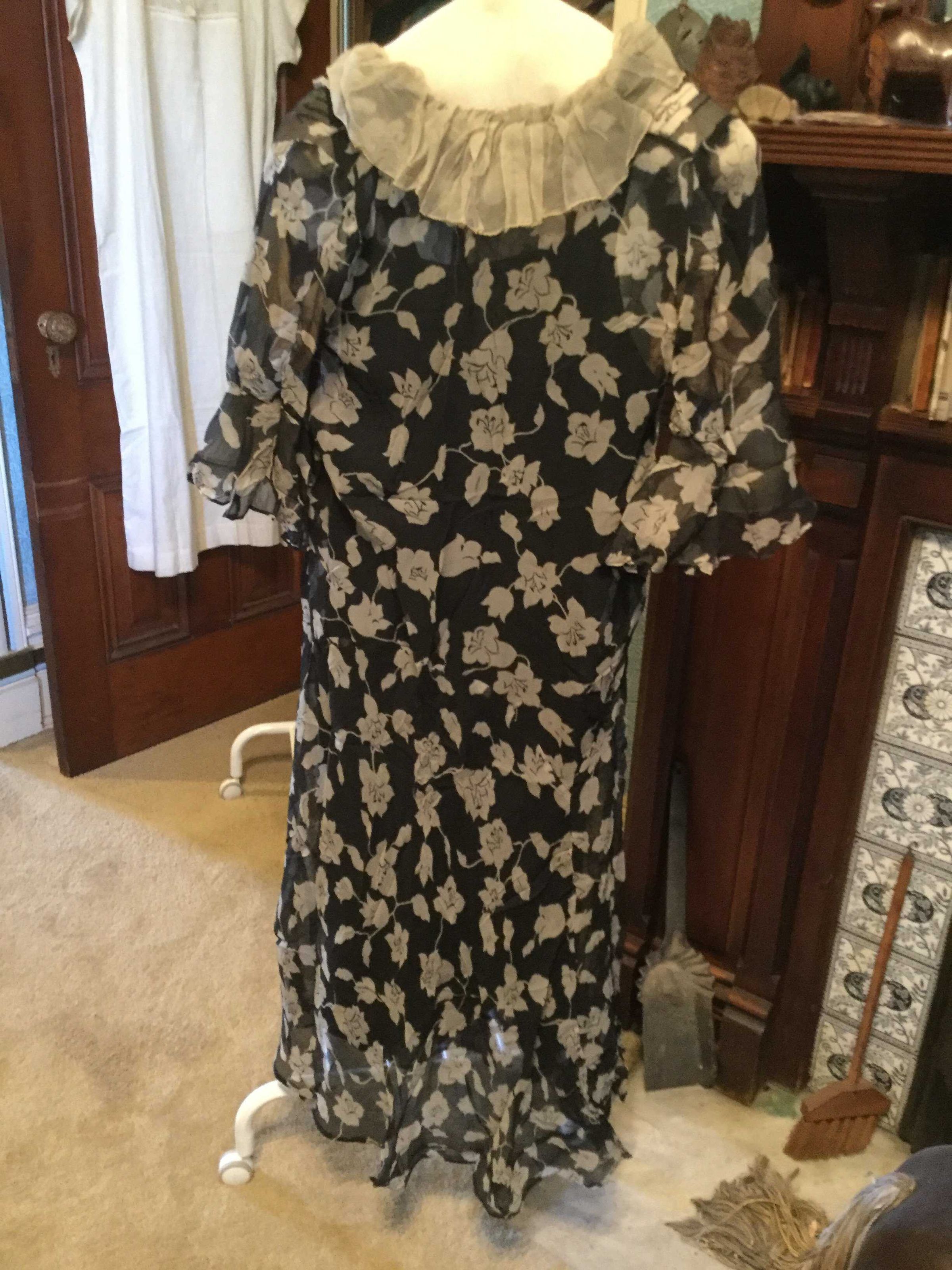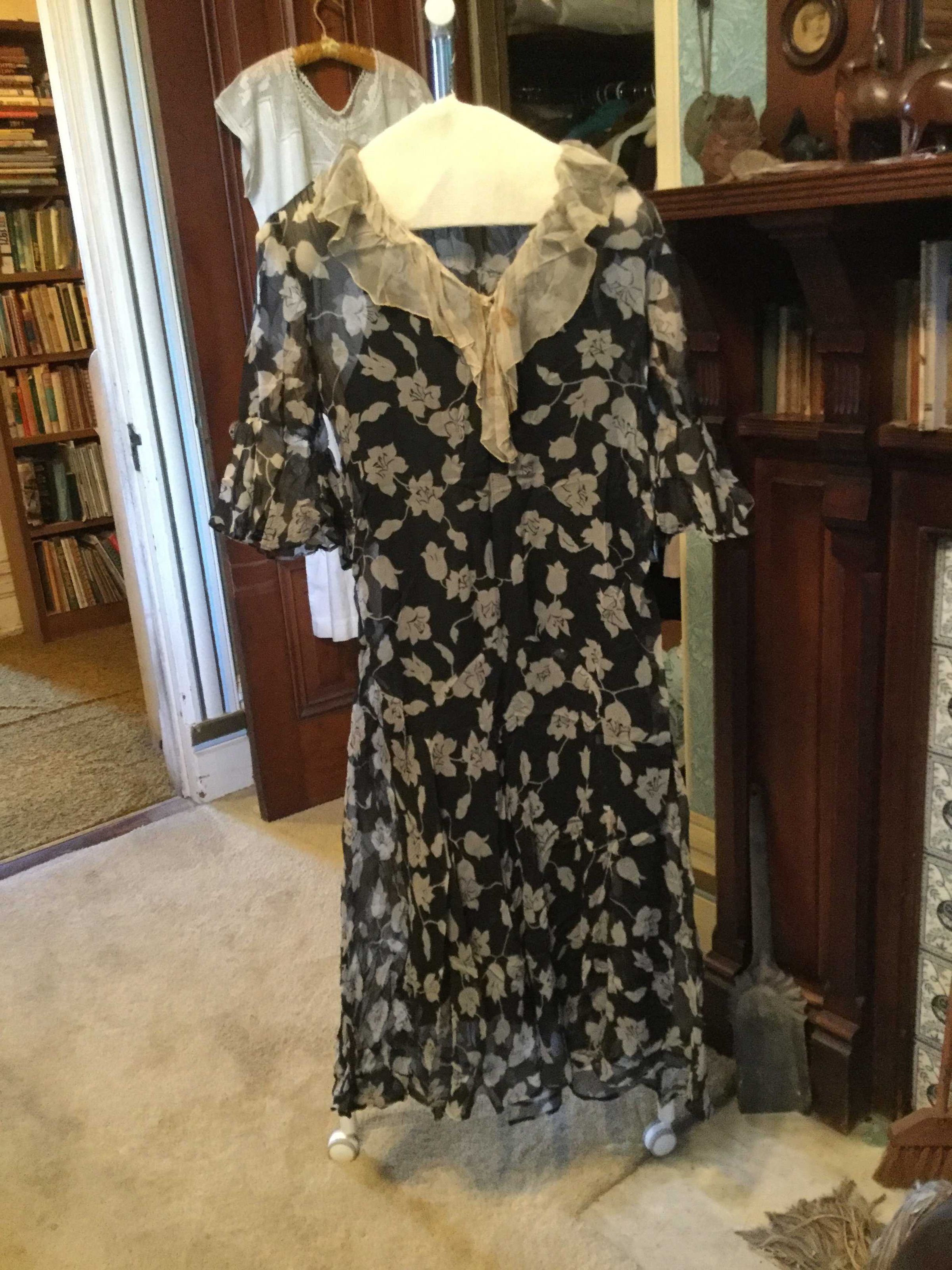 dress; black chiffon/white flowers (silk?); white gathered chiffon collar and inner elbow ruffles; interesting paneled skirt construction, machine sewn (with some visible hand basting), sweat protectors say Gallia, Made exclusively for The White House San Francisco 3; 1920sCollection