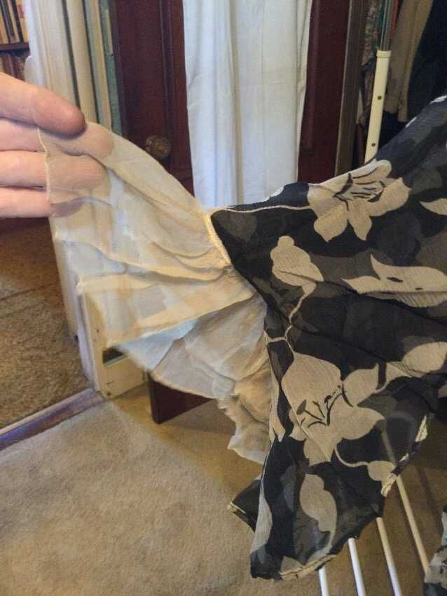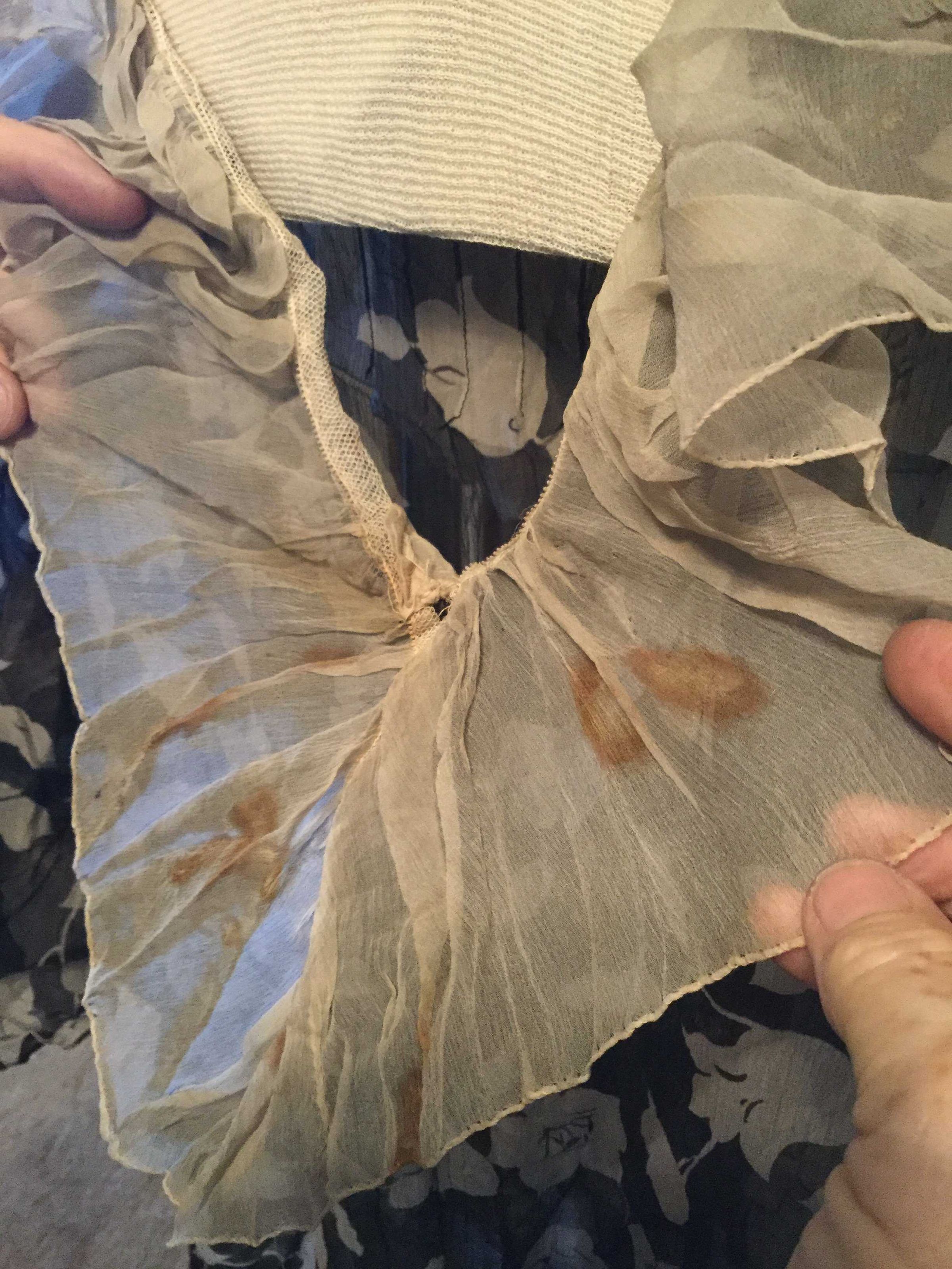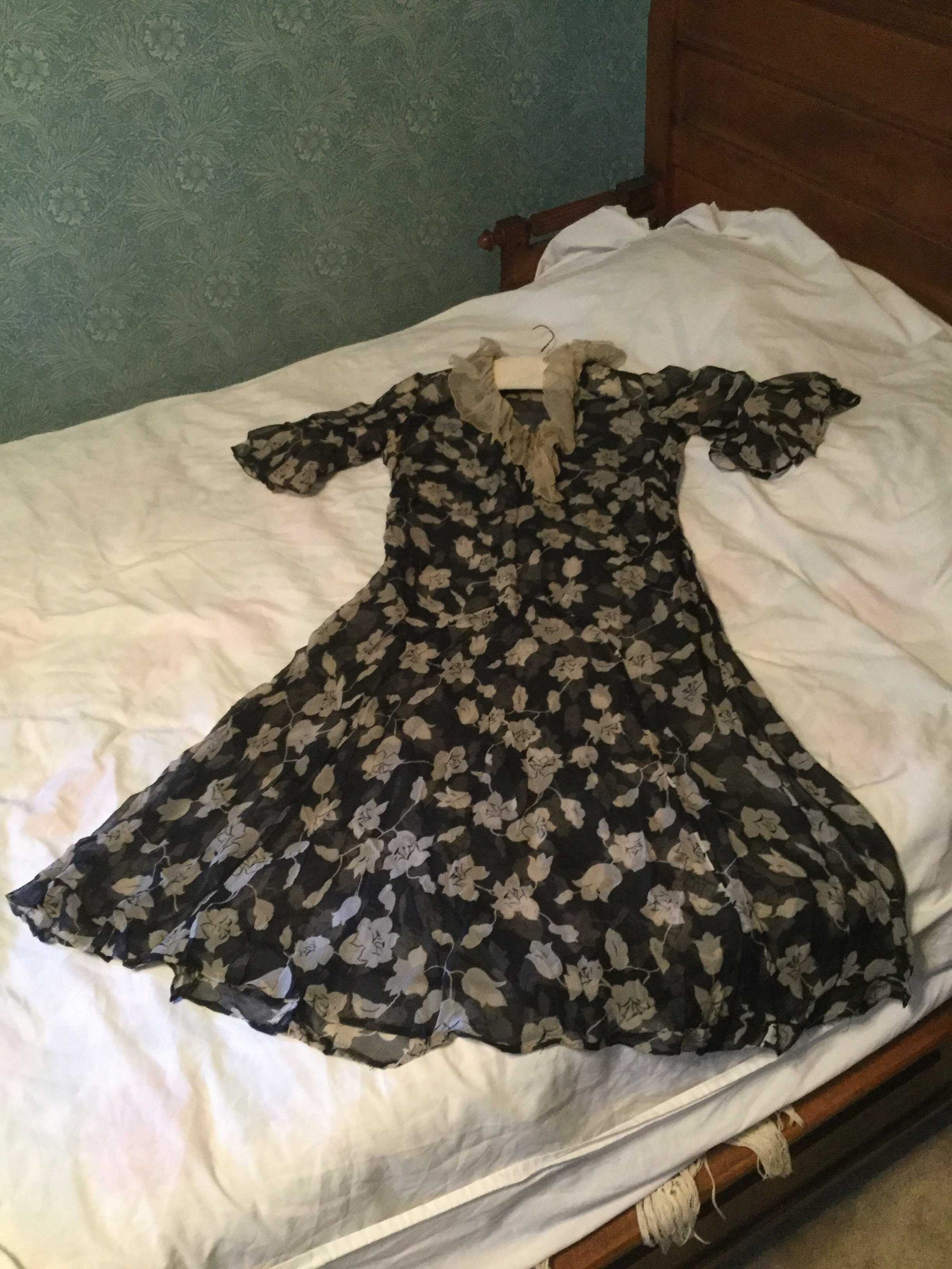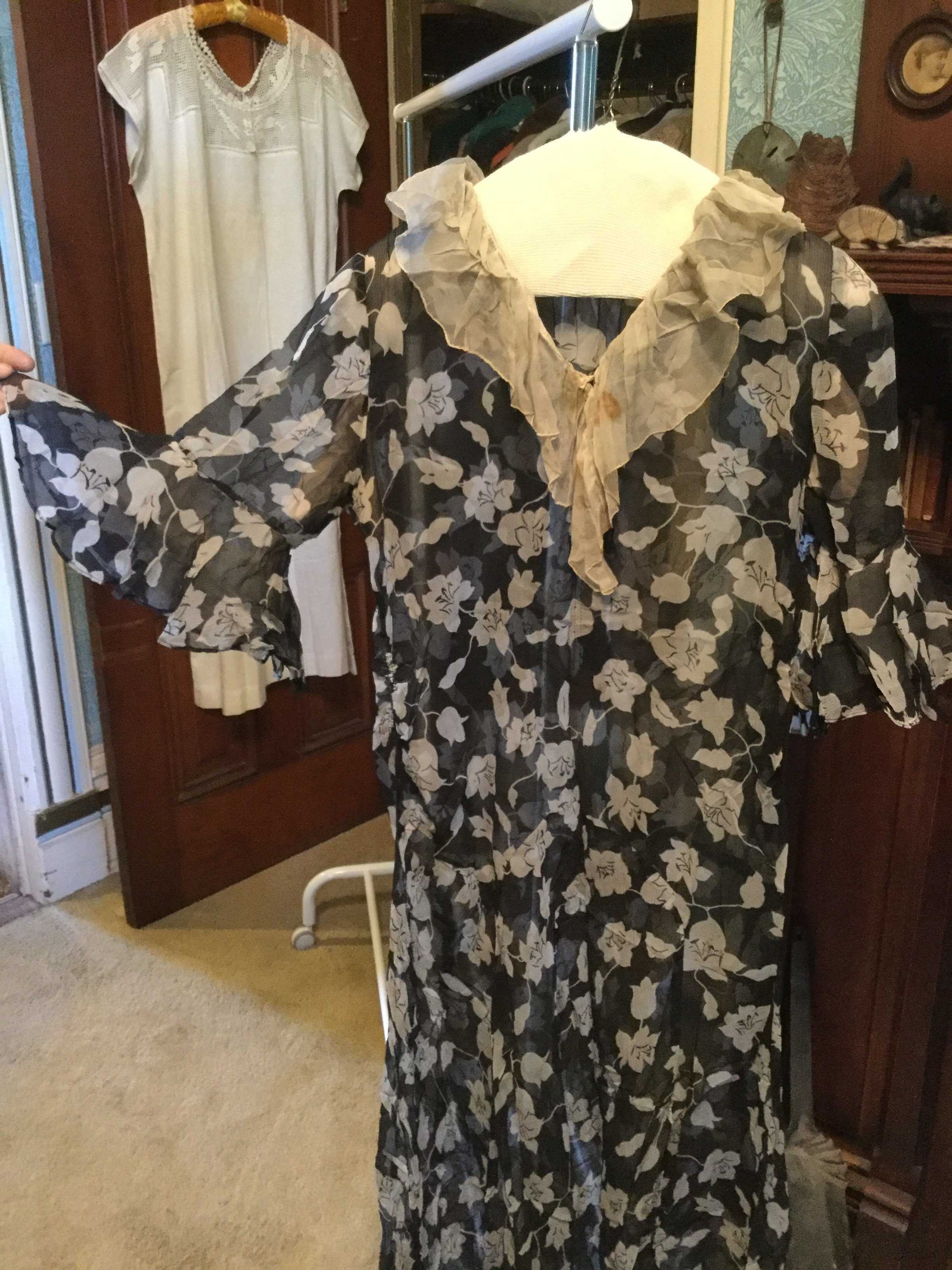 dress; black chiffon/white flowers (silk?); white gathered chiffon collar and inner elbow ruffles; interesting paneled skirt construction, machine sewn (with some visible hand basting), sweat protectors say Gallia, Made exclusively for The White House San Francisco 3; 1920sCollection